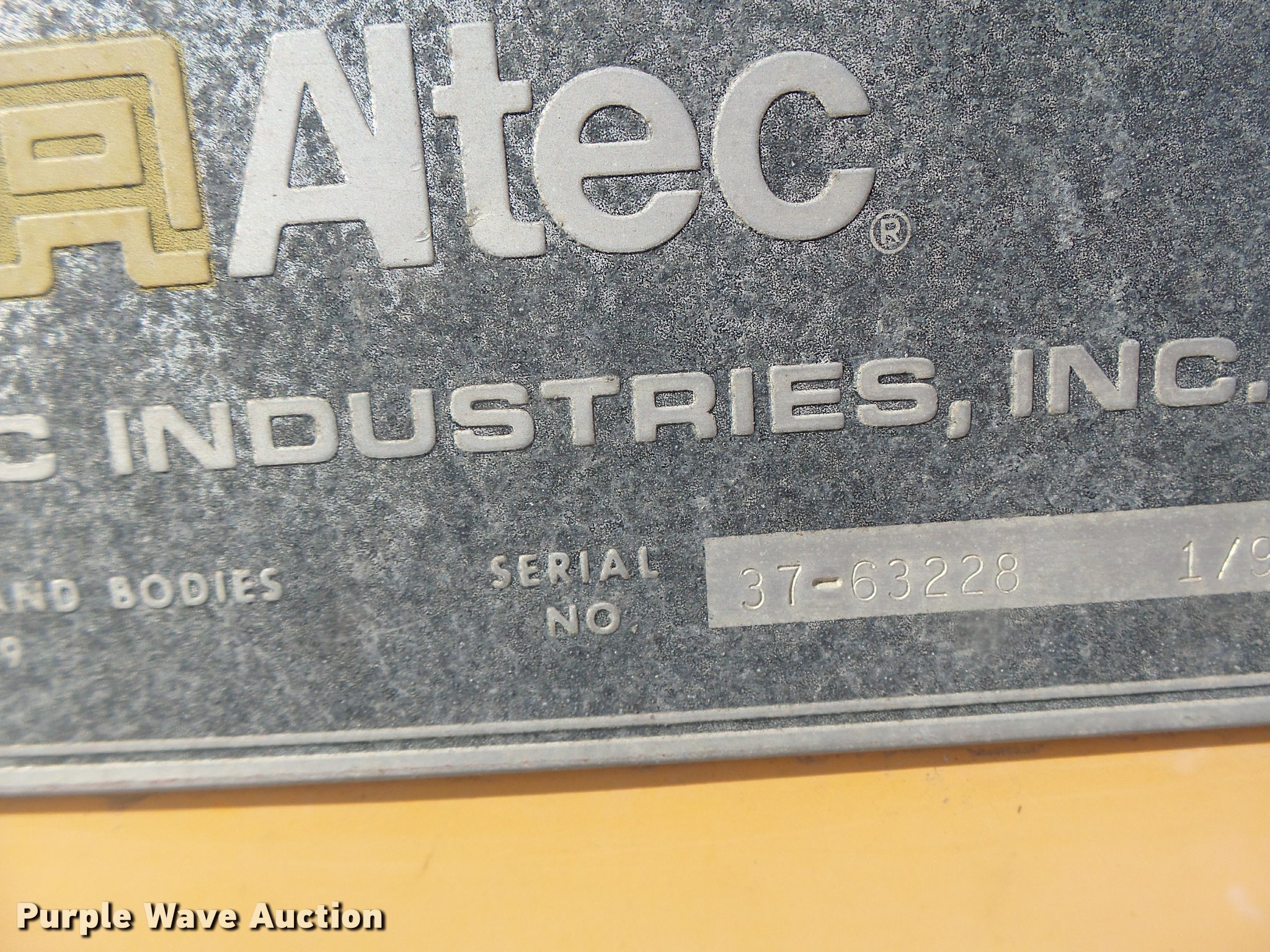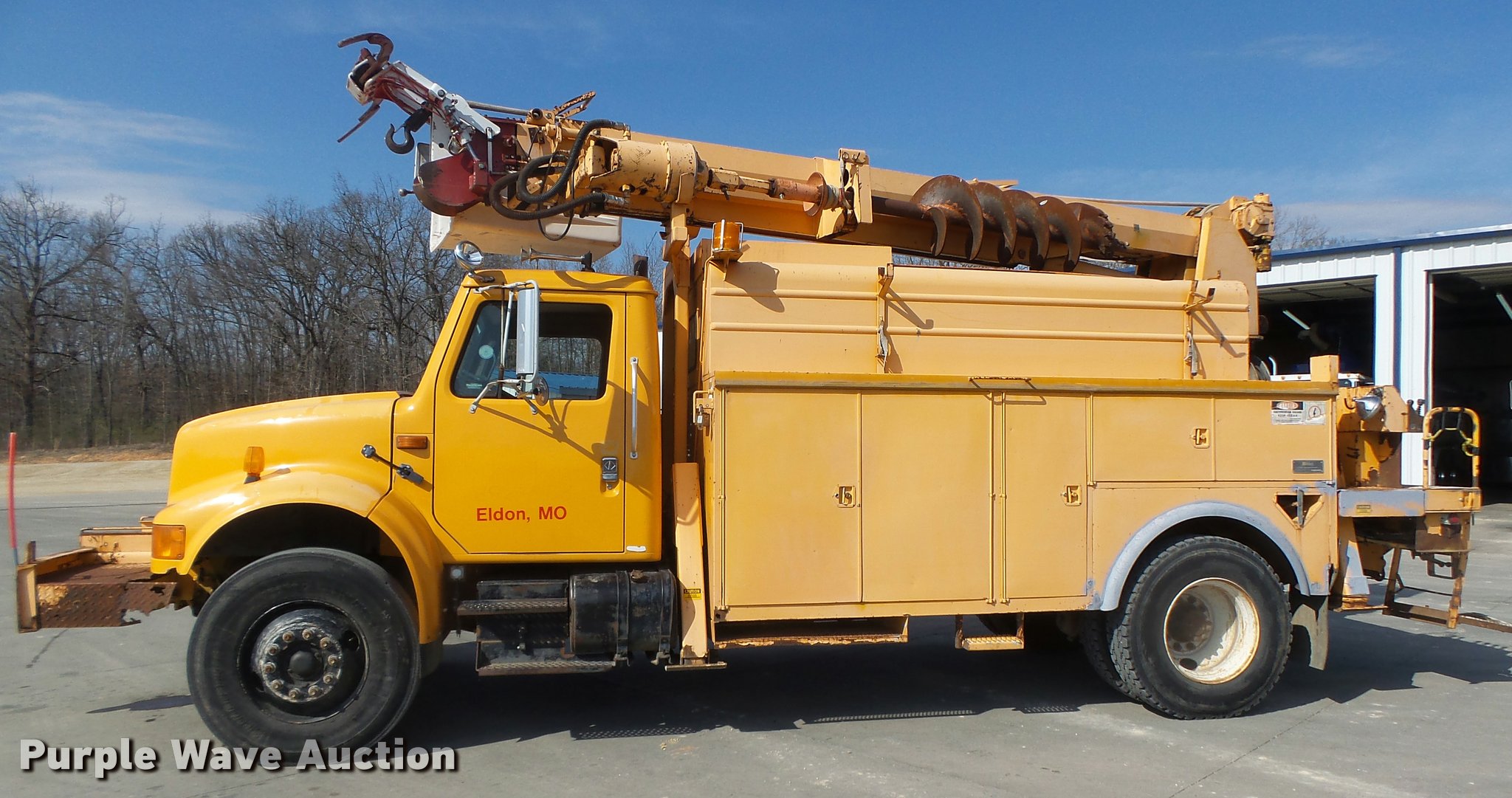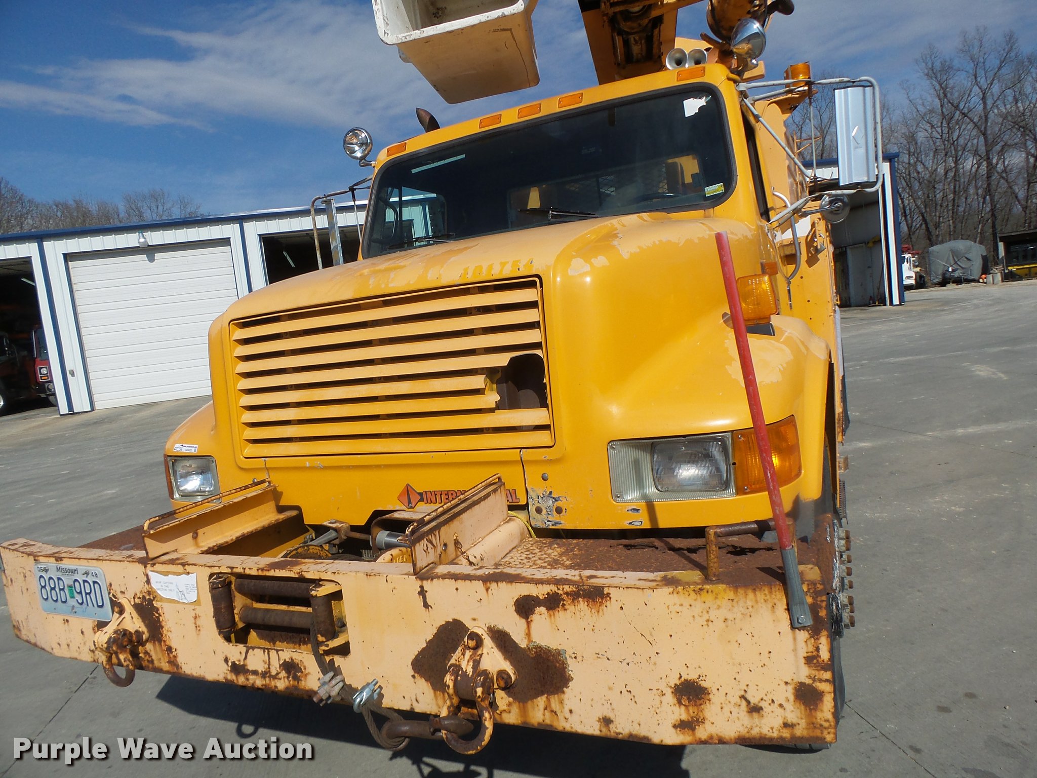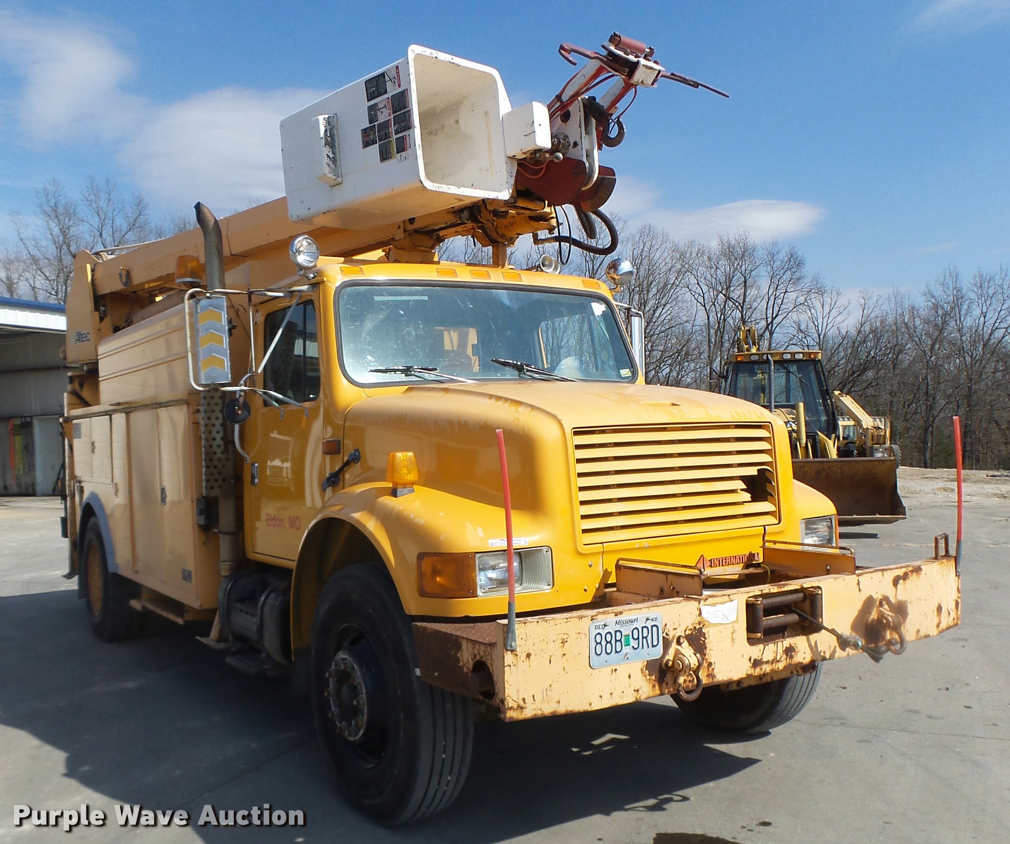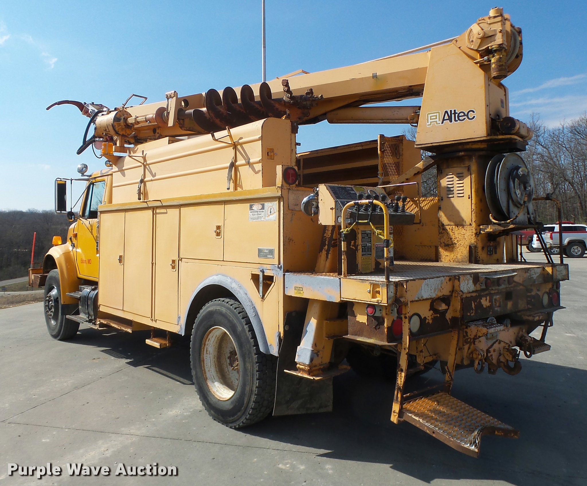 Purple Wave is selling a used Bucket Truck in Missouri. This item is a 1992 International 4900 bucket truck with the following: 103,958 miles on odometer, 9,741 hours on meter, International DT466 7.6L L6 turbo diesel engine, Automatic transmission, Single axle, Heat, Front tow hooks, PTO, Altec service bed, 15'L, Shelving, Serial 3763218, Altec D845T Boom, 45' maximum lift height, 300 lbs maximum lift capacity, Man basket, Ground boom controls, Telescopic boom, 27,000 lbs winch, 18" diameter auger, (4) outriggers, Dual fuel tanks, Pintle hitch, Trailer wiring, Spring suspension, Air brakes, 11R22.5 tires, GVWR 35,000 lbs, Intermittent issues with boom swing and winch