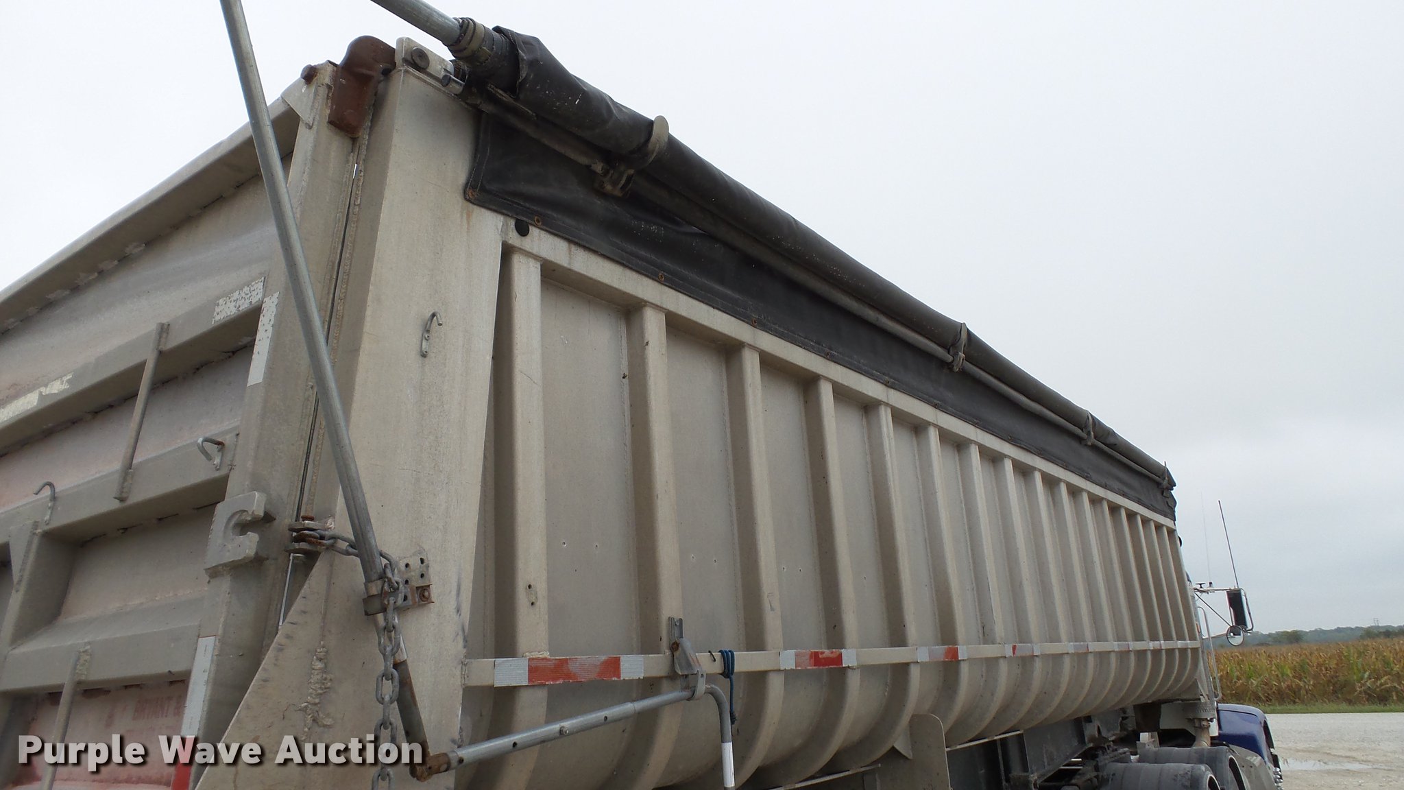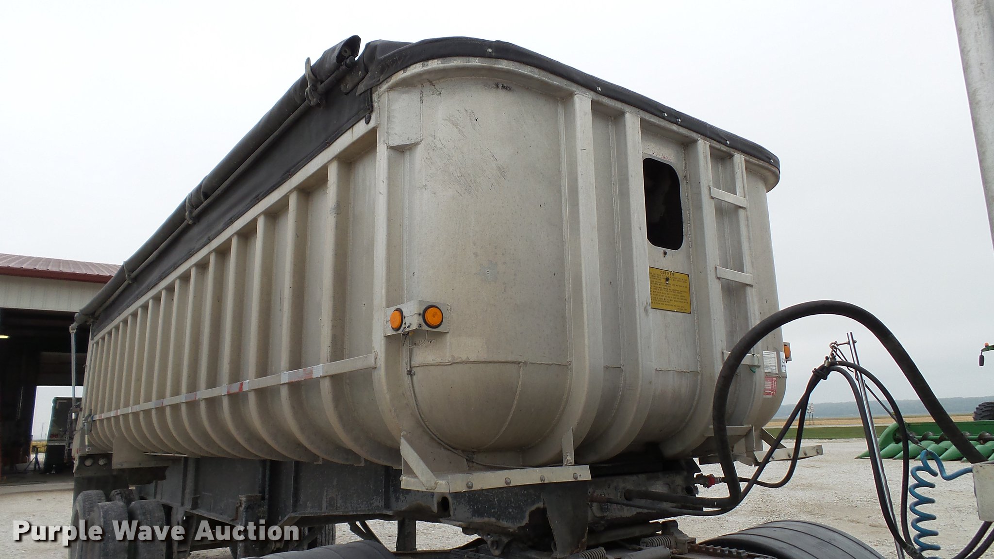 1981 Fruehauf end dump trailer. 27'L x 94"W overall, 4.5' side height, 8" side board height, Aluminum construction, Single hydraulic cylinder, End gate Grain door, Trailer controls, Tarp, Dual leg two speed landing gear, Fifth wheel plate, Tandem axle, Spring suspension, Air brakes, Steel wheels, 295/75R22.5 tires, GVWR 68,000 lbs. Illinois title. 1H4D02622BF005804. 4097 IL-100. Beardstown, IL 62618