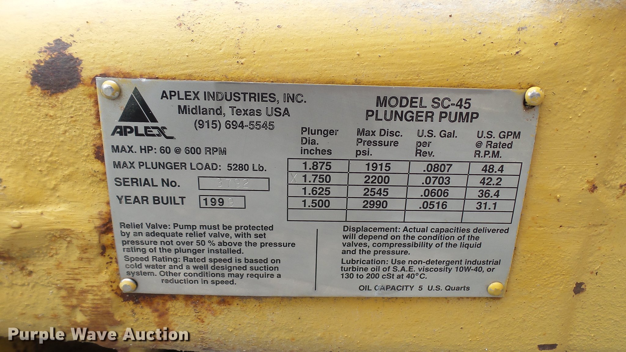 Purple Wave is selling a used Pump in Illinois. This item is a 1999 Aplex SC-45 plunger pump with the following: 30"L x 14"W, (3) plungers, 1.75" diameter plunger, 2,200 psi discharge pressure, 42.2 gallon per minute capacity, Serial 3792