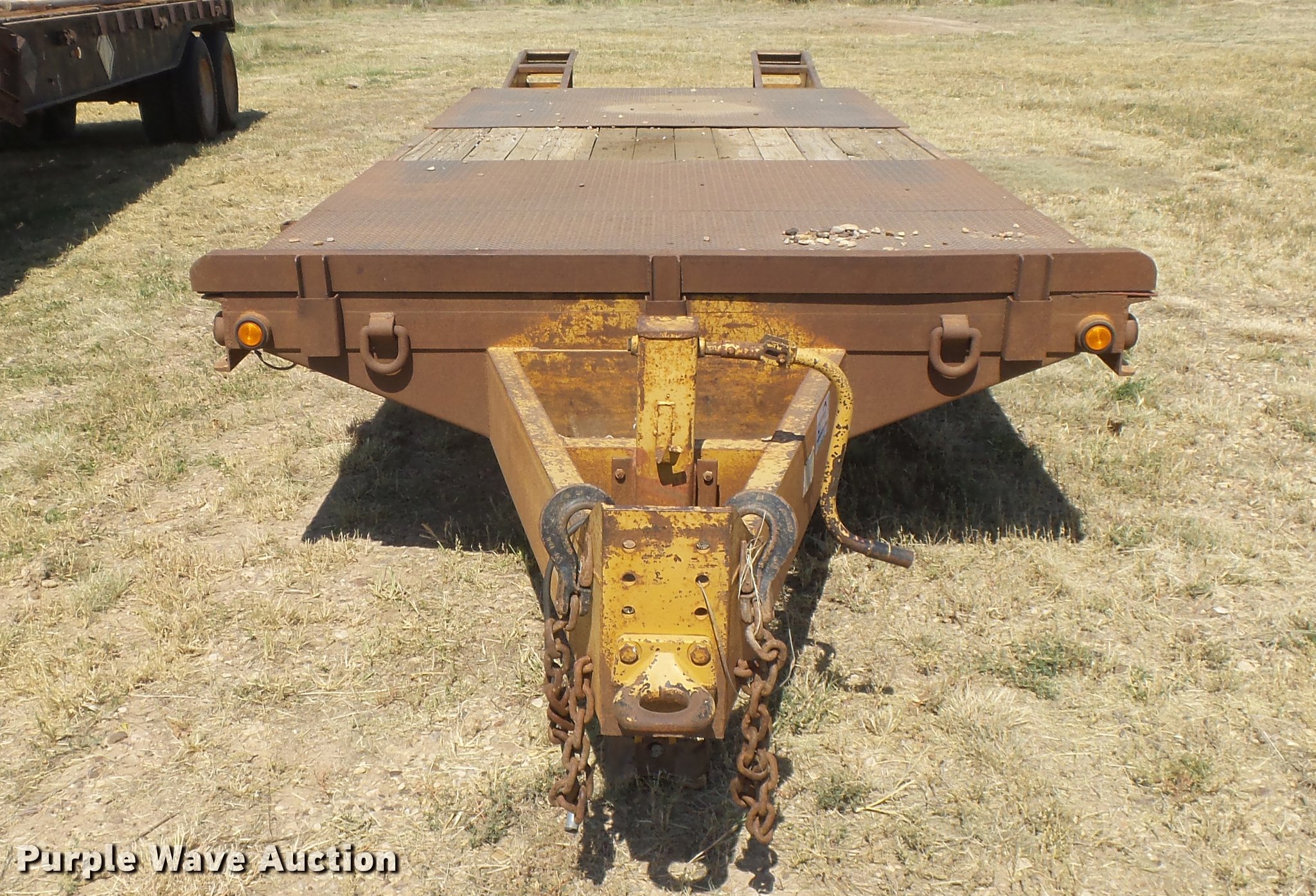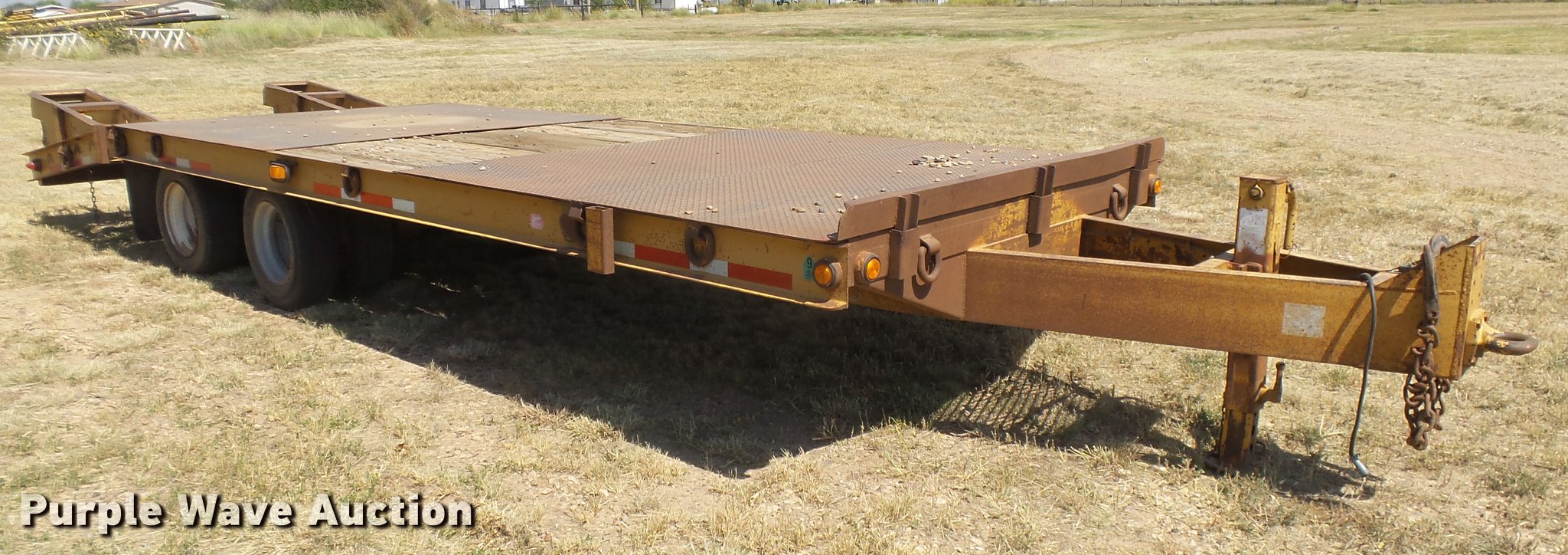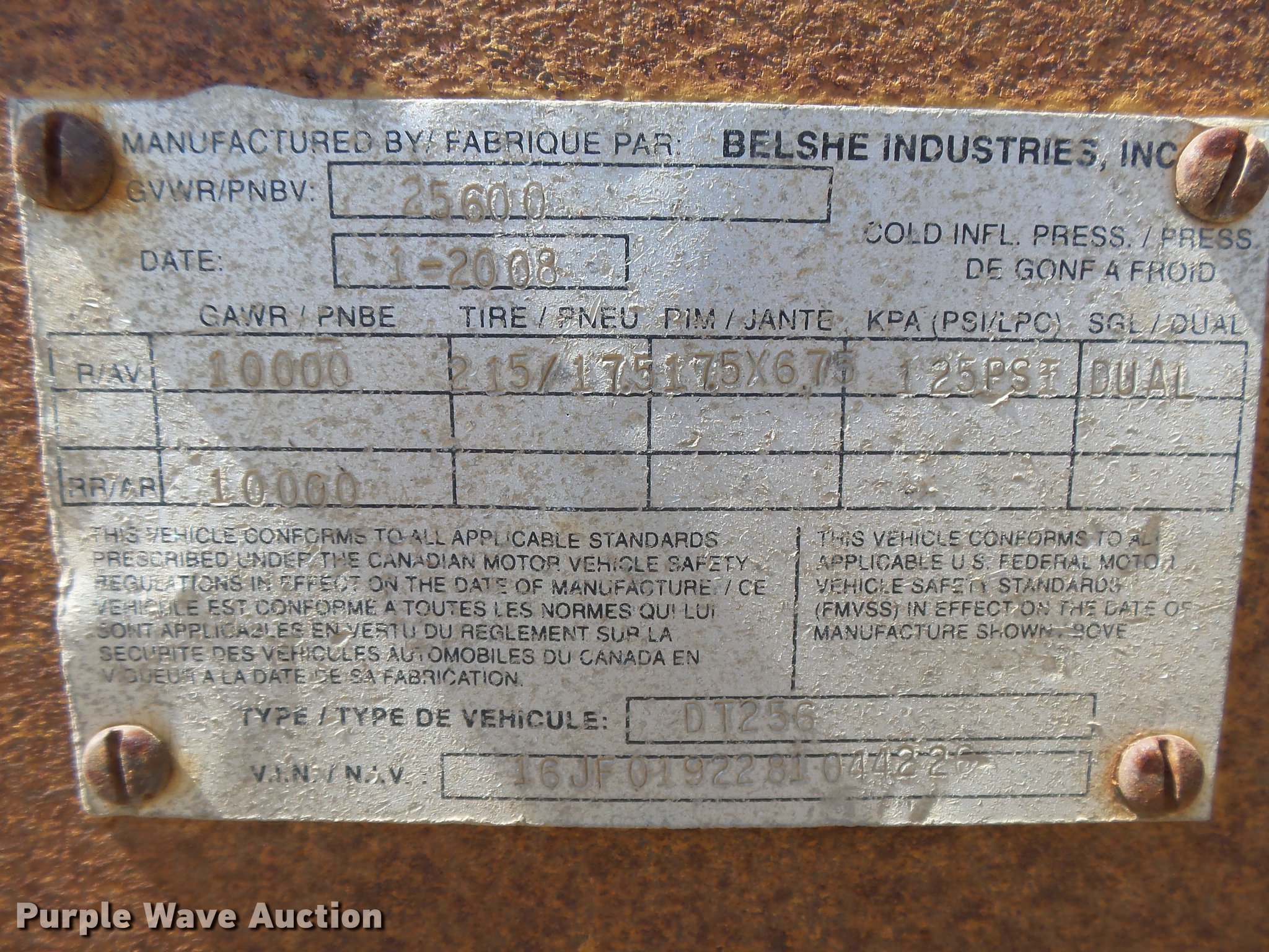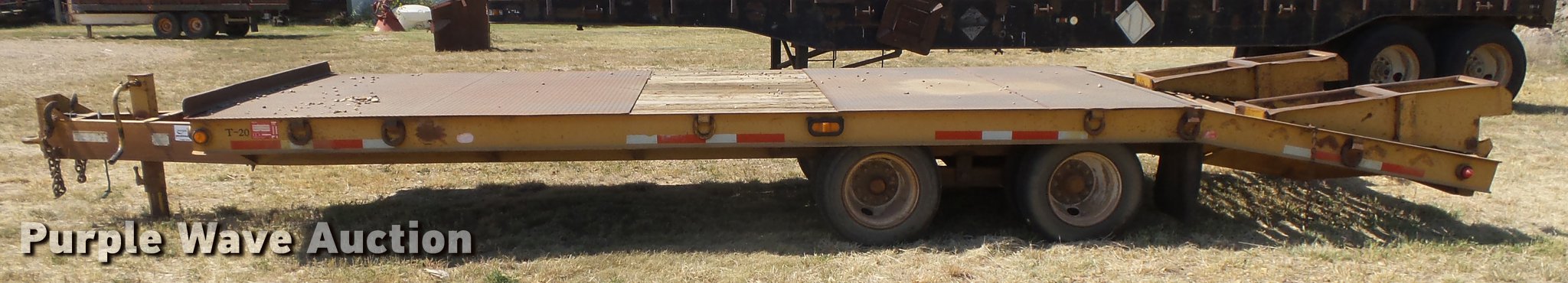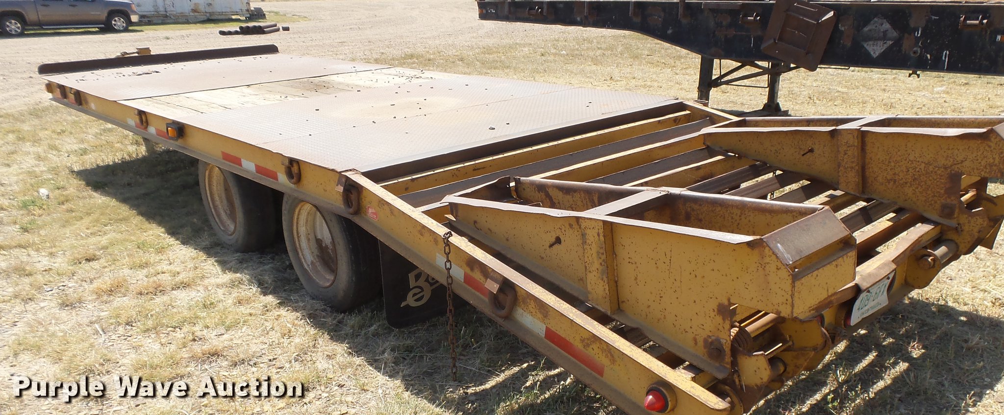 Purple Wave is selling a used Equip. Trailer in Oklahoma. This item is a 2008 Belshe DT256 equipment trailer with the following: 30' overall length, 25'L x 96"W deck, 34" floor height, 6'L beavertail, 5' ramps, Steel/wood deck, D-ring tie downs, Single leg landing gear, Pintle hitch, Spring suspension, Electric brakes, Steel wheels, Dynatrac 215/75R17.5 tires, GVWR 25,600 lbs, GAWR 10,000 lbs
