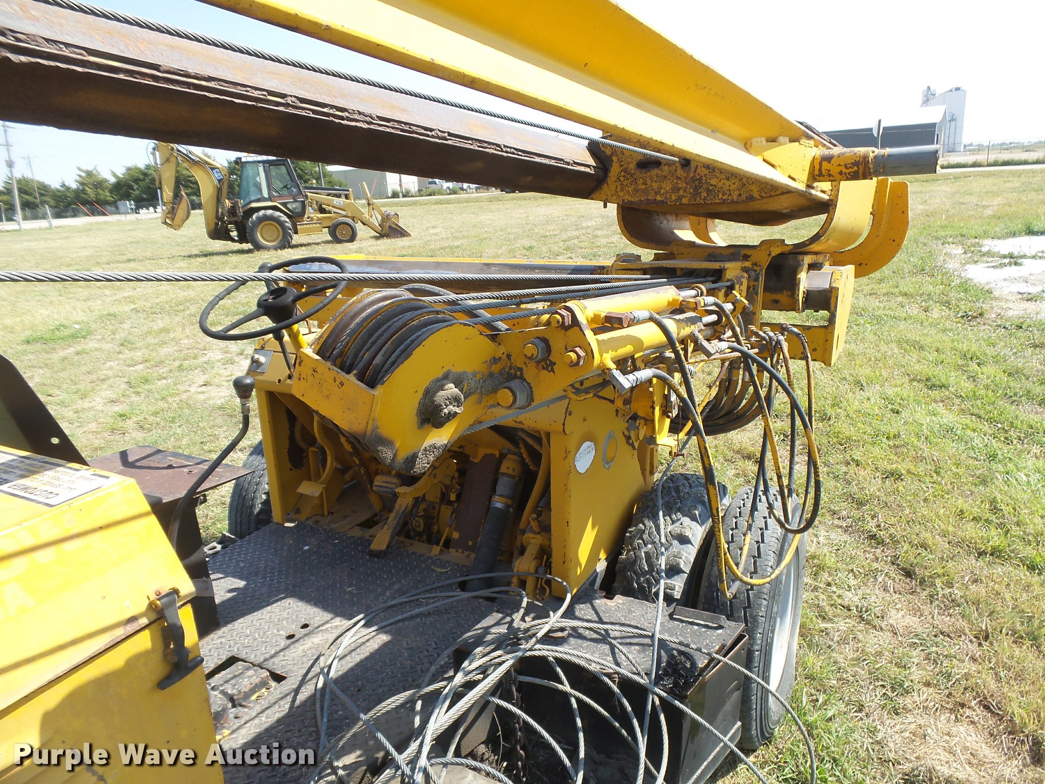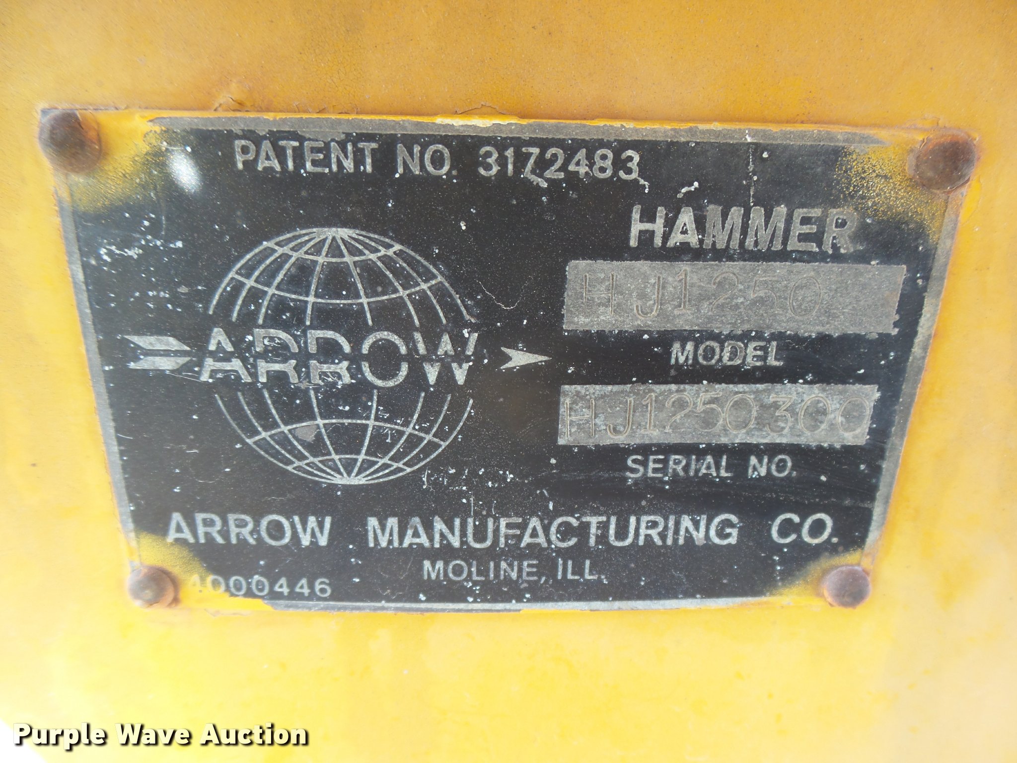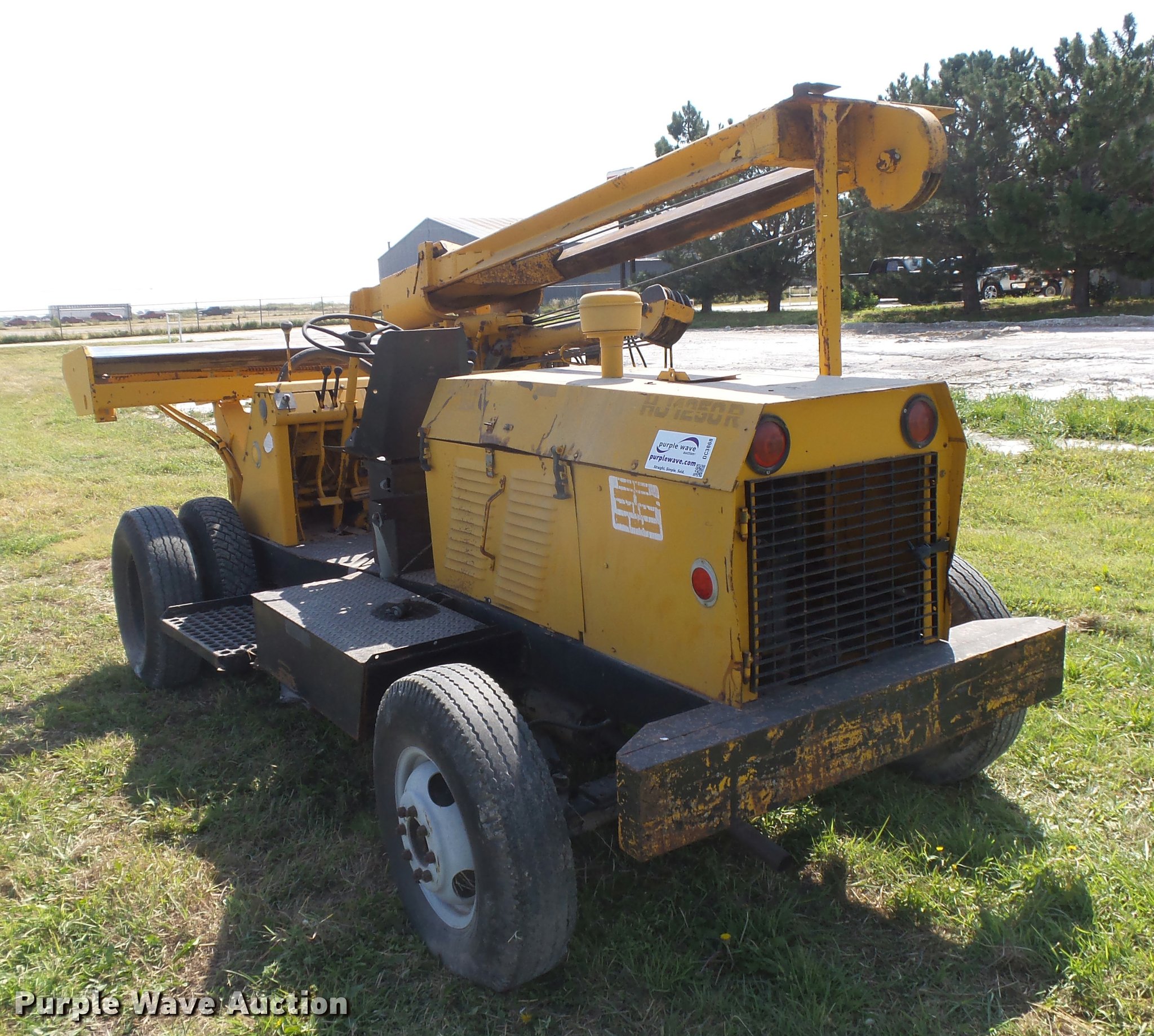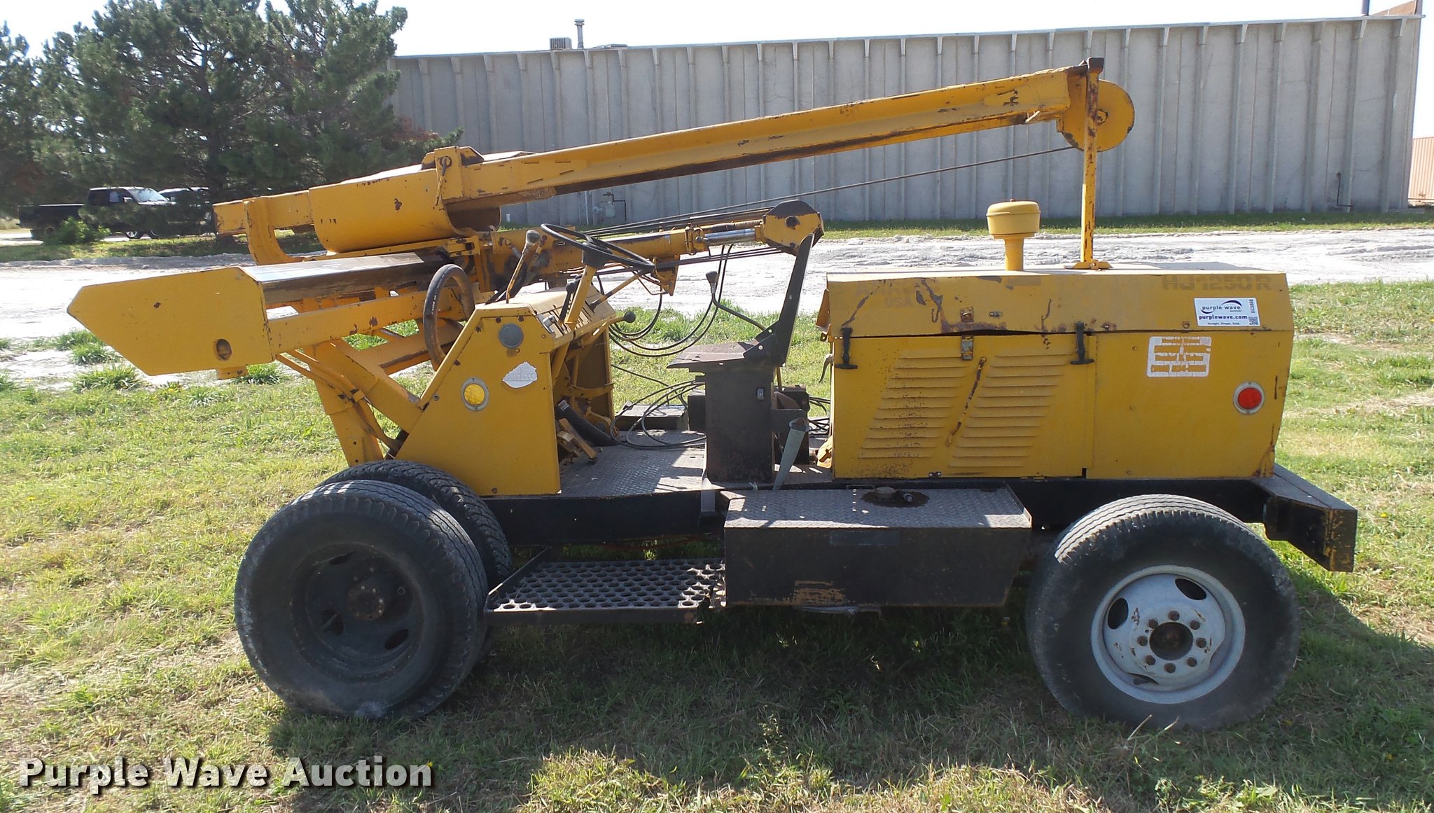 Purple Wave is selling a used Breaker or Hammer in Kansas. This item is a Arrow HJ1250R drop hammer with the following: Unknown hours on meter, John Deere 219DF01 four cylinder diesel engine, Serial 487444T, Manual transmission, 4F-1R gears, Rear steer, 12'H x 7'4"W mast, Additional cable, Side shift, Tilt, 7.50-16 tires, Welds, Hydraulic leaks, Non-operational brakes, Hammer frame cracked, Serial HJ1250300