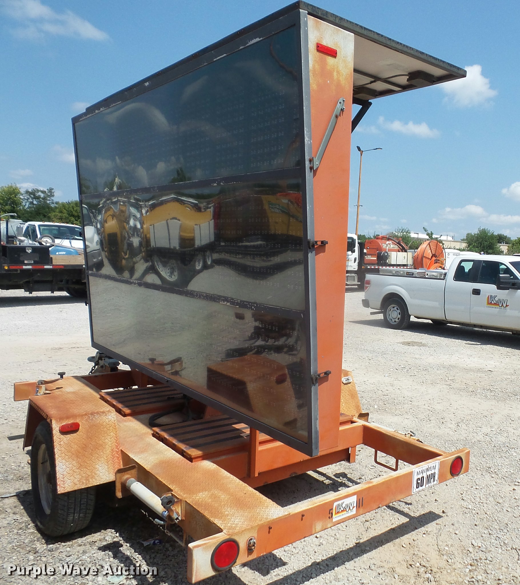 2001 Ver-Mac PCMS 1210 message board trailer. 11'L x 6.5' message board, Solar panel, (4) leveling jacks, Pintle hitch, Surge brakes, 215/75R15 tires, Serial 01-02553. Transfer of ownership documentation will be a bill of sale. K&W Underground, Inc.. 15608 S Keeler Terrace. Olathe, KS 66062