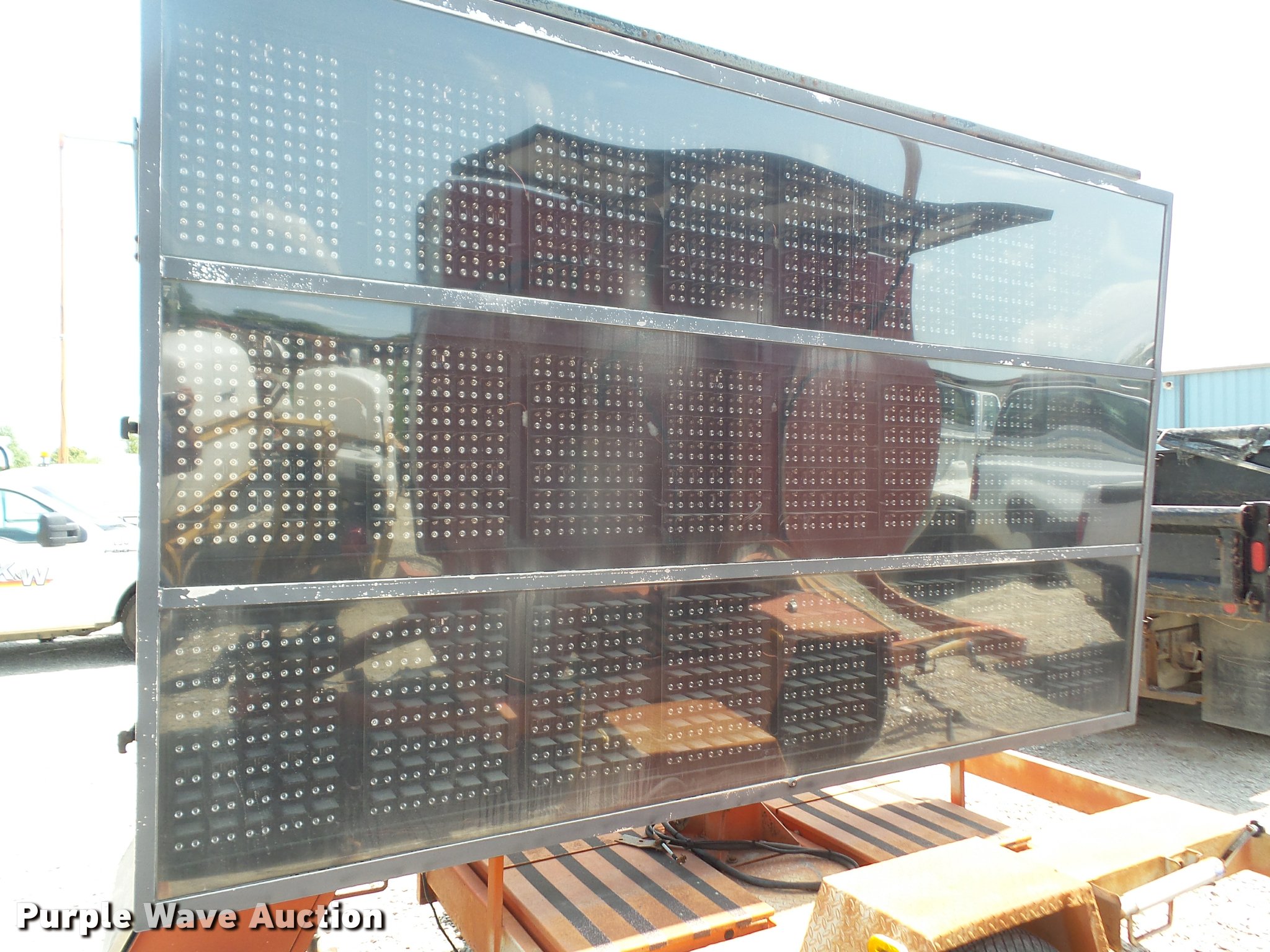Purple Wave is selling a used Road Safety Equip. in Kansas. This item is a 2001 Ver-Mac PCMS 1210 message board trailer with the following: 11'L x 6.5' message board, Solar panel, (4) leveling jacks, Pintle hitch, Surge brakes, 215/75R15 tires, Serial 01-02553