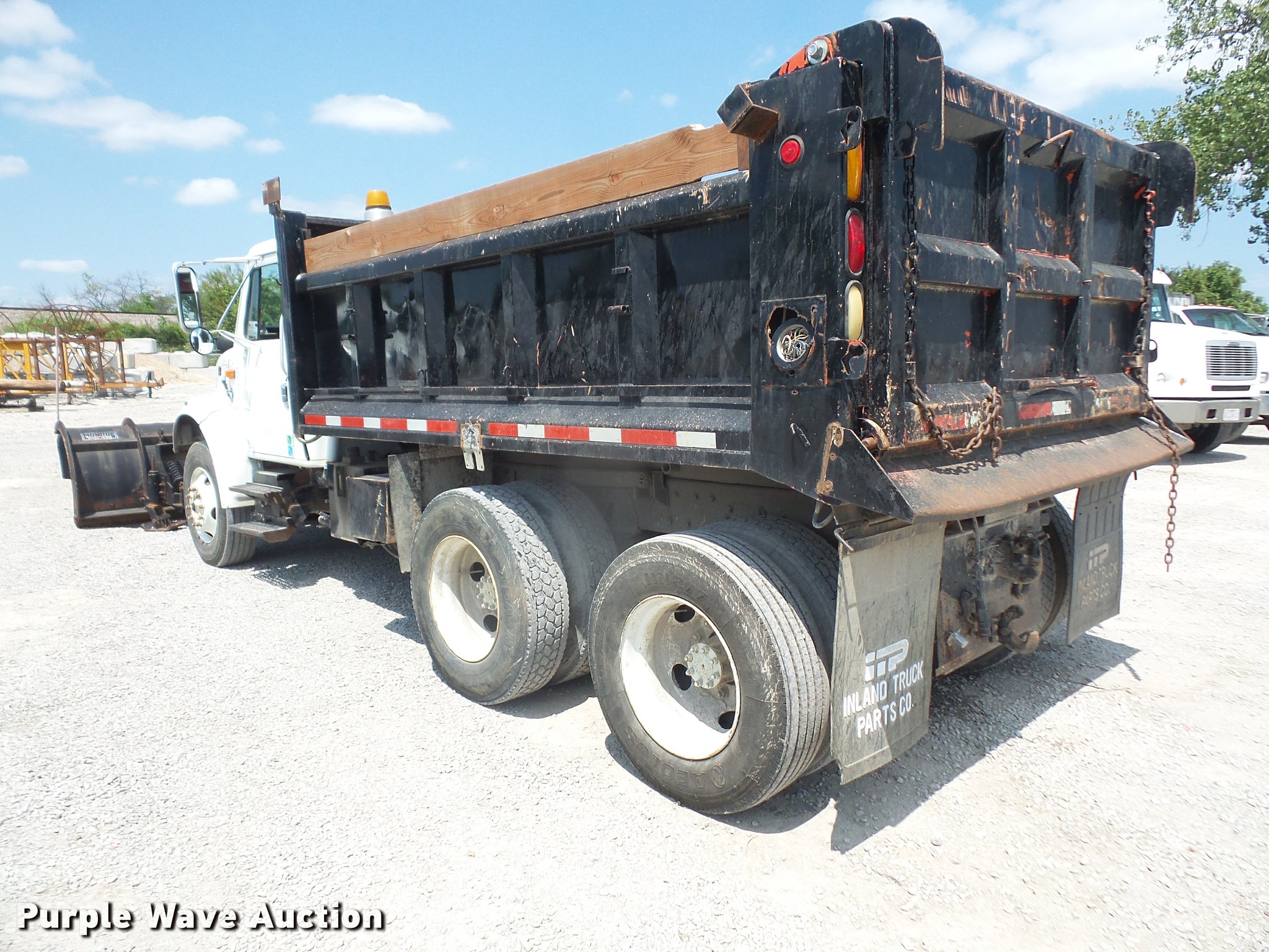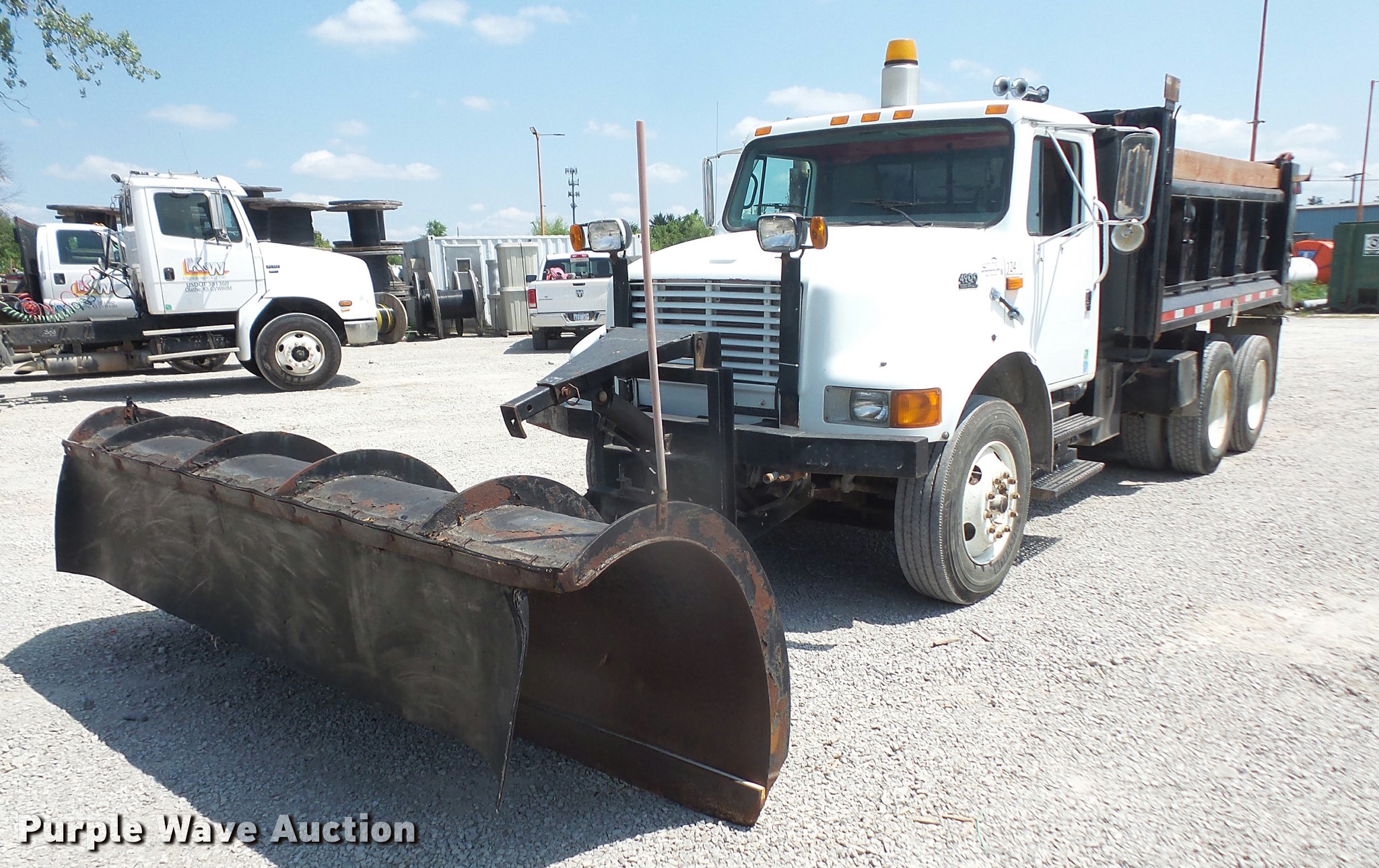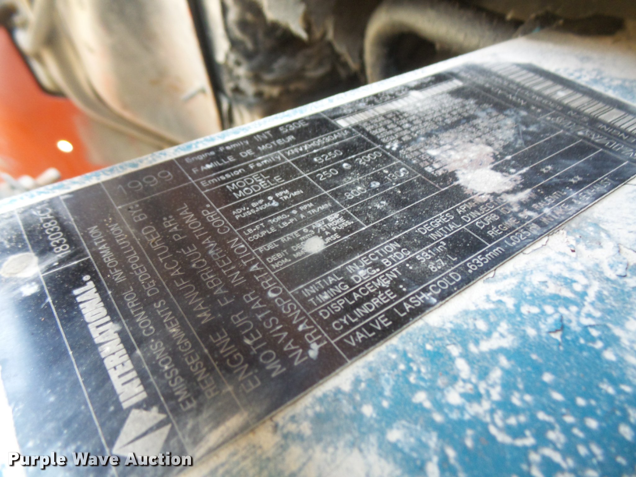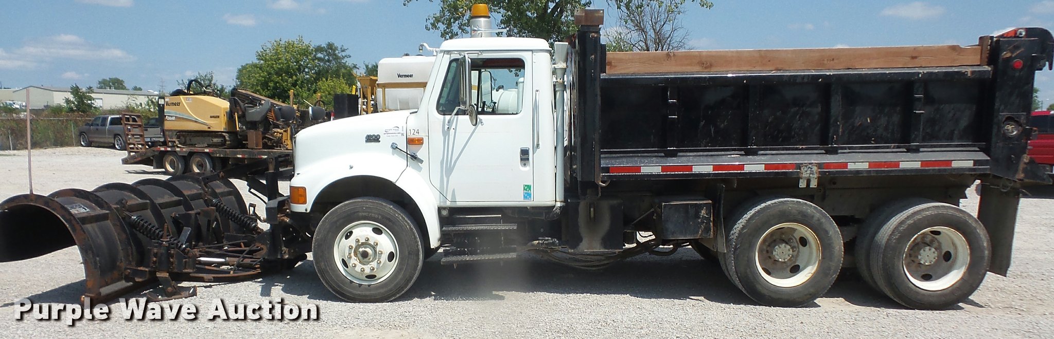 Purple Wave is selling a used Construction Dump Truck in Kansas. This item is a 1999 International 4900 dump truck with the following: 177,291 miles on odometer, 14,998 hours on meter, International DT530E 8.7L L6 turbo diesel engine, 250 HP, Automatic transmission, Tandem axle, Inter-axle differential lock, Heat, Cruise, AM/FM/weatherband, Air suspension seat, Front mounted PTO, 13'L x 96"W steel dump bed, 32" side height, 8" side board height, Single ram hoist, Manual operated end gate, Monroe 11'W snow plow, Dual fuel tanks, Pintle hitch, Spring over walking beam suspension, Air brakes, 176" wheelbase, 295/75R22.5 tires, GVWR 47,220 lbs, FAWR 13,220 lbs, IAWR 17,000 lbs, RAWR 17,000 lbs, Unit# 124