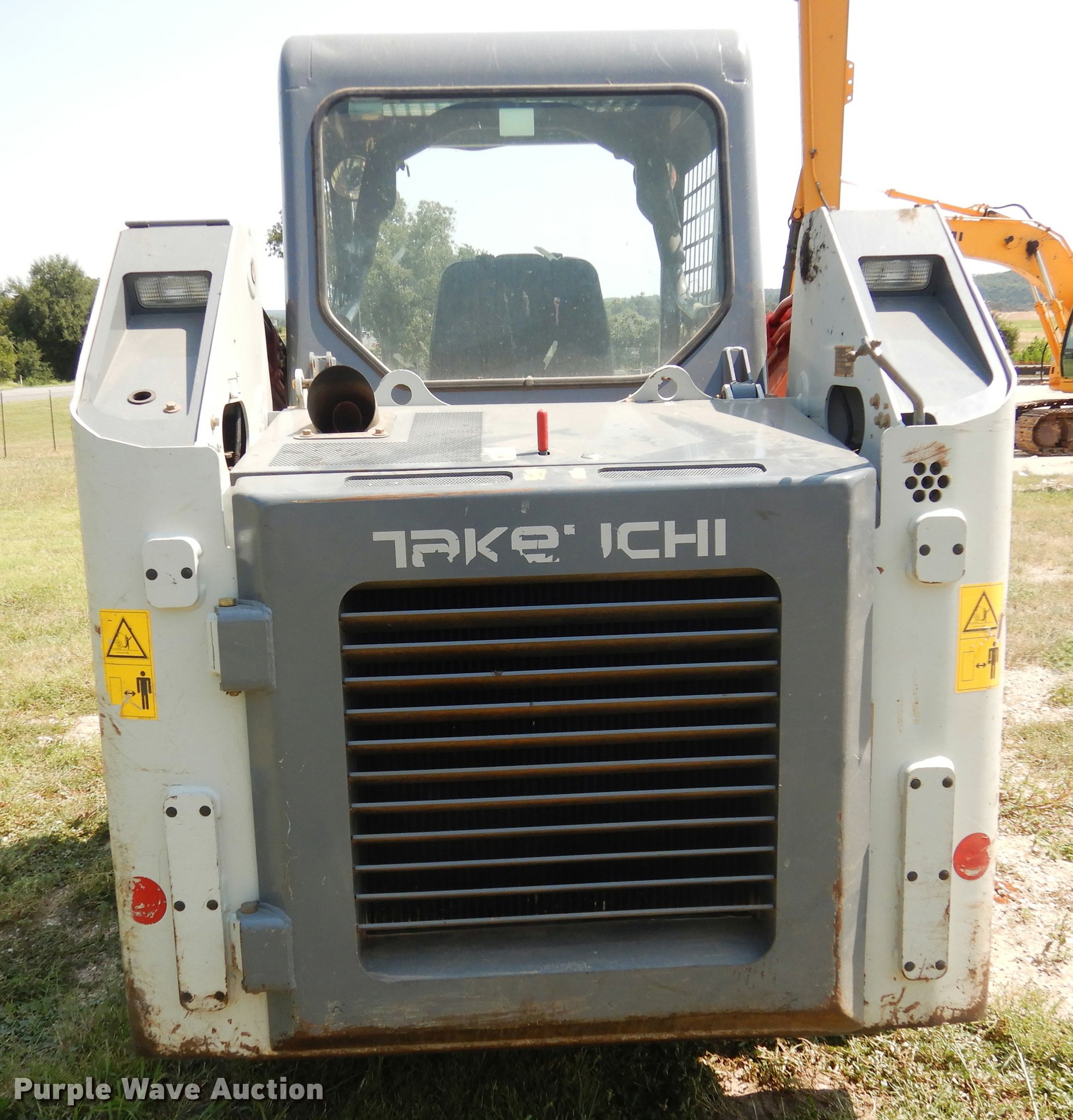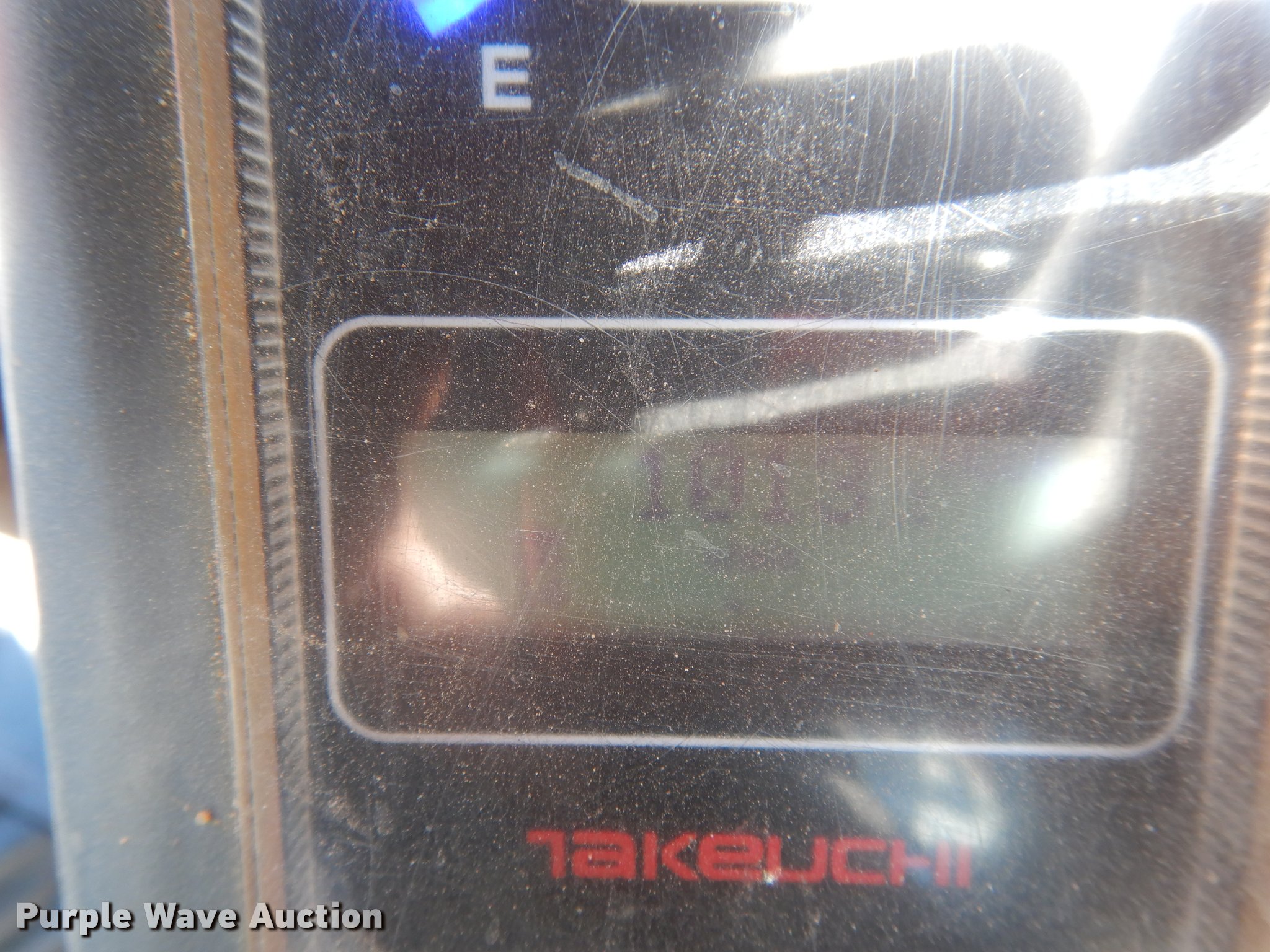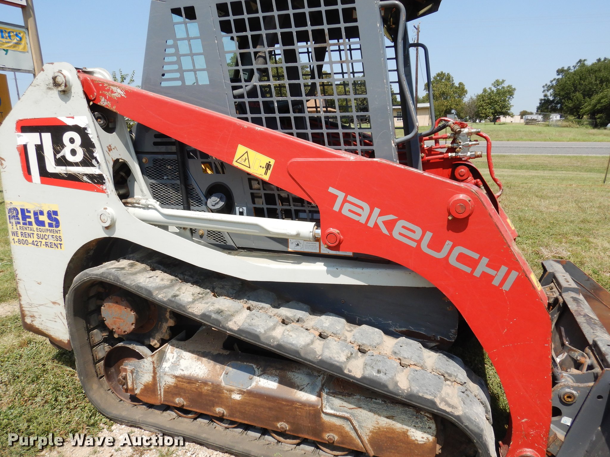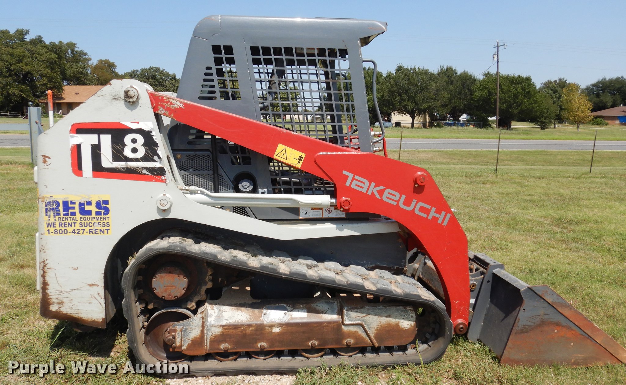 Purple Wave is selling a used Tracked Skid Steer Loader in Texas. This item is a Takeuchi TL8 skid steer with the following: 1,013 hours on meter, Kubota V3307-CR-T-EF02 3.3L diesel engine, 54.6 kW, Two speed hydrostatic transmission, Open station/canopy, Joystick controls, Spring suspension seat, Alitec HDLP73 72"W bucket, Auxiliary hydraulics, 15.5"W tracks, Serial 200802958