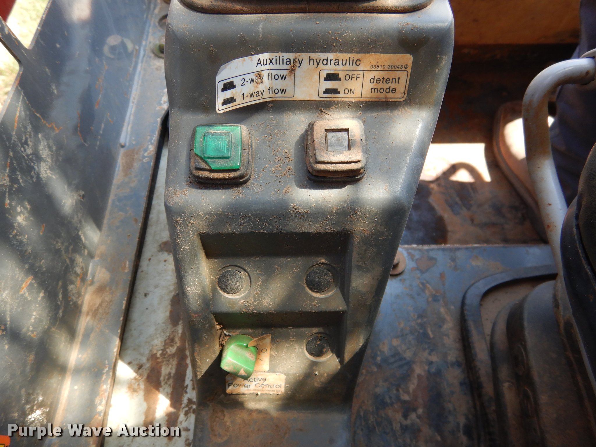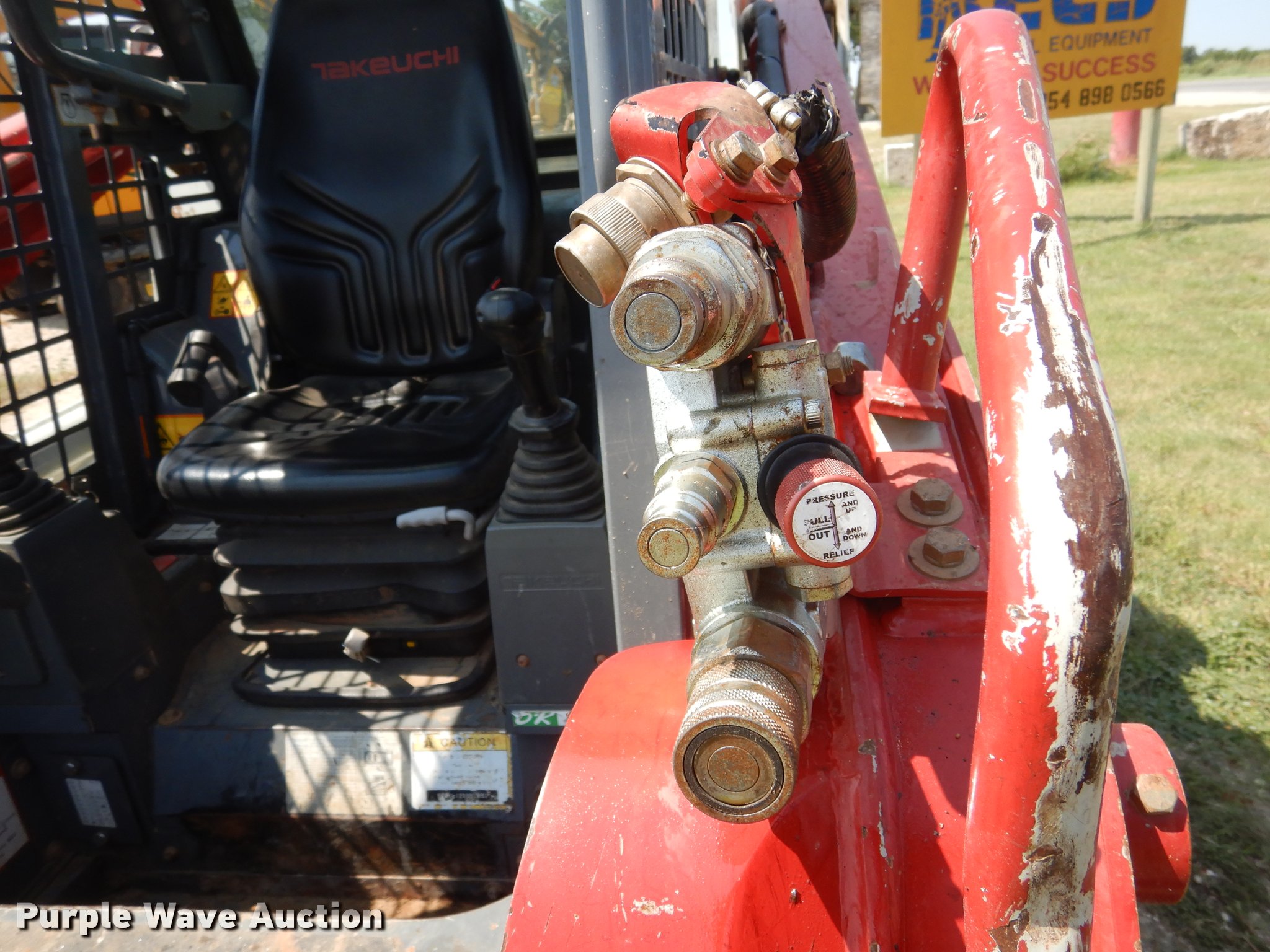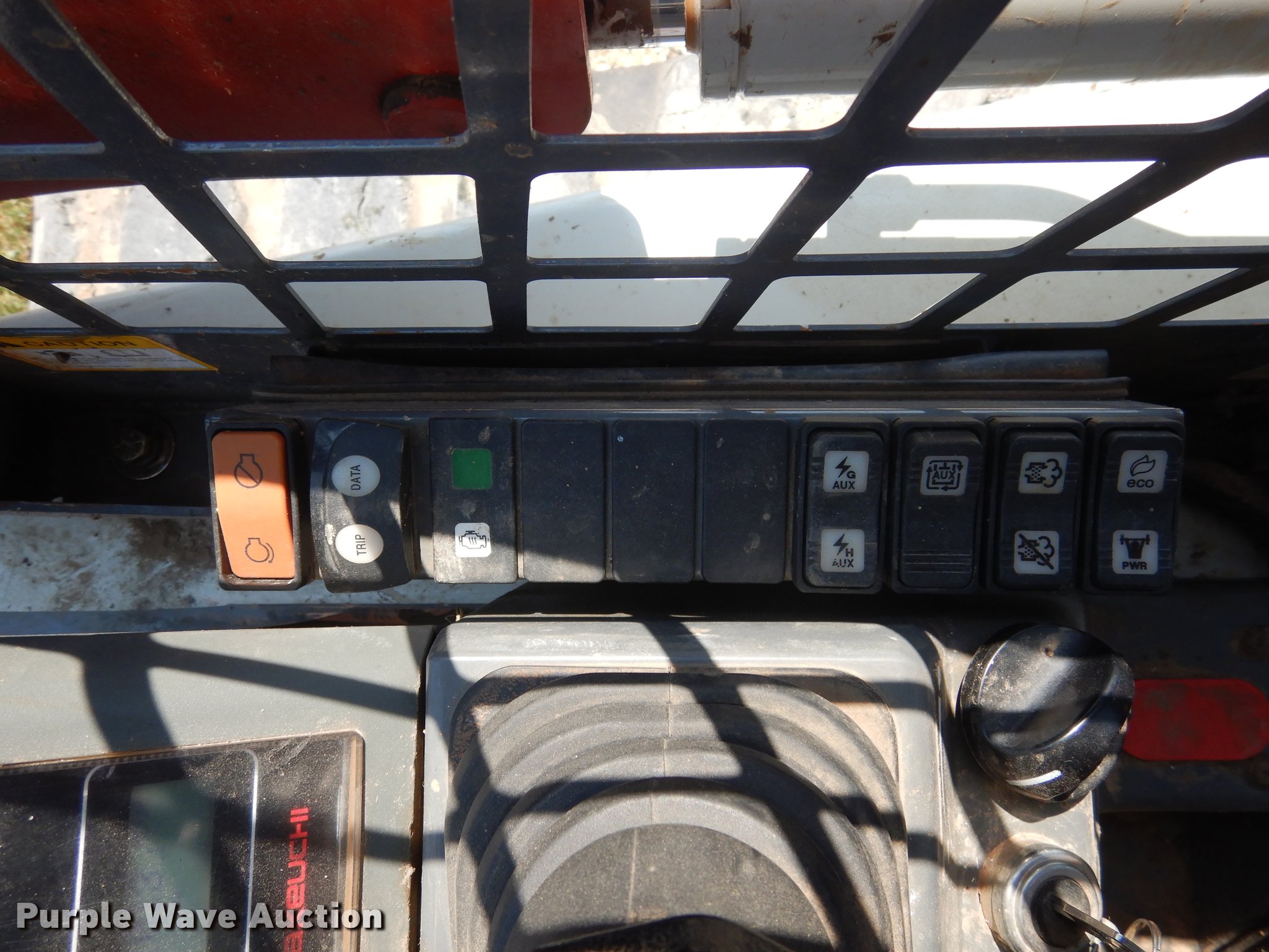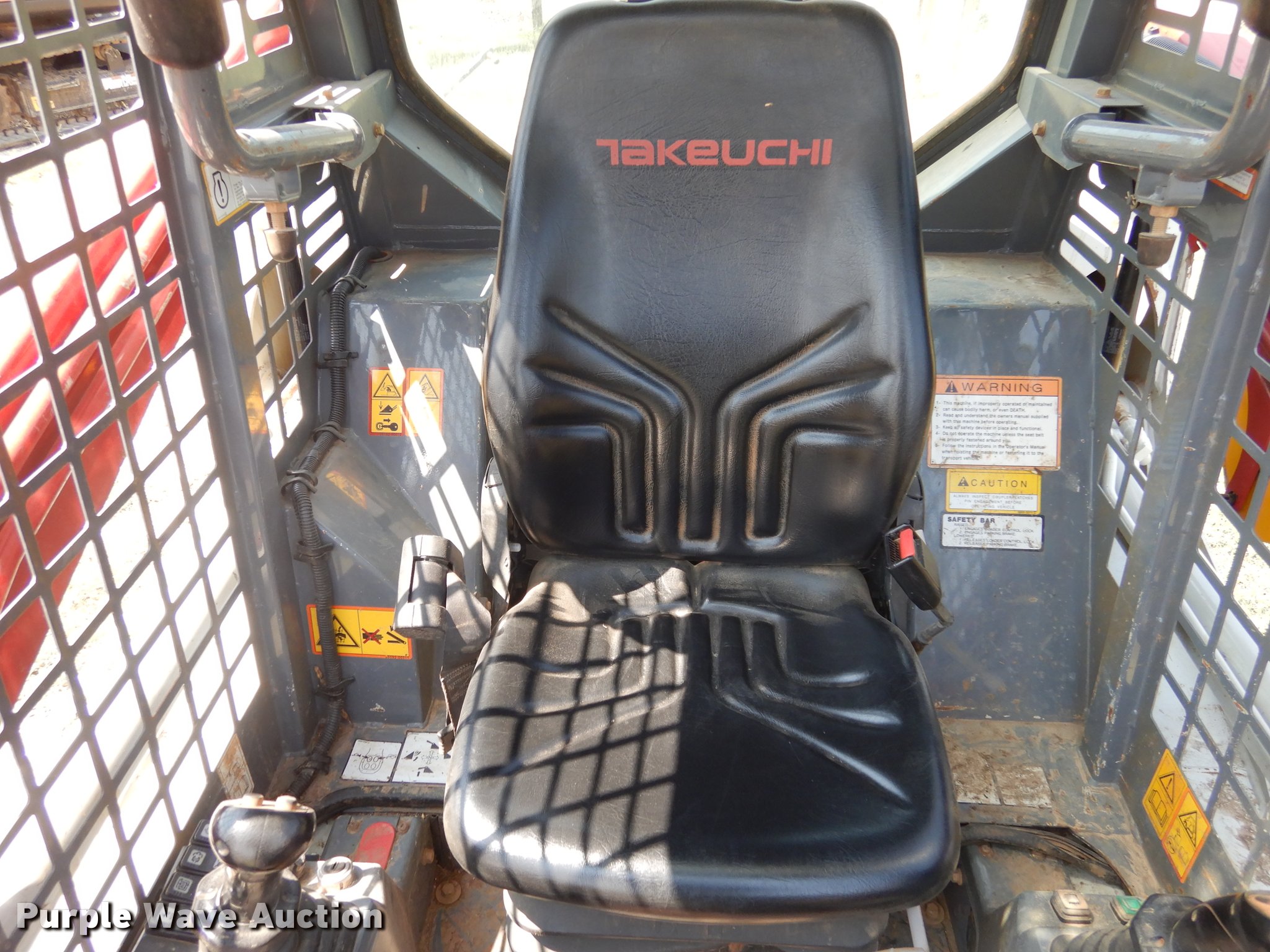 Purple Wave is selling a used Tracked Skid Steer Loader in Texas. This item is a Takeuchi TL8 skid steer with the following: 1,013 hours on meter, Kubota V3307-CR-T-EF02 3.3L diesel engine, 54.6 kW, Two speed hydrostatic transmission, Open station/canopy, Joystick controls, Spring suspension seat, Alitec HDLP73 72"W bucket, Auxiliary hydraulics, 15.5"W tracks, Serial 200802958