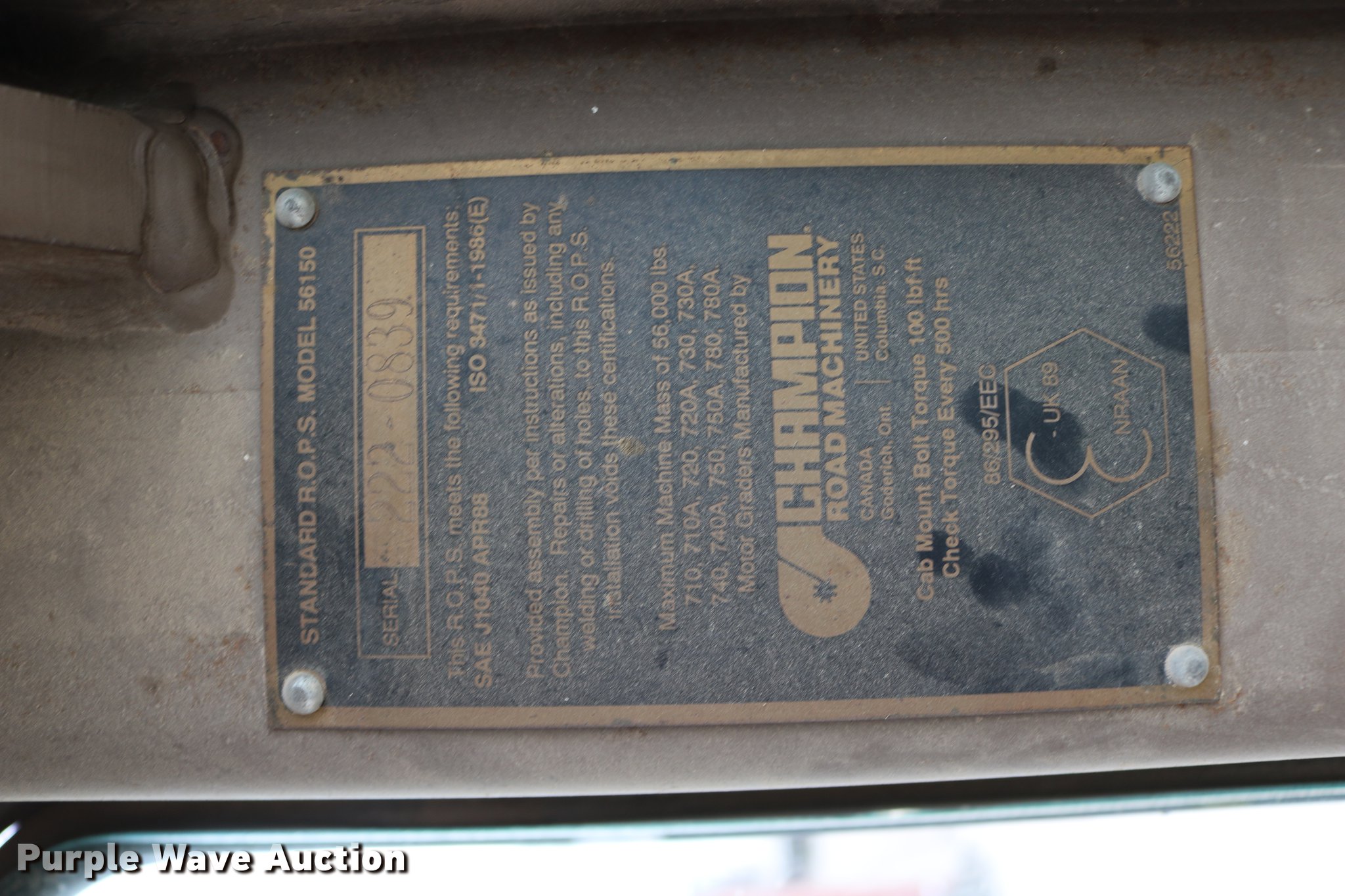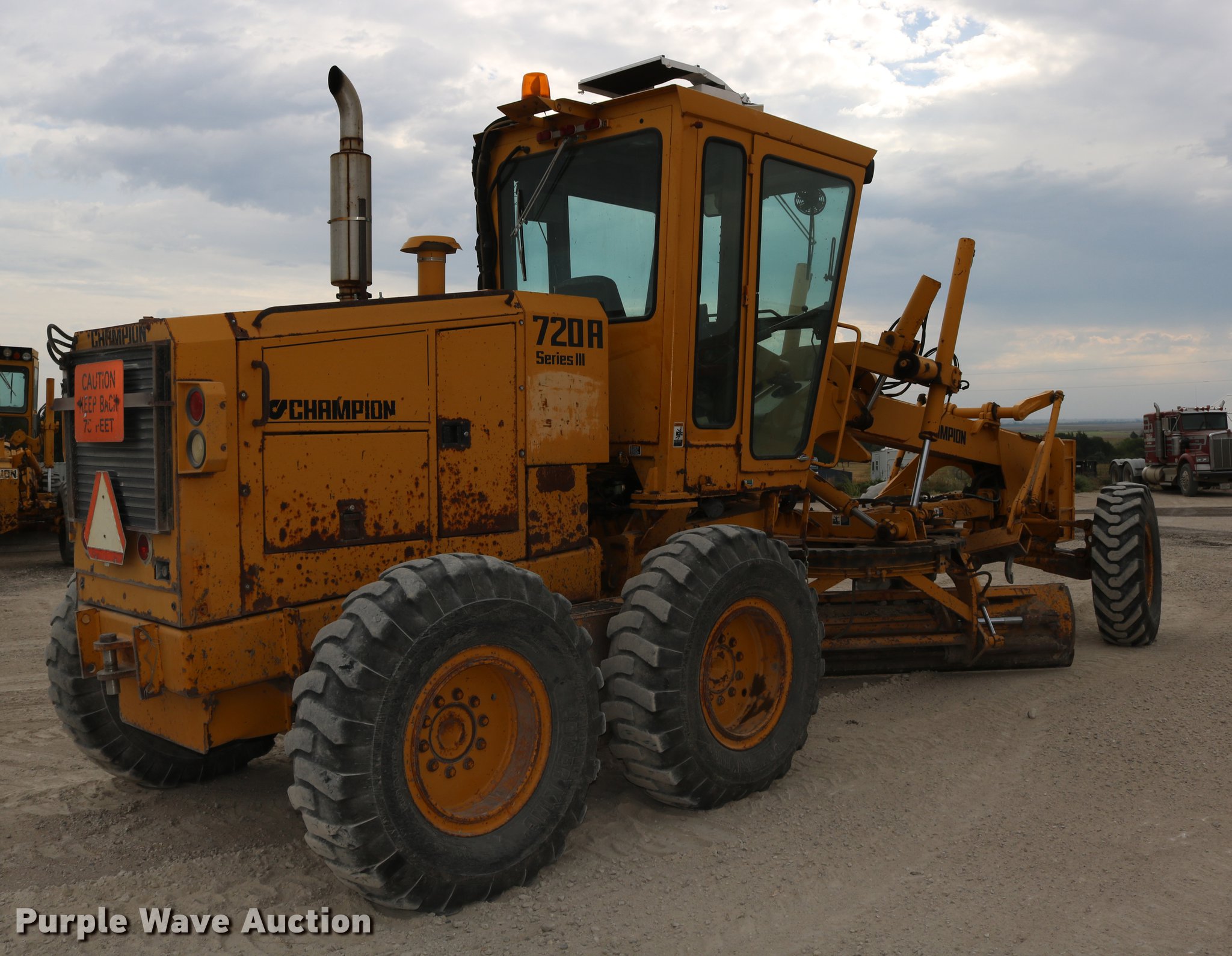 Purple Wave is selling a used Motor Grader in Kansas. This item is a 1992 Champion 720A motor grader with the following: 4,417 hours on meter, Cummins 412 8.3L six cylinder turbo diesel engine, Serial 44695533, Powershift transmission, 8F-4R gears, Differential lock, EROPS, AC and heat, AM/FM, Suspension seat, Nine control valves, Front work lights, 12'W moldboard, Tip control, Side shift, Mid mounted scarifier, (11) teeth, Front mounted push block, 14.00-24 tires, Non-operational AC, AC will be repaired prior to auction, Serial 720A187131922109