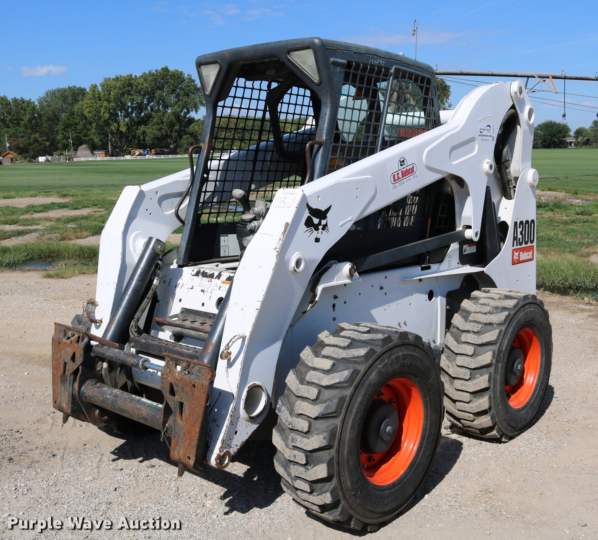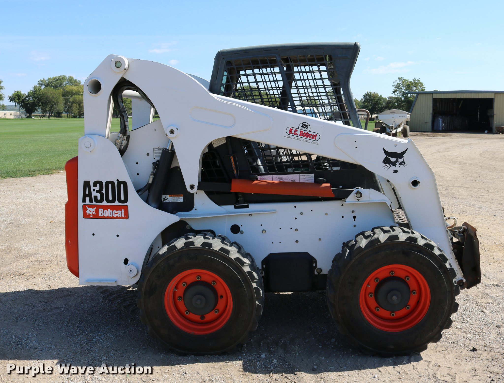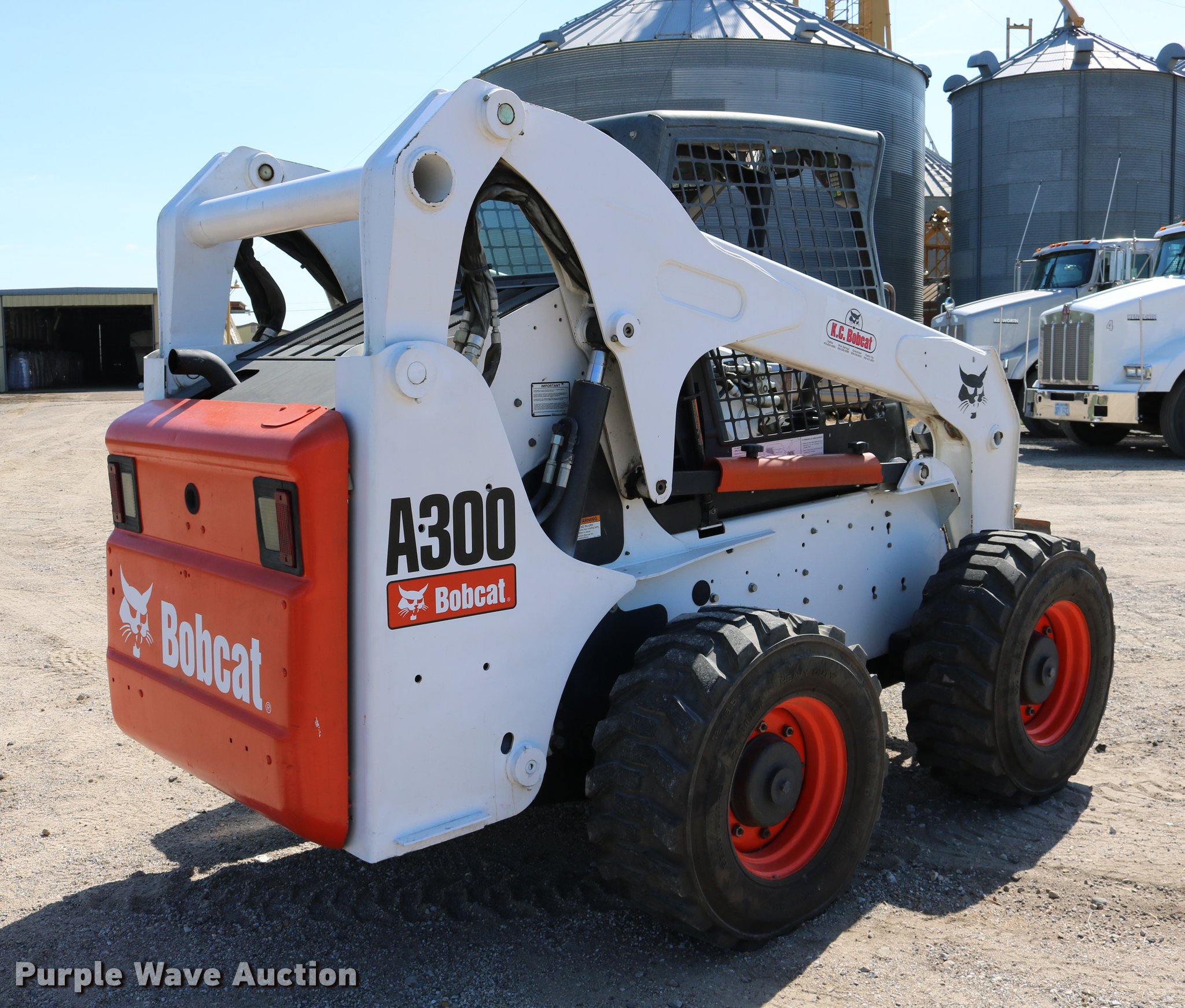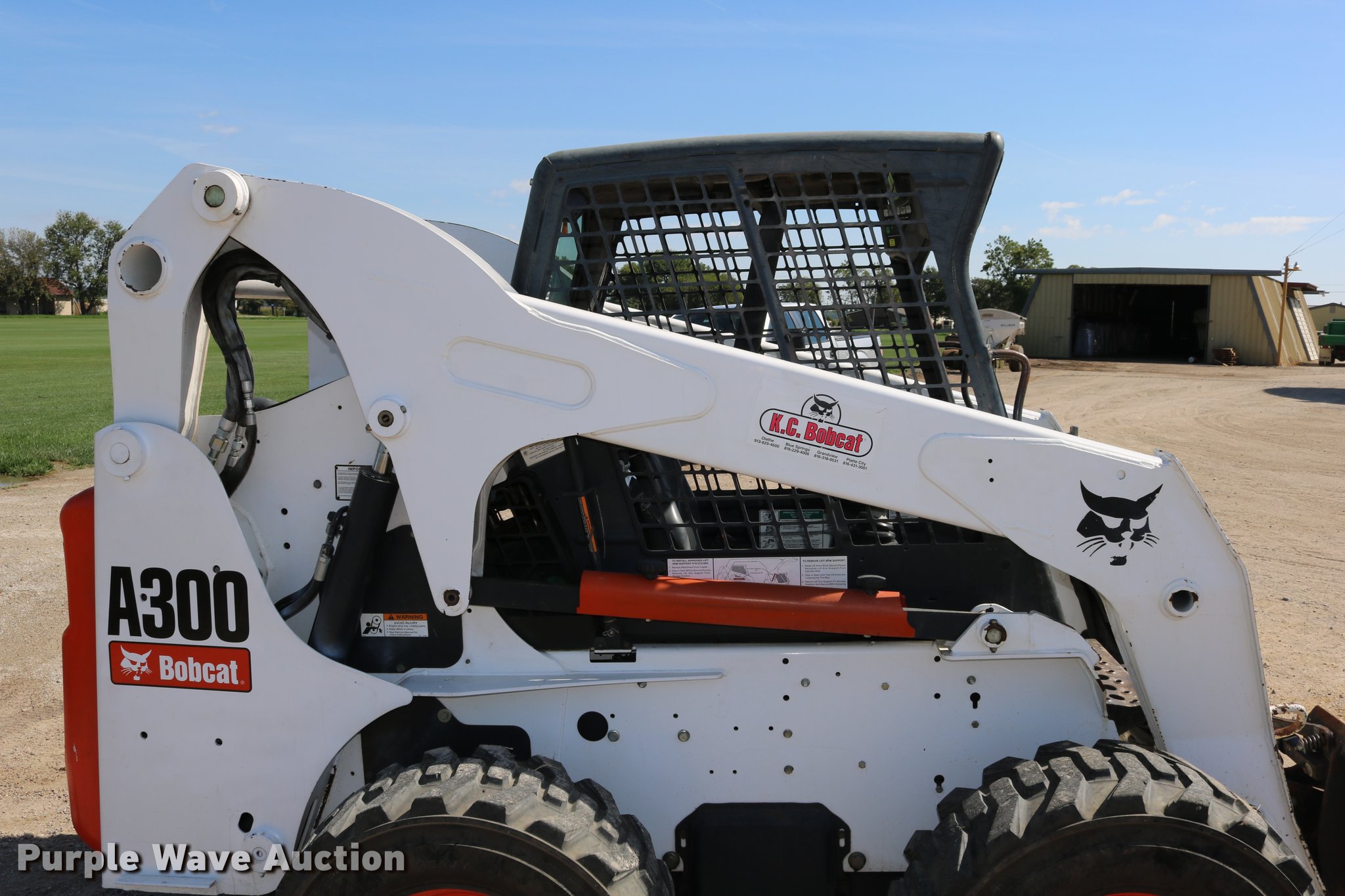 Purple Wave is selling a used Skid Steer Loader in Kansas. This item is a 2007 Bobcat A300 skid steer with the following: 3,343 hours on meter, Kubota four cylinder diesel engine, Two speed hydrostatic transmission, Four wheel steer, Enclosed cab, Joystick controls, EMS panel, Front and rear work lights, Backup alarm, Hydraulic quick coupler, Auxiliary hydraulics, Counter weights, 12-16.5 tires, Non-operational backup alarm, Serial 539911734