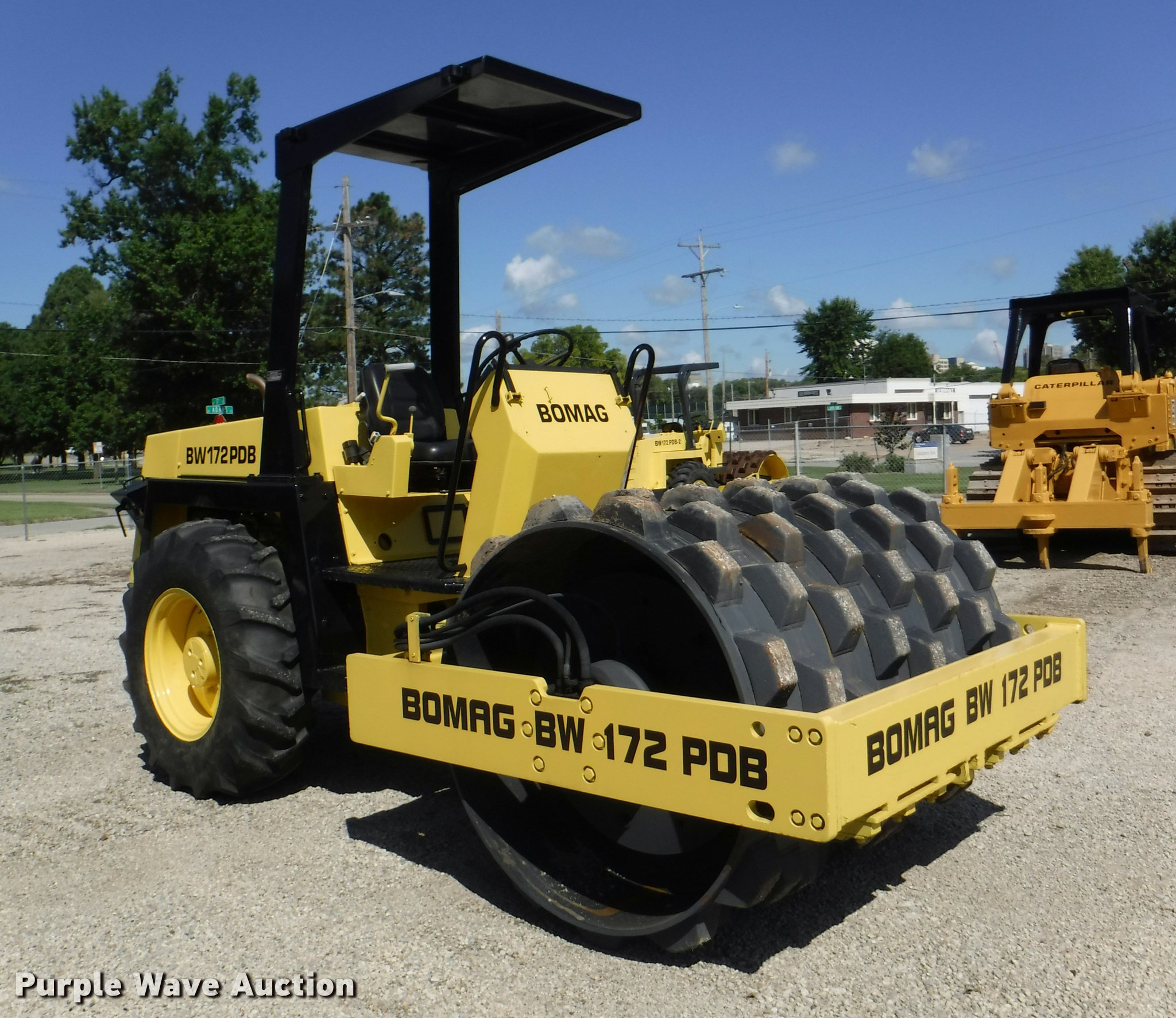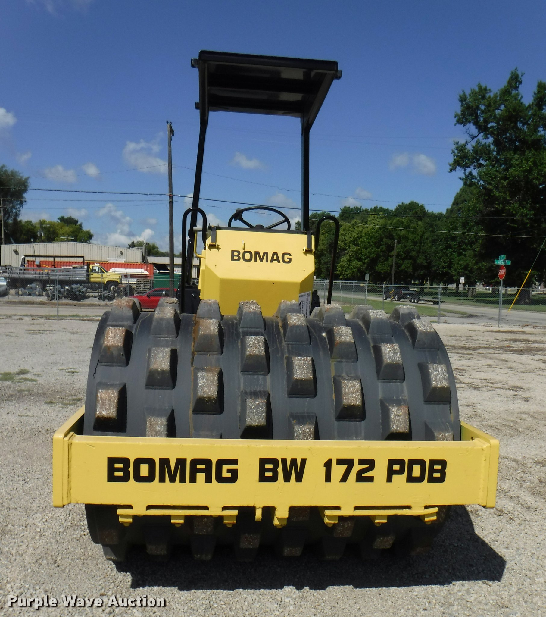 1990 Bomag BW172PD single drum roller. 4,824 hours on meter, 3 hours on replaced meter, Duetz four cylinder diesel engine, OROPS, 66"W x 45" diameter padfoot drum, Front drum scraper, (2) Goodyear 14.9-24 tires, Serial 101520210196. Topeka, KS 66607