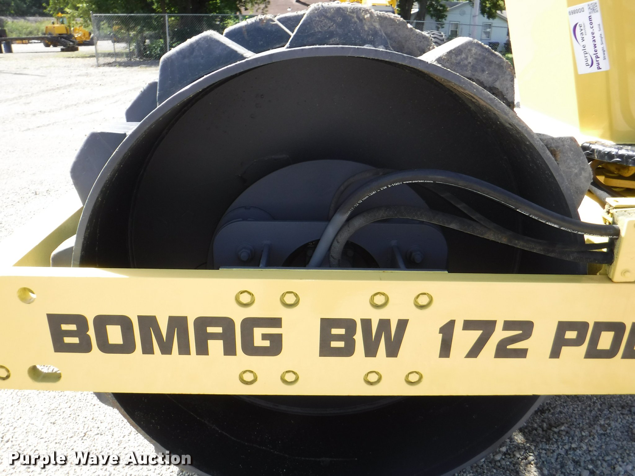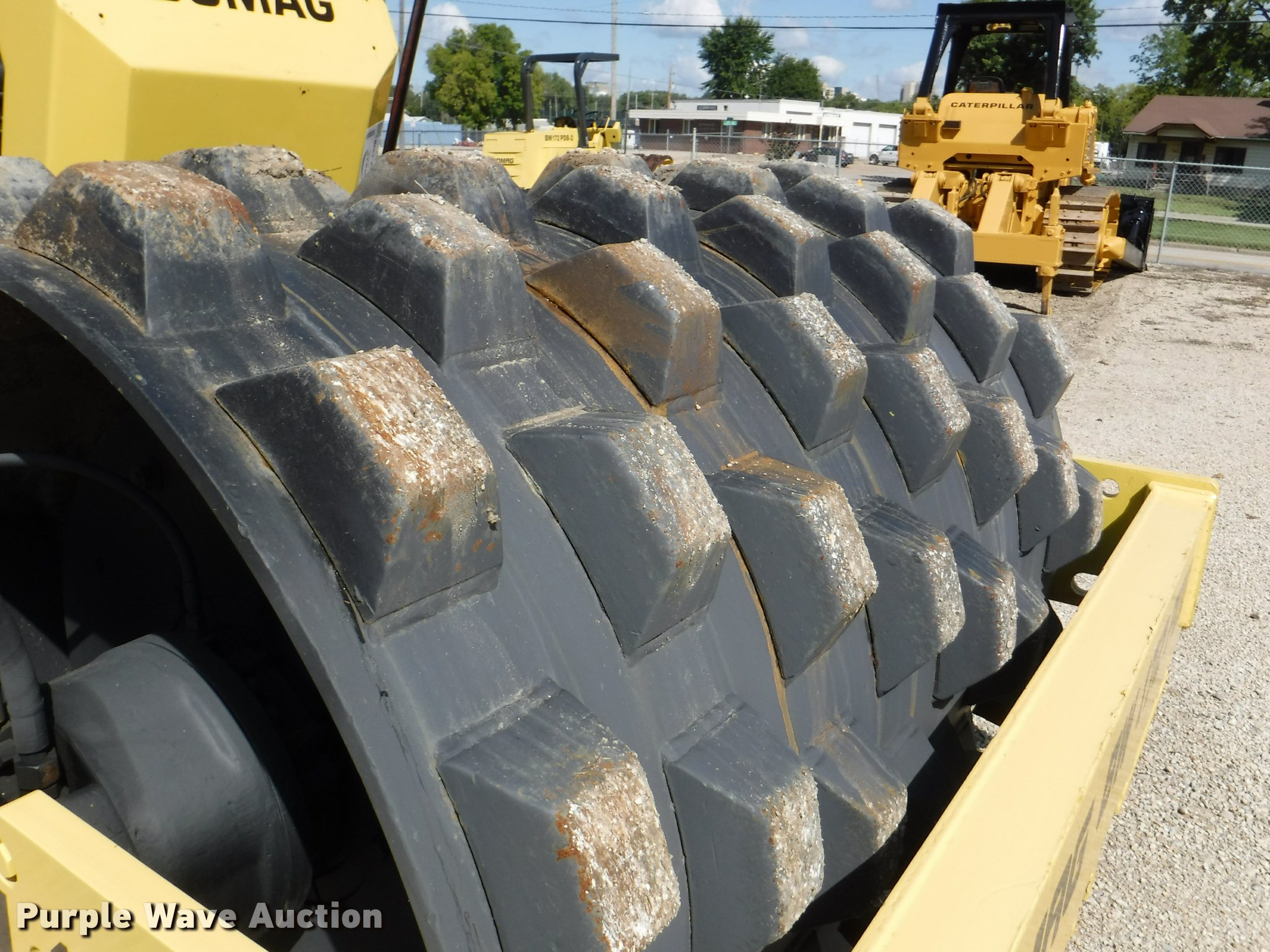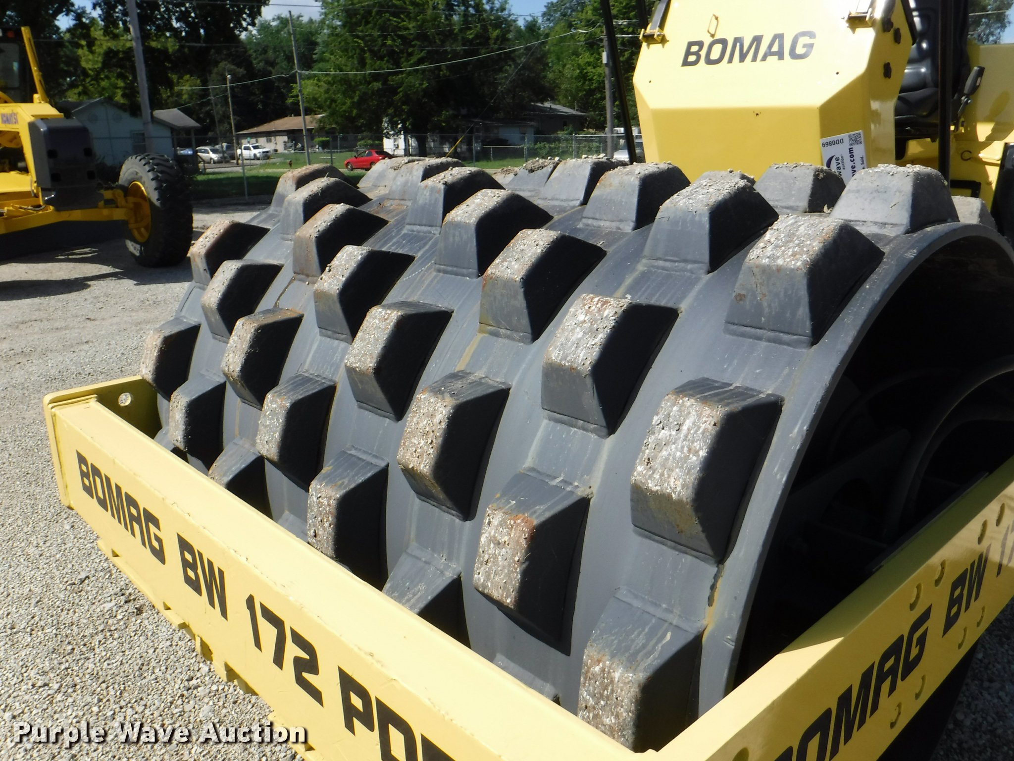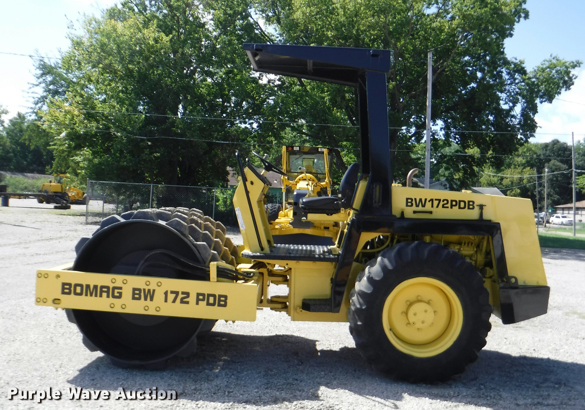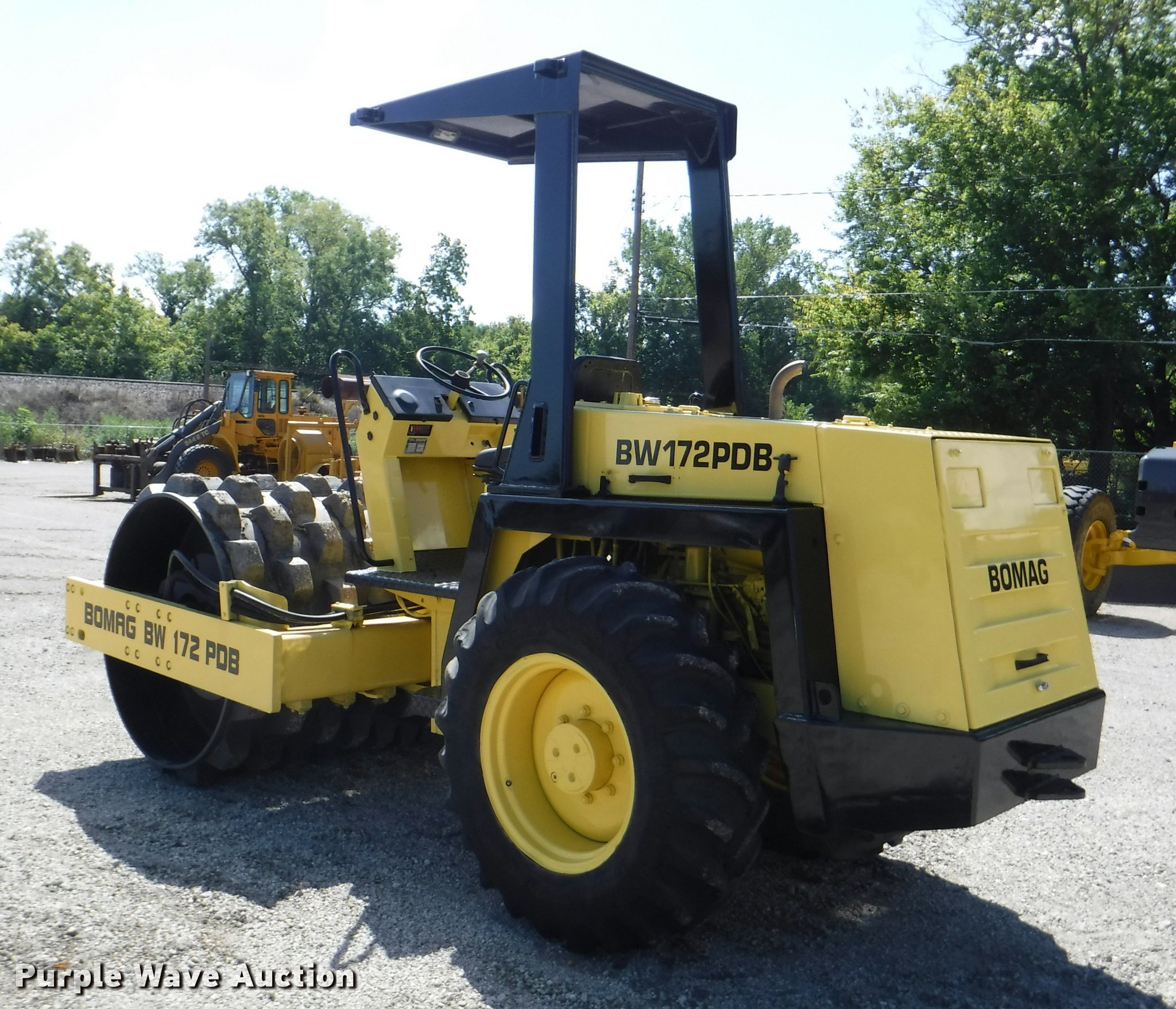 Purple Wave is selling a used Single Drum Roller Compactor in Kansas. This item is a 1990 Bomag BW172PD single drum roller with the following: 4,824 hours on meter, 3 hours on replaced meter, Duetz four cylinder diesel engine, OROPS, 66"W x 45" diameter padfoot drum, Front drum scraper, (2) Goodyear 14.9-24 tires, Serial 101520210196