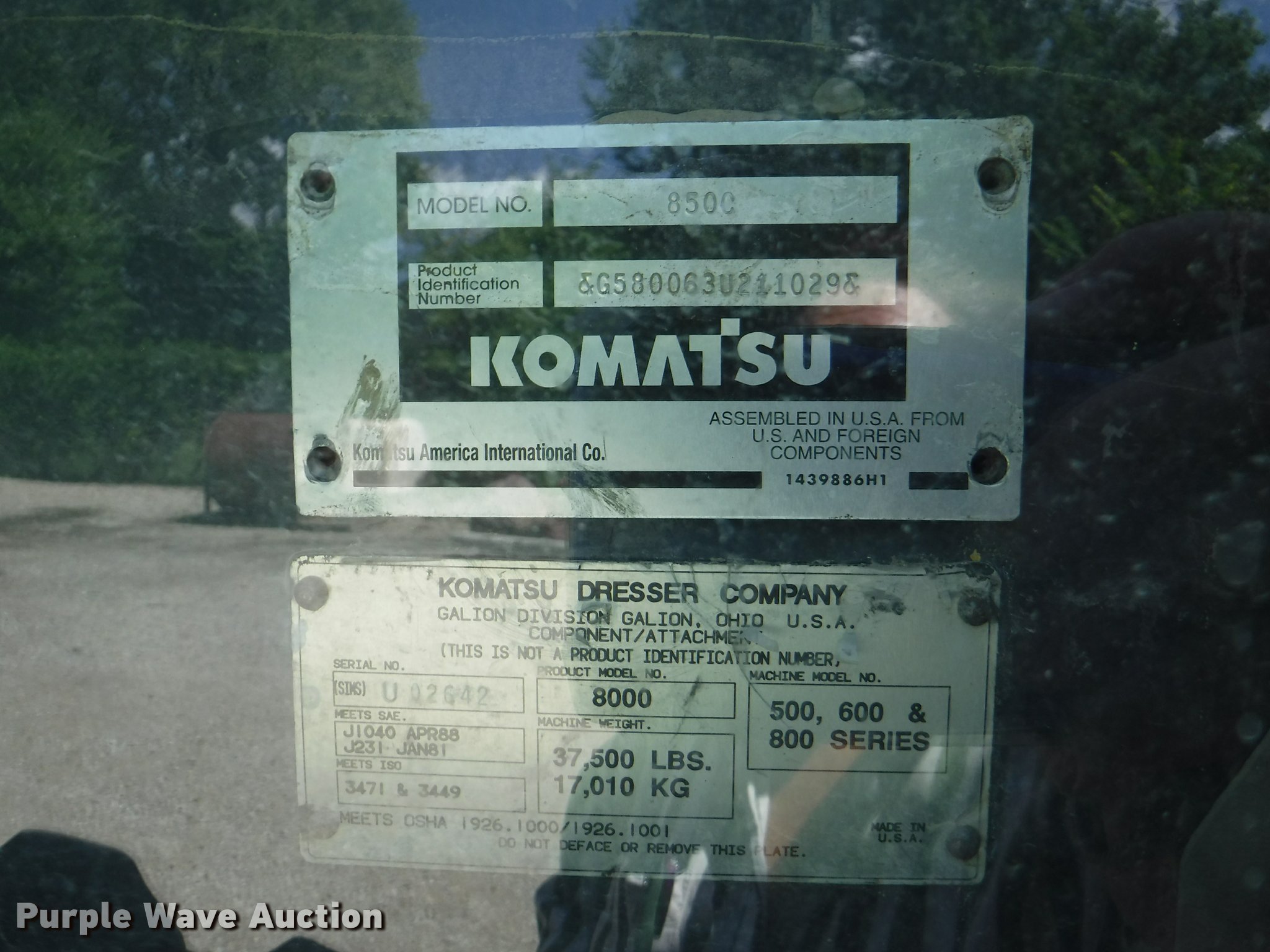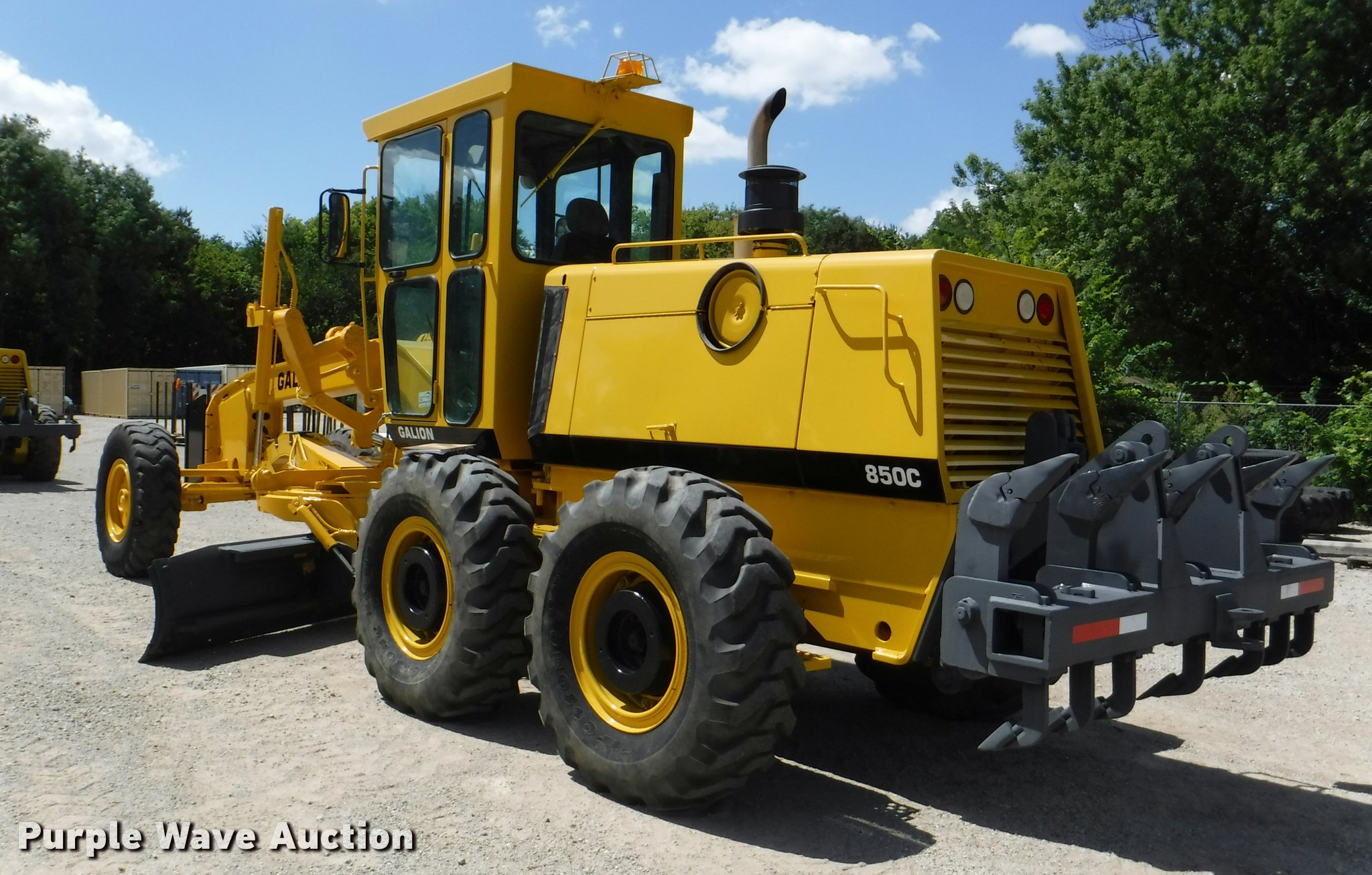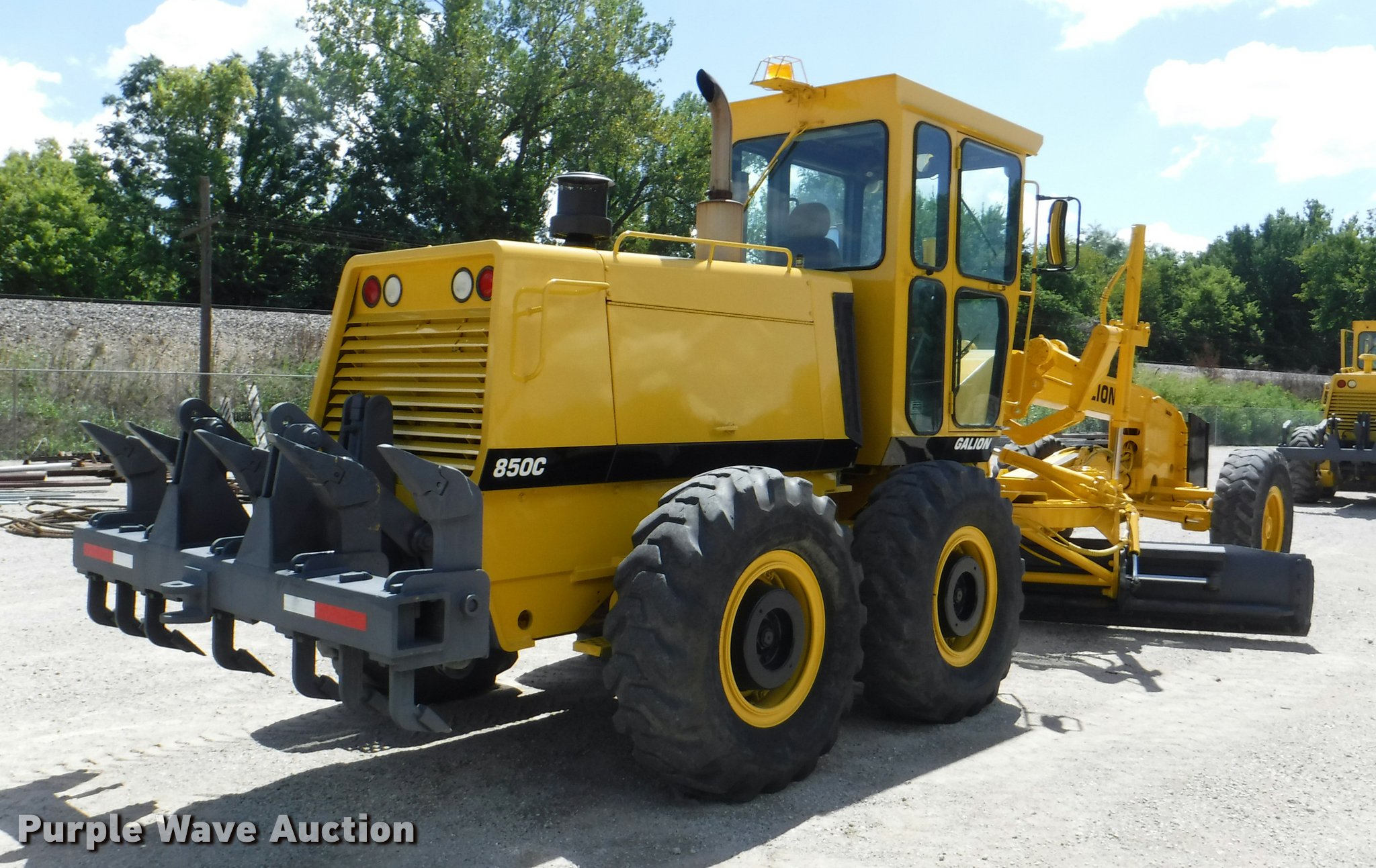 Purple Wave is selling a used Motor Grader in Kansas. This item is a 2003 Galion 850C VHP motor grader with the following: 8,909 hours on meter, Komatsu six cylinder diesel engine, 166 HP, Turbo II precleaner, All wheel drive, 6F-3R gears, EROPS, AC and heat, AM/FM, Beacon light, Backup alarm, Front work lights, 14'W moldboard, Tip control, Side shift, Circle slip clutch, Front mounted push block, Rear ripper, (5) shanks, (7) teeth, 14.00-24 tires, One owner, Serial 65800630211029