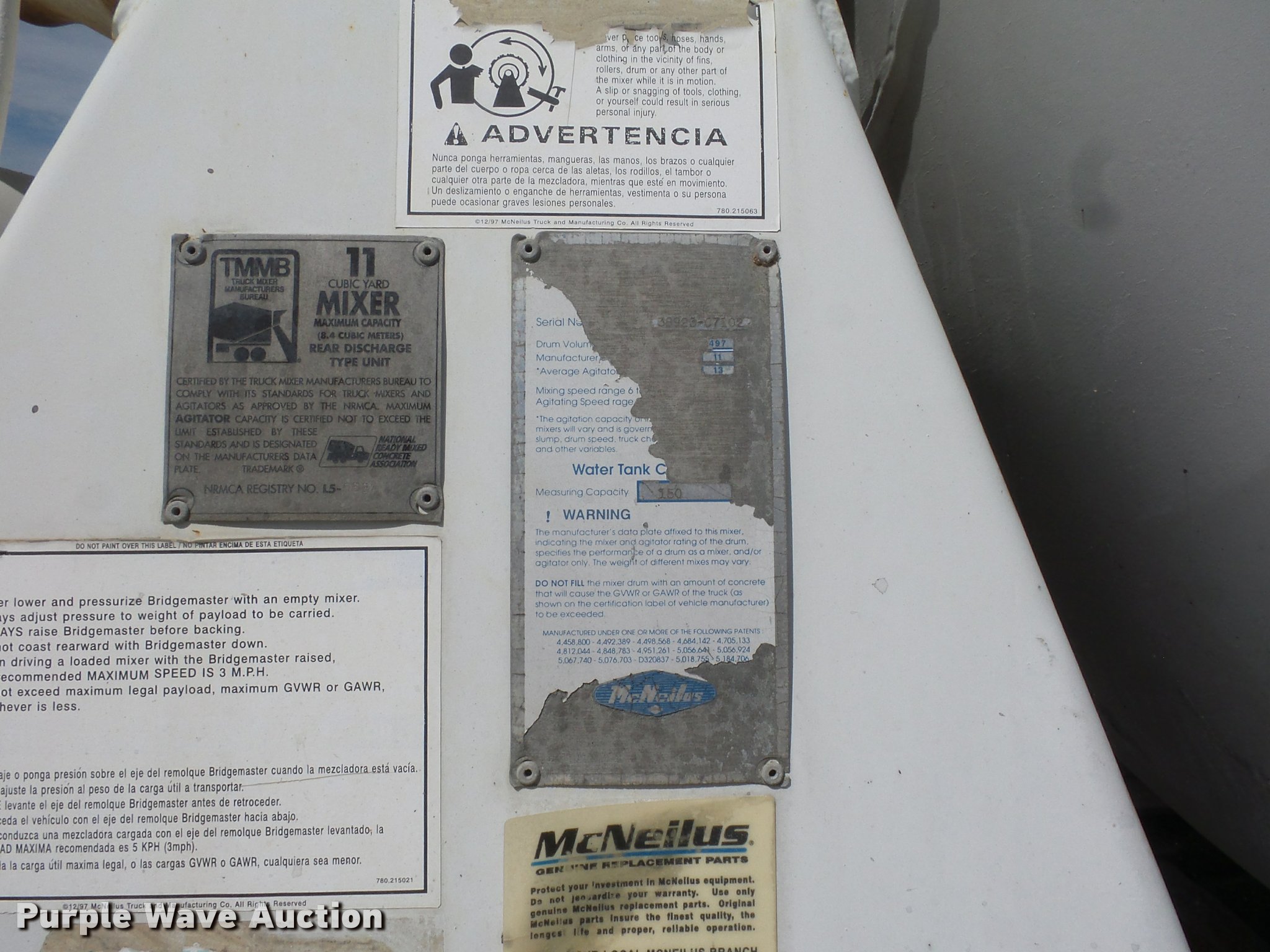 Purple Wave is selling a used Ready Mix or Pump Truck in Missouri. This item is a 1995 Ford LT9000 ready mix truck with the following: 173,723 miles on odometer, 10,409 hours on meter, Cummins ISM 10.8L L6 turbo diesel engine, Tandem axle, Heat, Mcneilus 11 cu.yd. mixer bed, (3) chute extensions, 150 gallon water tank, Serial 38923-07102, Air suspension, Air brakes, 425/65R22.5 tires, GVWR 62,000 lbs, FAWR 20,000 lbs, RAWR 46,000 lbs