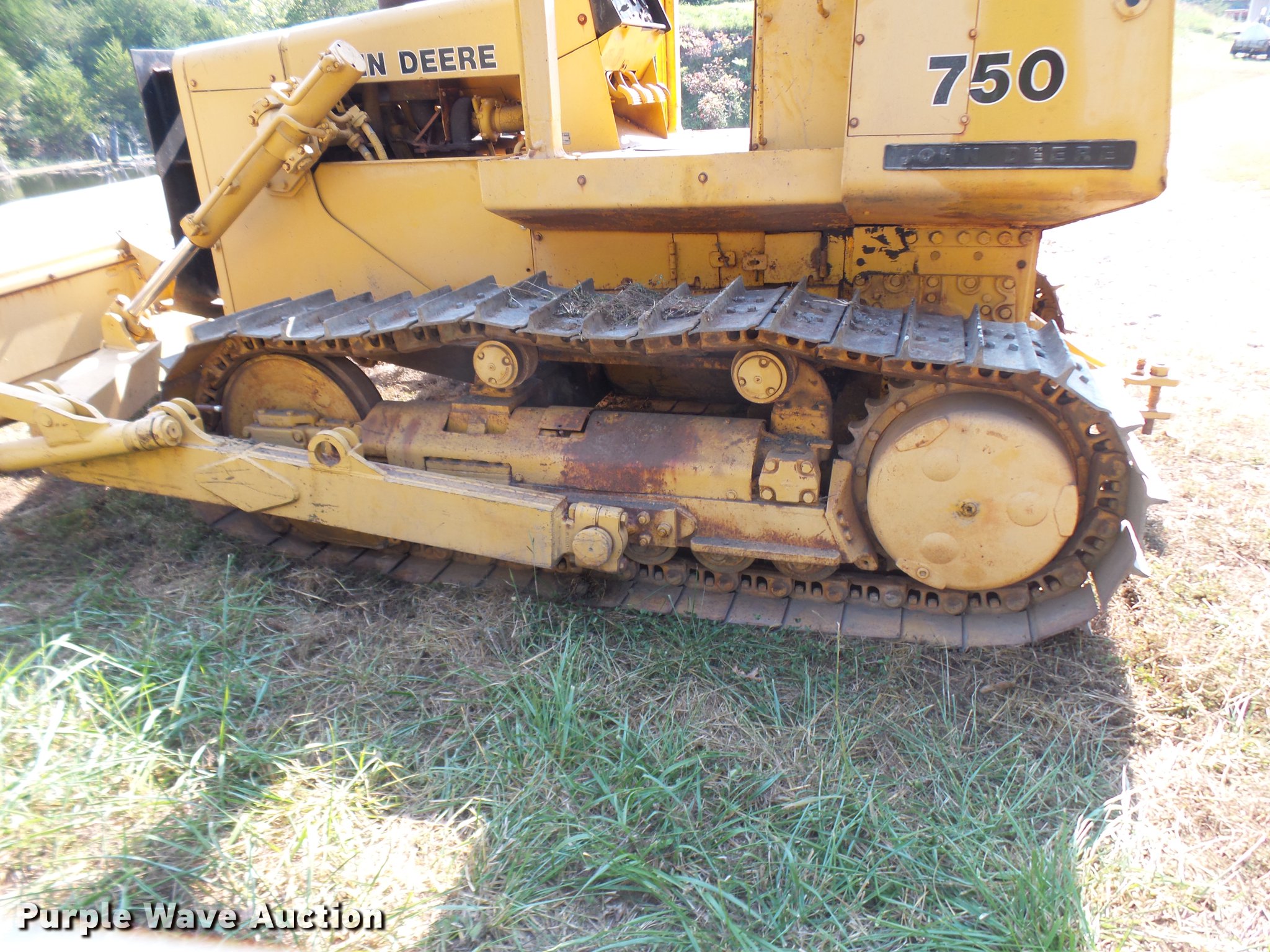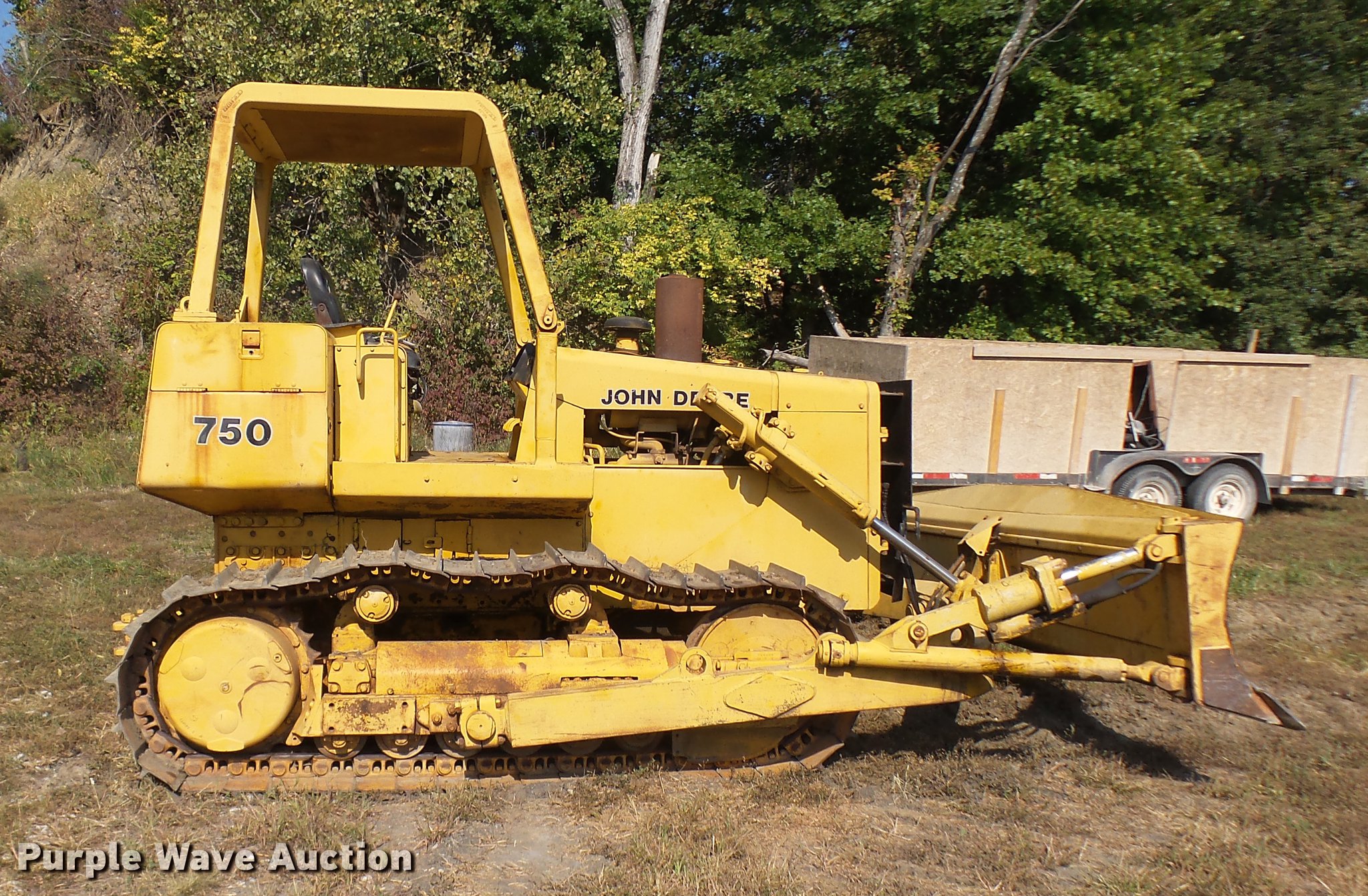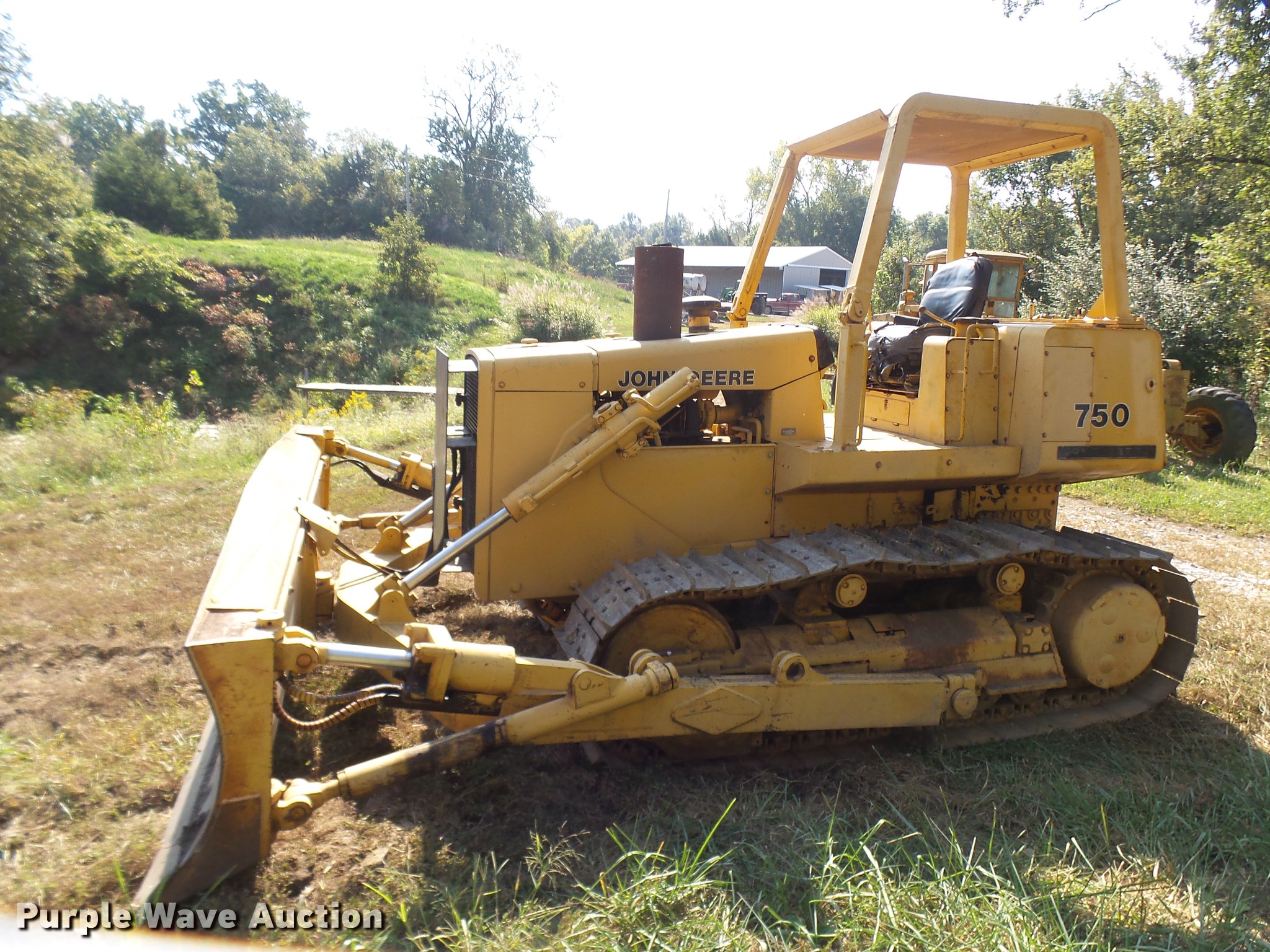 Purple Wave is selling a used Crawler Dozer in Missouri. This item is a 1984 John Deere 750D dozer with the following: John Deere six cylinder turbo diesel engine, Hydrostatic transmission, Canopy, Clutch brake steering, 13' six-way dozer blade, Grill guard, Rear drawbar, Six bottom rollers, 20" single grouser track pads, Serial 3456421
