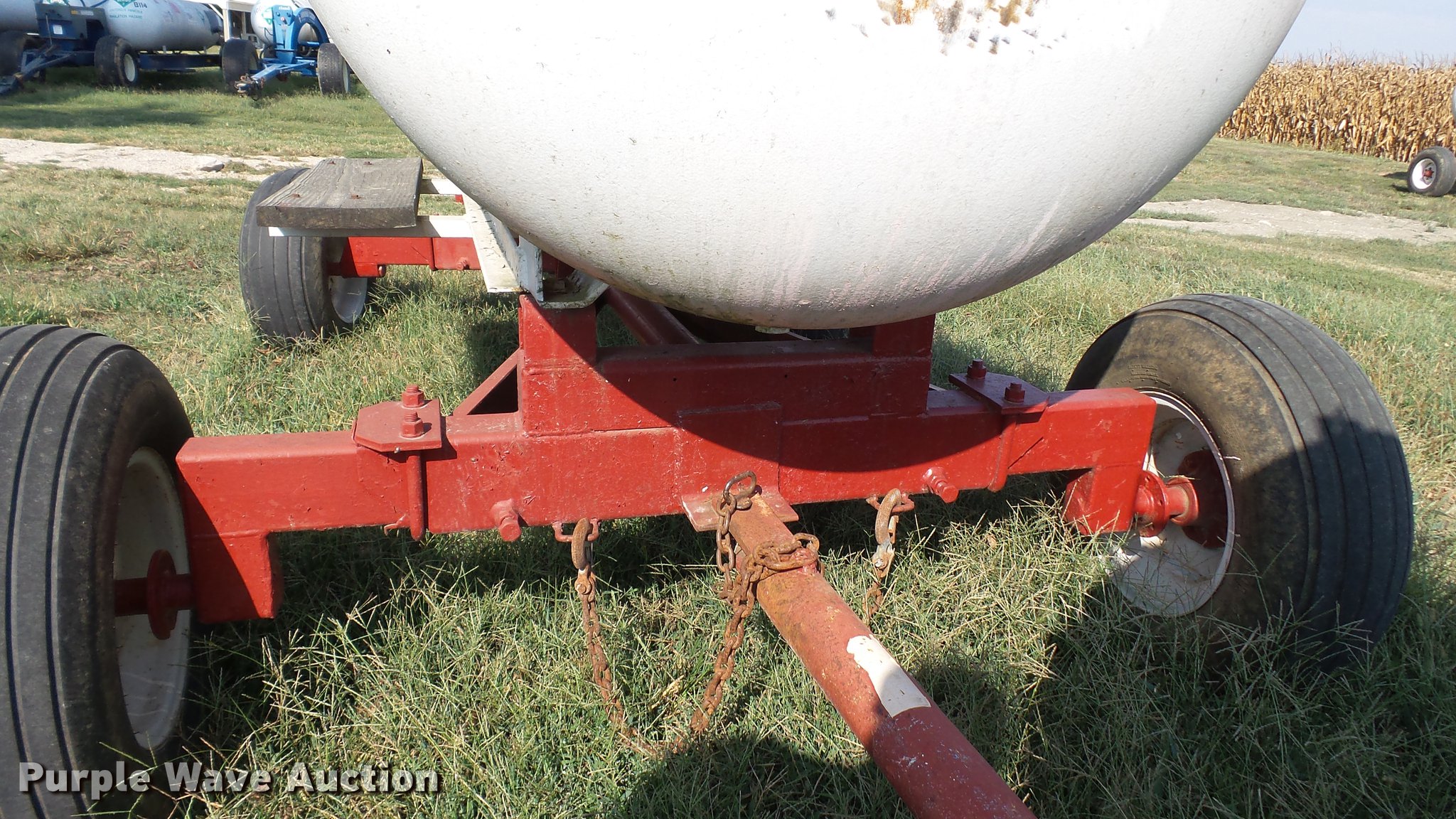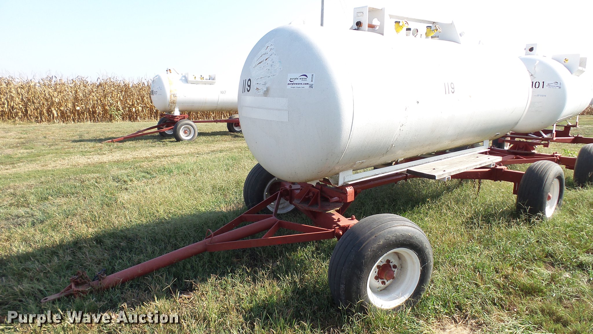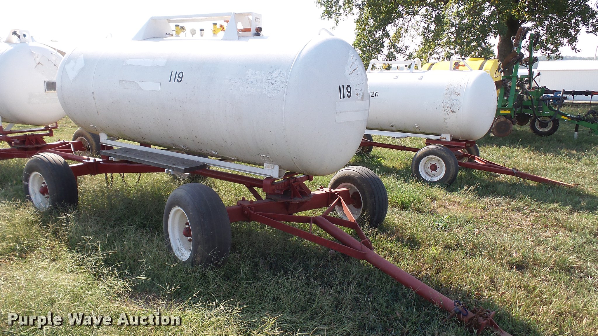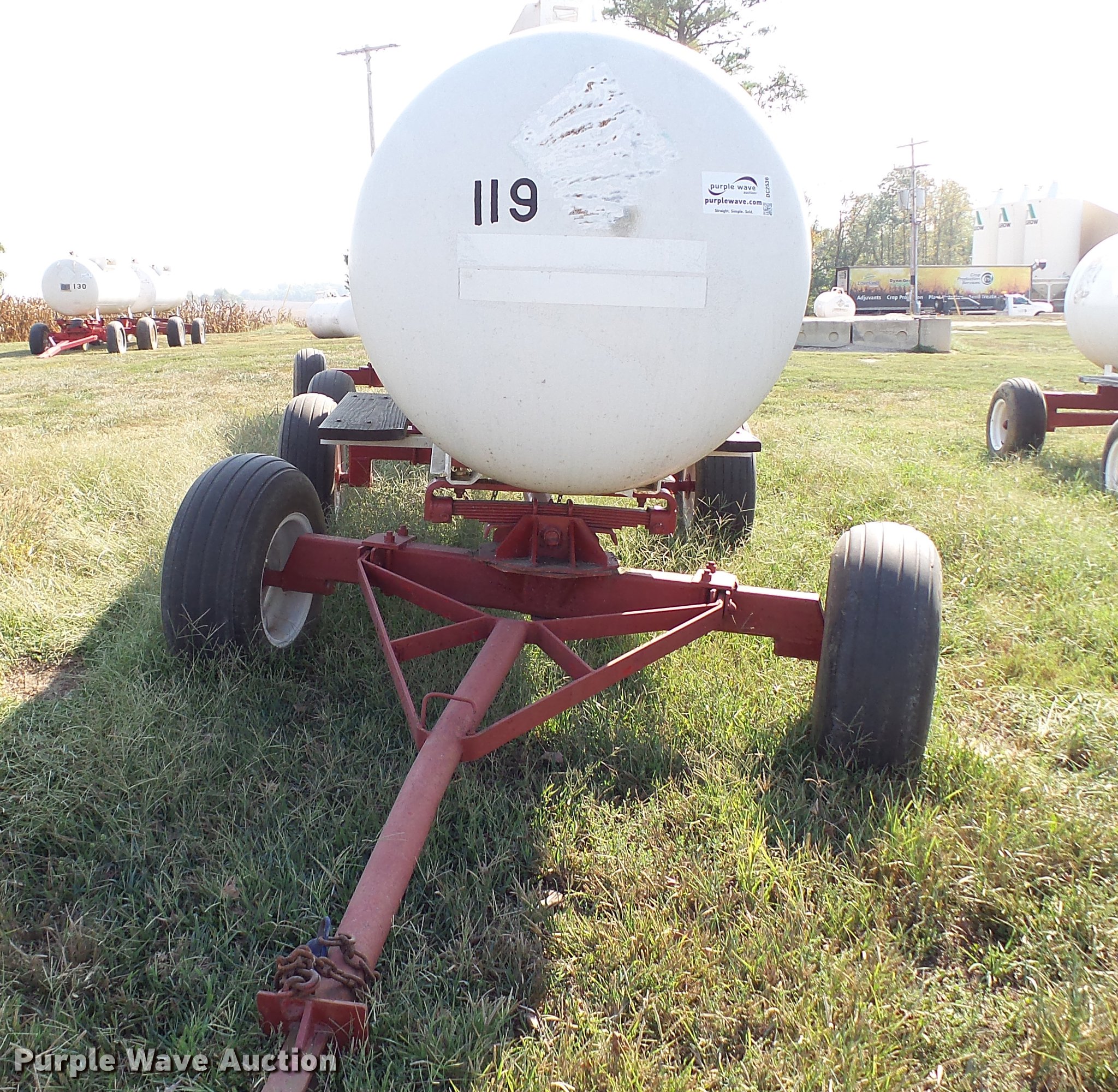 Purple Wave is selling a used Applicator Attach. in Indiana. This item is a Anhydrous ammonia nurse tank with the following: 1,000 gallon capacity, Front pin hitch, Rear pin hitch, 11L-15 tires, Unit# 119