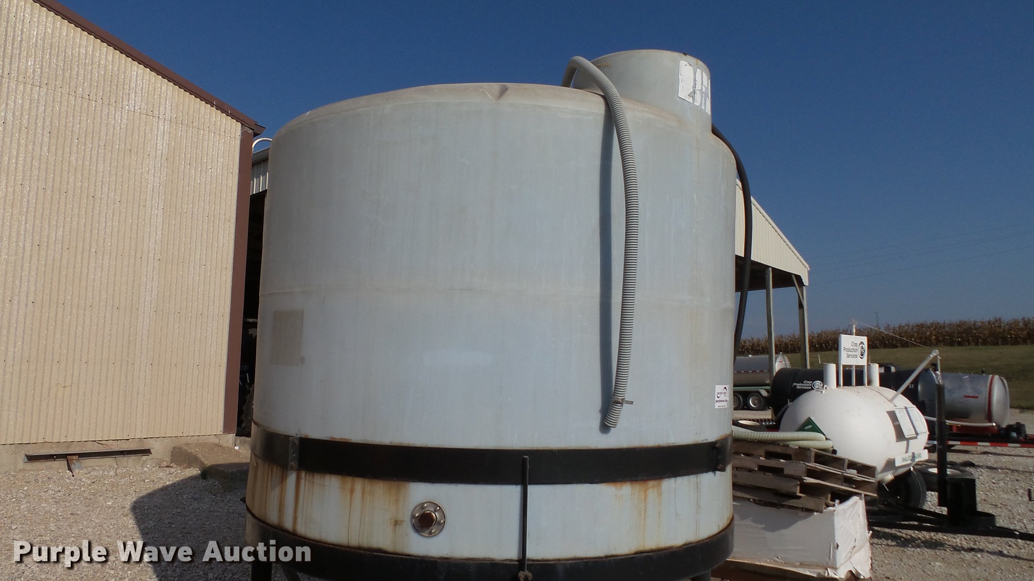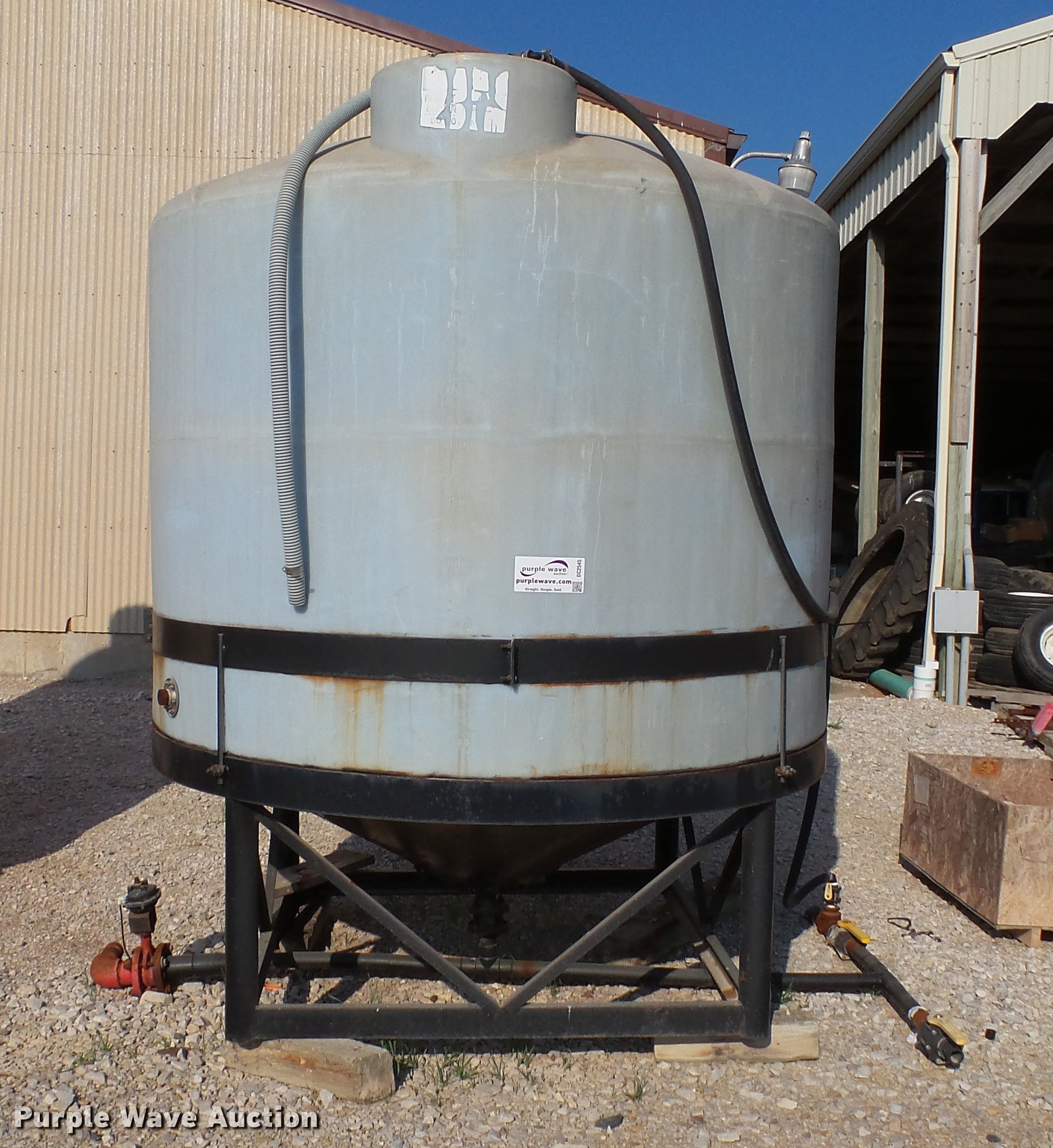 Purple Wave is selling a used Tanks in Indiana. This item is a Poly cone bottom tank with the following: Approx. 10'H x 8' diameter, 2,500 gallon capacity, 2" bottom outlet, Top fill, Metal stand