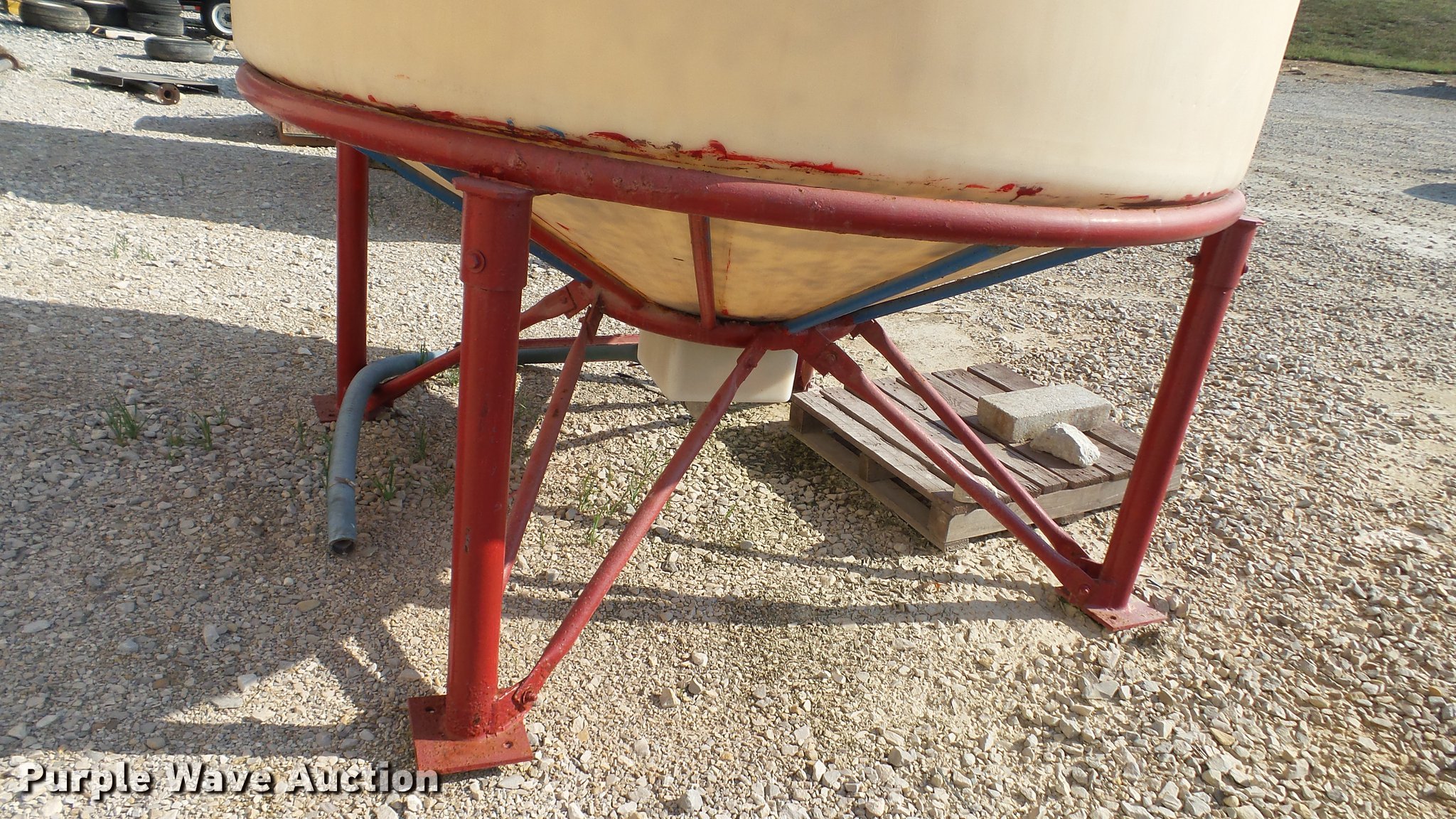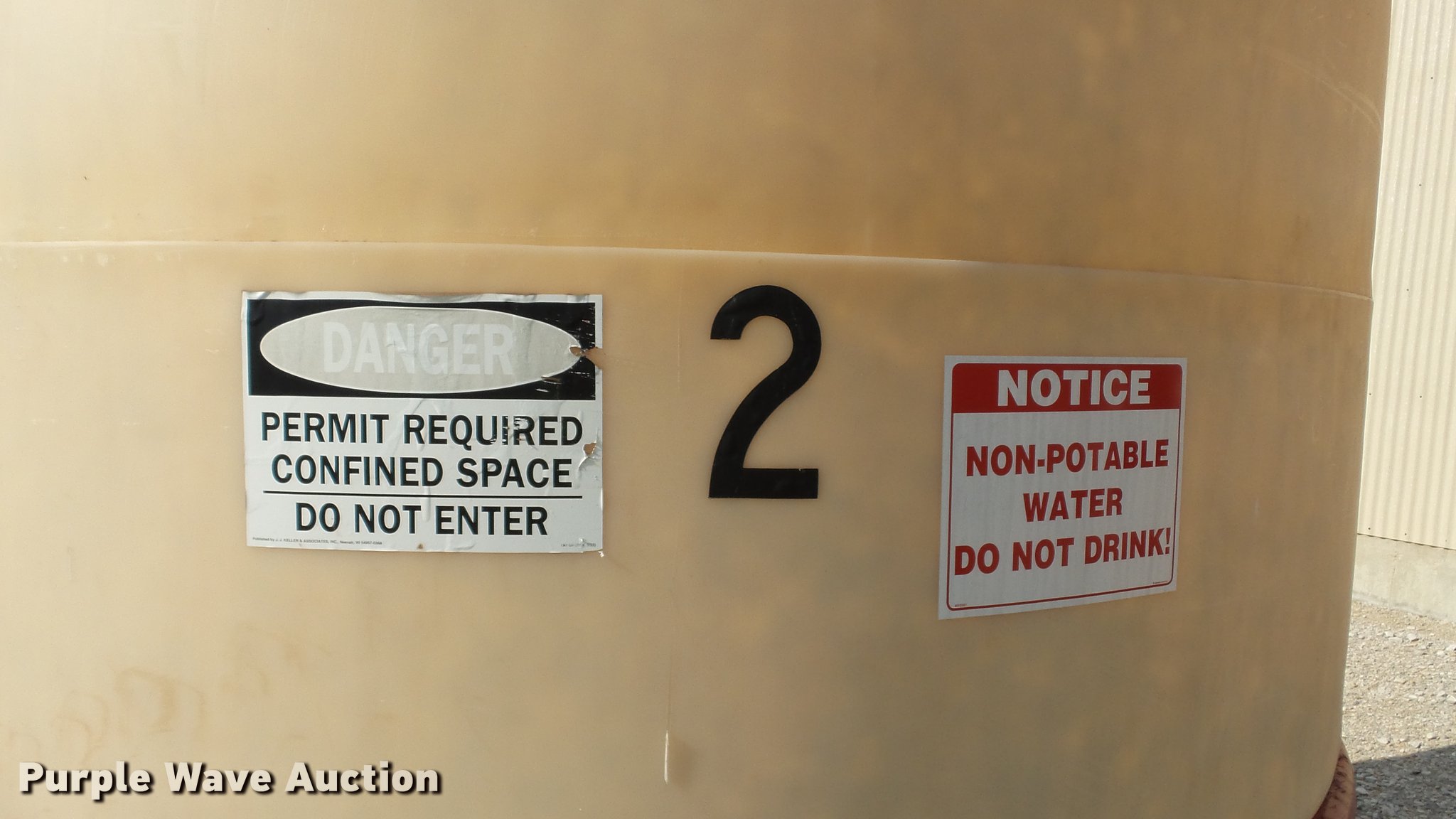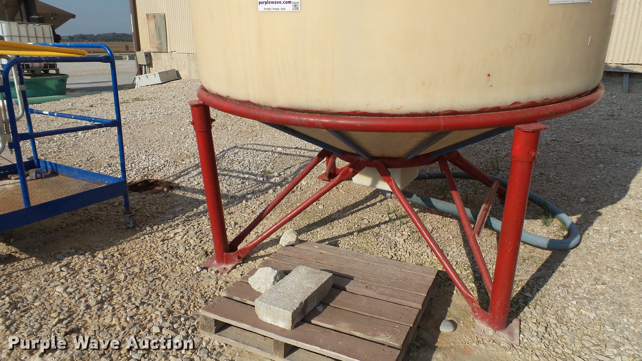 Purple Wave is selling a used Tanks in Indiana. This item is a SSI poly cone bottom tank with the following: Approx. 11.5'H x 7' diameter, 2,500 gallon capacity, 2" bottom outlet, Top fill, Metal stand