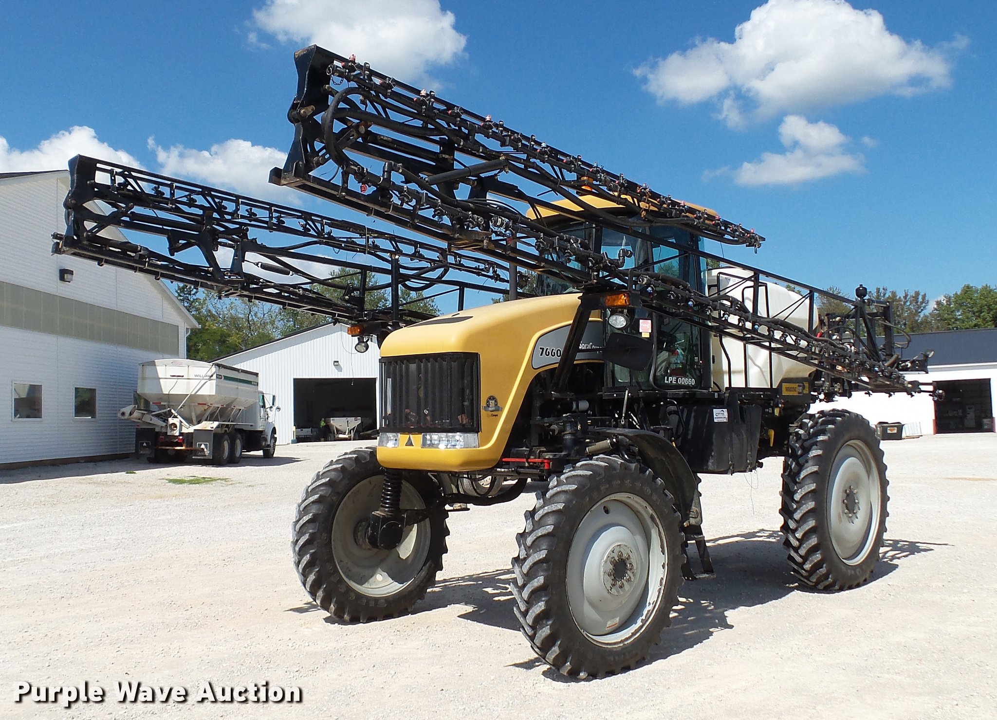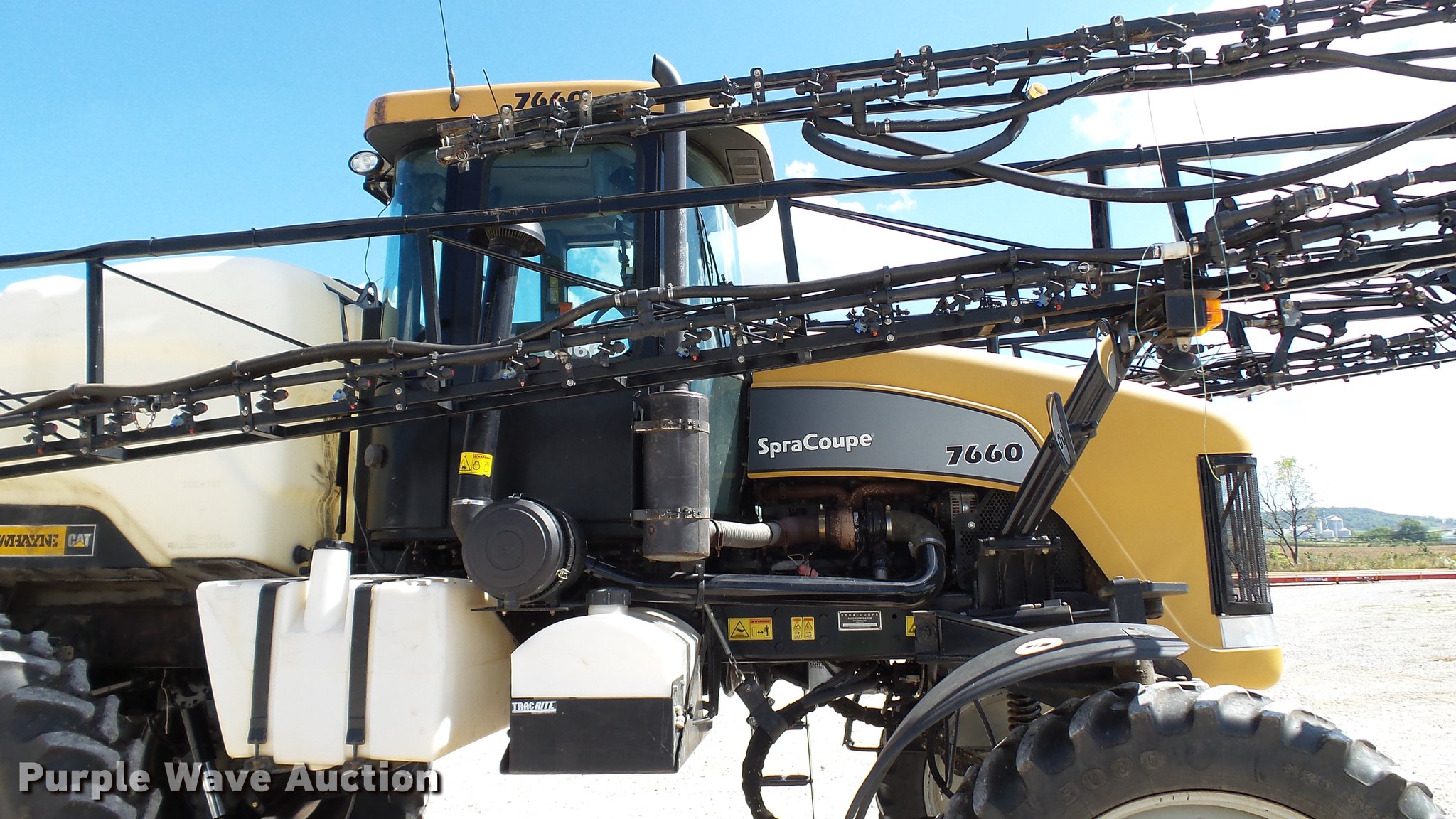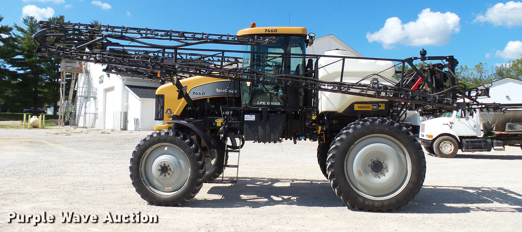 2012 SpraCoupe 7660 self-propelled sprayer. 3,214 hours on meter, Perkins 1106D-E66TA 6.6L six cylinder turbo diesel engine 129.6 kW, Serial RJ38780, Hydrostatic transmission, Four wheel drive, 700 gallon poly solution tank, Rinse tank, Foam marker tank, 90'W boom Five boom sections, Break-away boom, Hydraulic boom fold, 10" nozzle spacing, Three-way nozzle bodies, AC and heat, AM/FM, Suspension seat, Rotary beacon, Work lights, Sun shade, Raven Viper Pro GPS monitor, Spray controls, Raven SmarTrax auto steer, Hydraulic ladder, Fenders, Hydraulic axle width adjust, Firestone 320/85R38 row crop front tires, Firestone 380/90R46 row crop rear tires, Serial AGCS7660ACN8P2025. Crop Production Services. 7410 US-60. Ekron, KY 40117