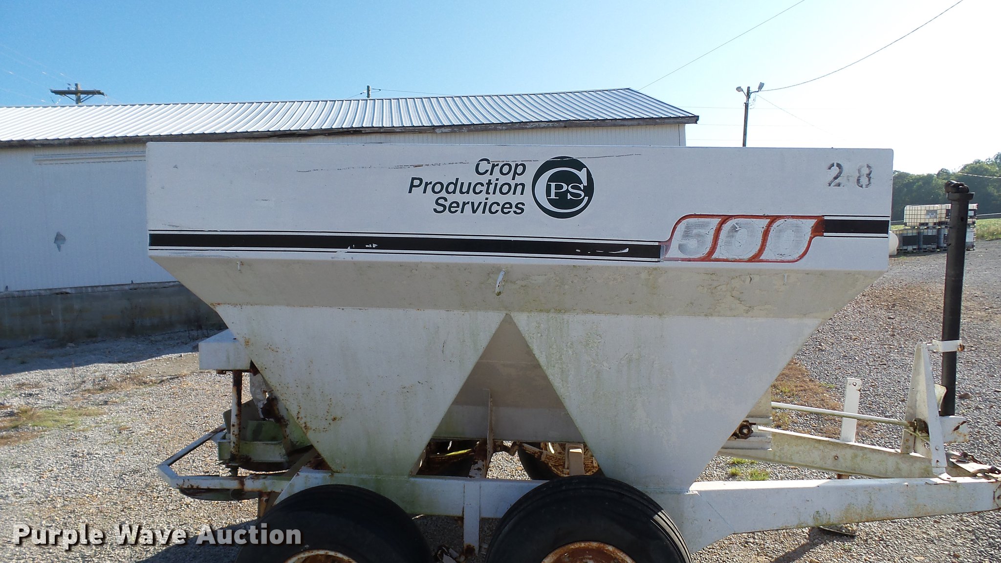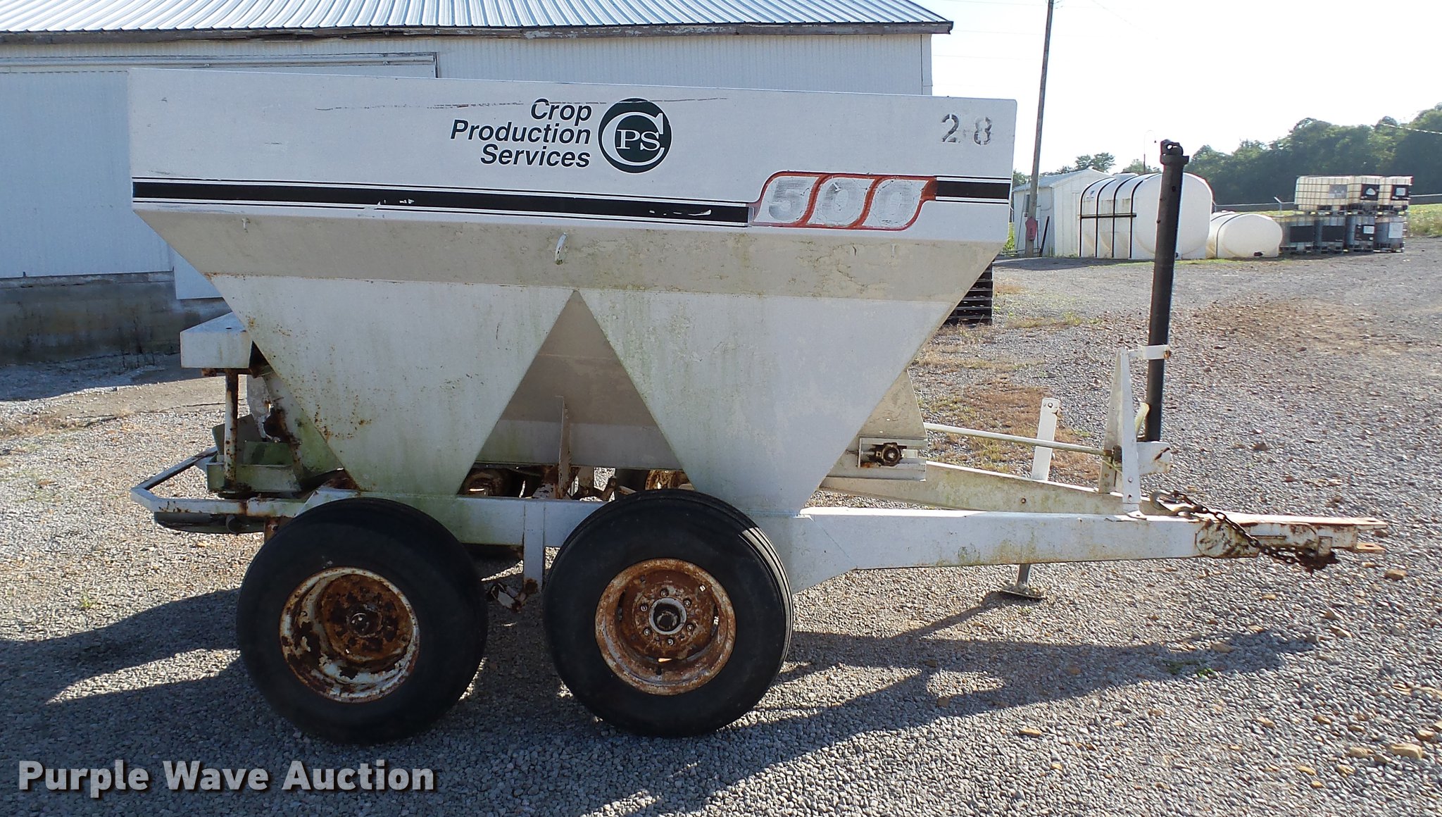 Willmar spreader. 15'L overall, 8'L x 92"W hopper, Ground driven live bottom, 7"W steel chain, Dual 19" spinners PTO driven, 540 PTO, Pin hitch, Single leg landing gear, Spring suspension, Tandem axle, 11L-15 tires, Unit# 22920. Crop Production Services. 144 Airport Rd. Campbellsville, KY 42718