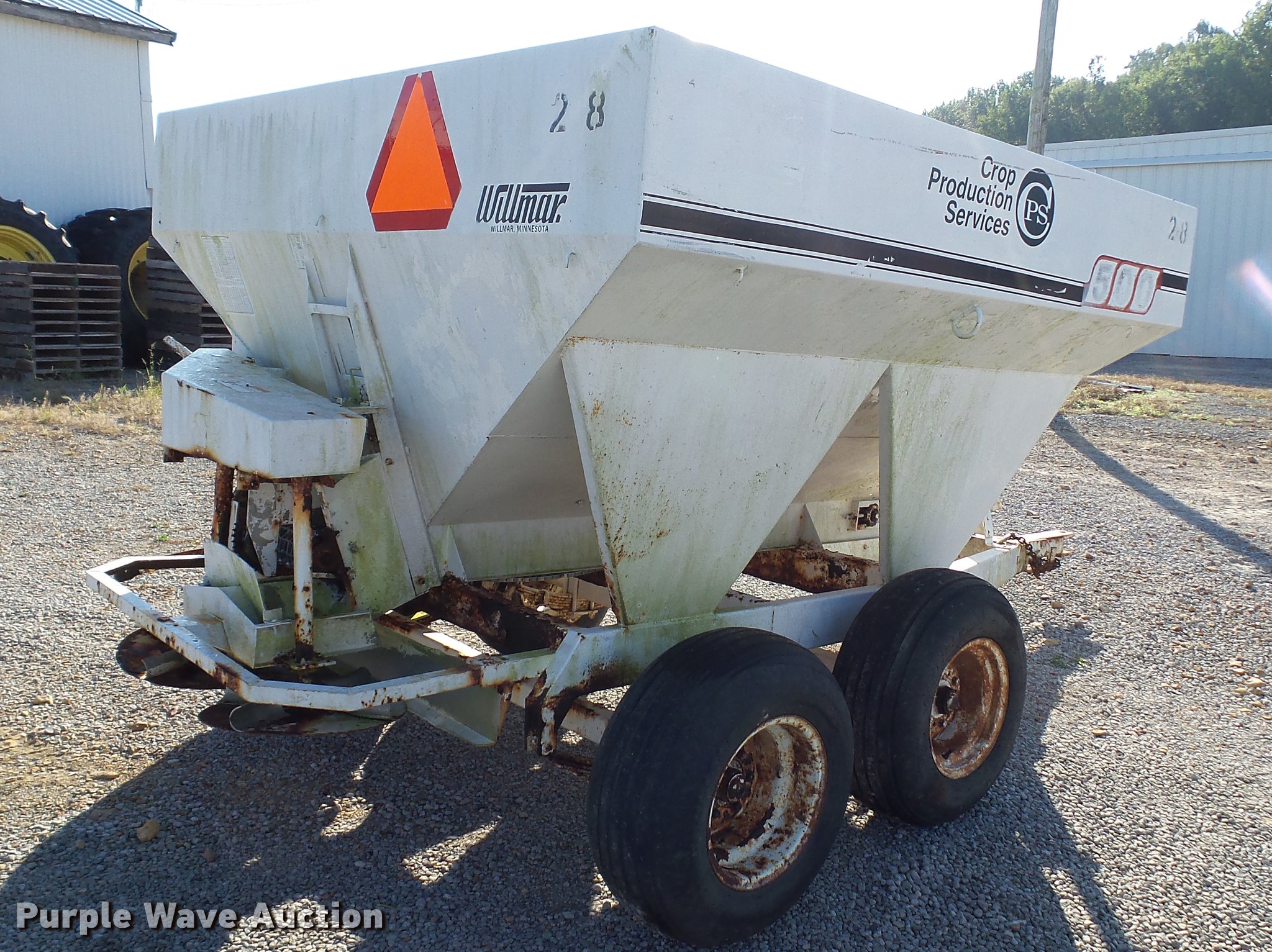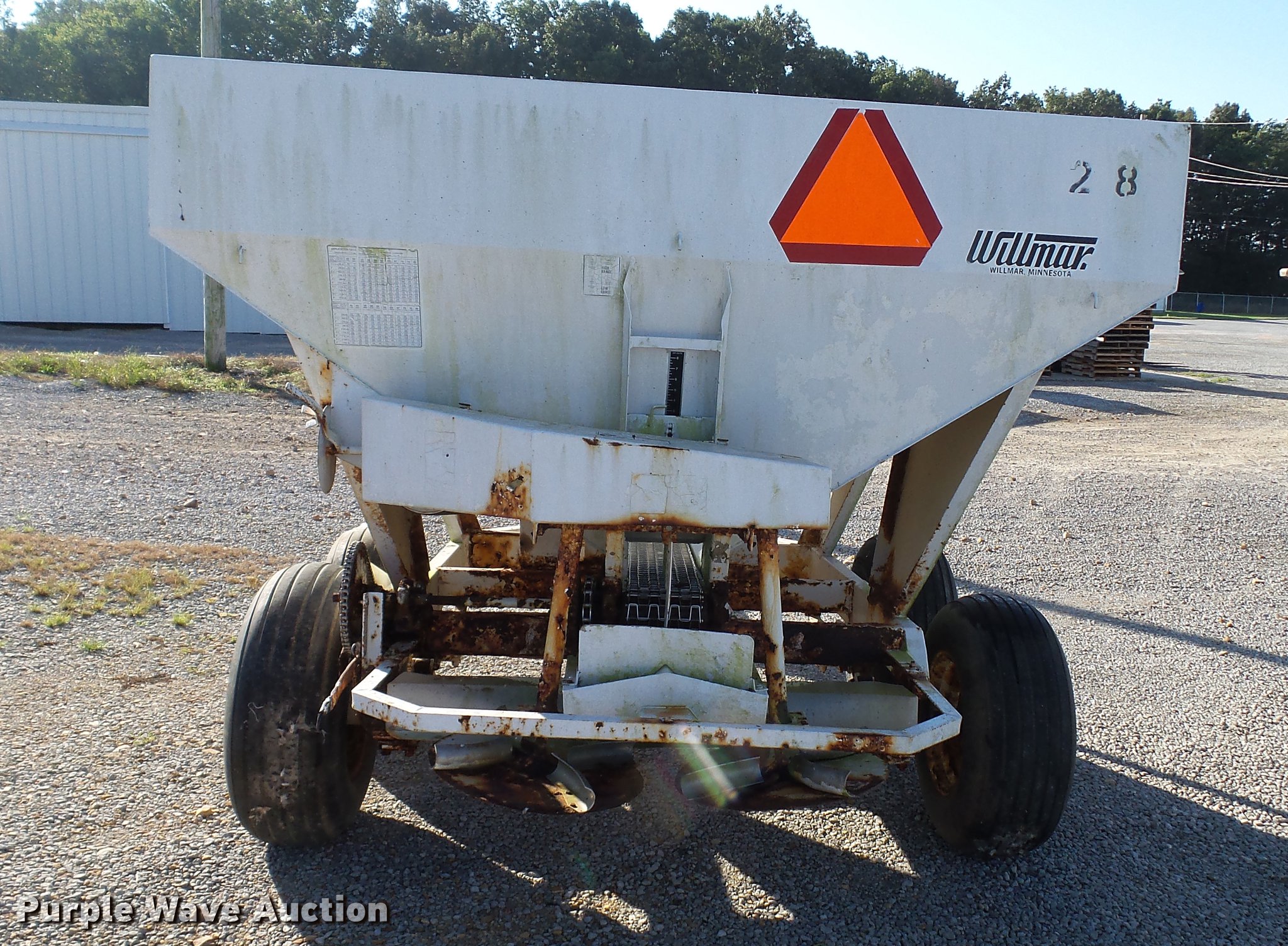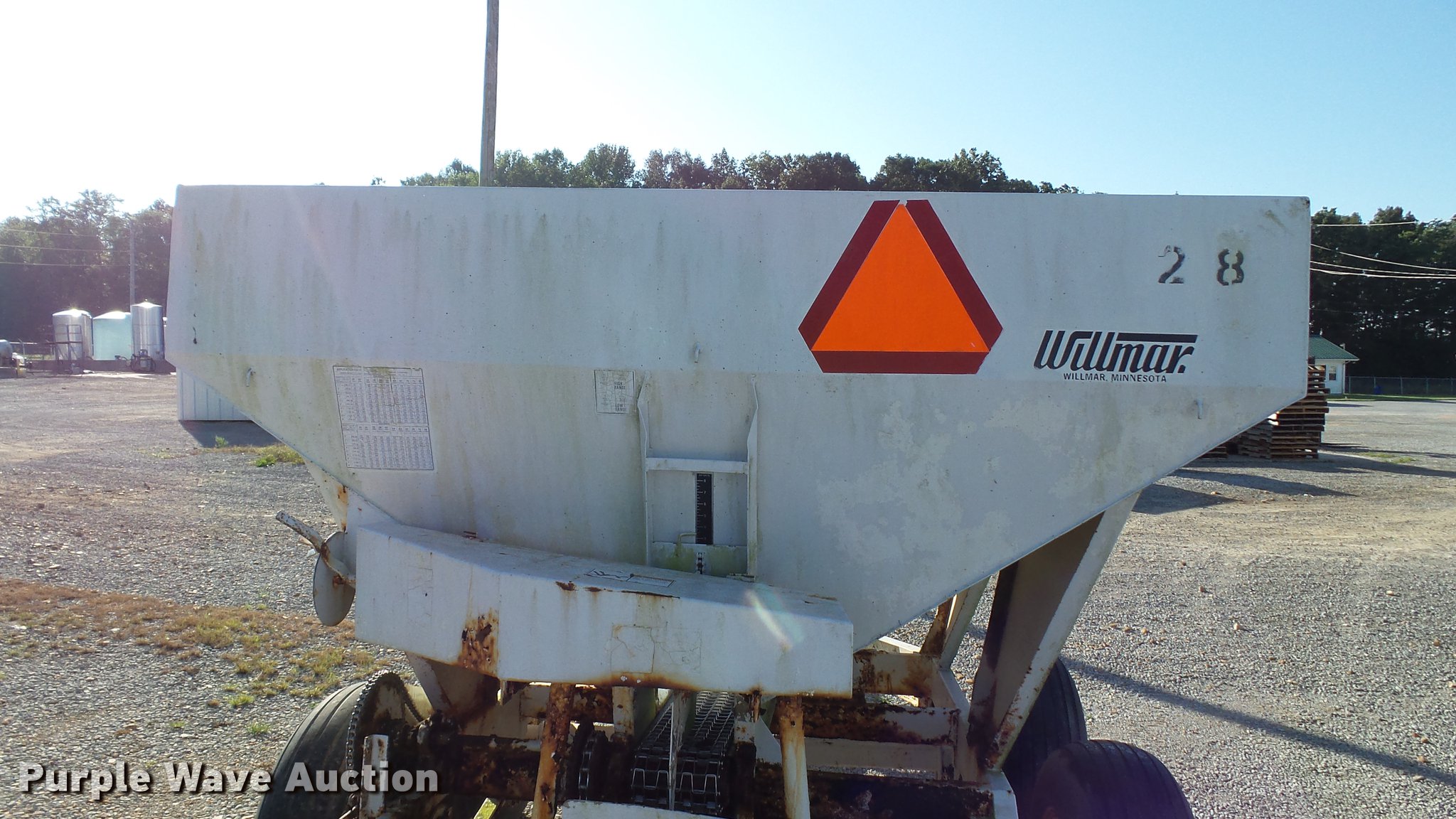 Purple Wave is selling a used Applicator Pull Type in Kentucky. This item is a Willmar spreader with the following: 15'L overall, 8'L x 92"W hopper, Ground driven live bottom, 7"W steel chain, Dual 19" spinners, PTO driven, 540 PTO, Pin hitch, Single leg landing gear, Spring suspension, Tandem axle, 11L-15 tires, Unit# 22920