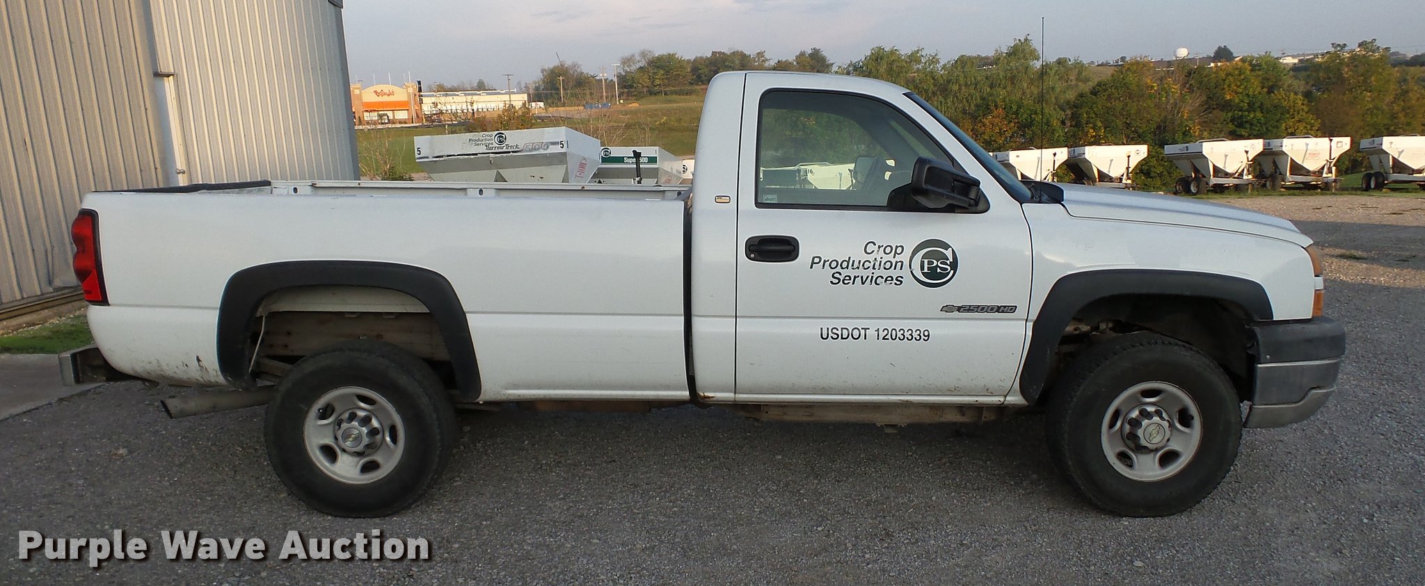 2005 Chevrolet Silverado 2500HD pickup truck. 226,636 miles on odometer, 6.0L V8 OHV 16V gas engine, Automatic transmission, AC and heat, Tilt, Cruise, AM/FM, Manual windows and locks, Cloth interior, Vinyl interior, Long bed, Firestone Transforce 265/70R16 tires, Check engine light on, Steel not included, will be removed prior to auction, Unit# 22096. Kentucky title. Title distribution may be delayed up to 30 days from verification of funds and title assignment. 1GBHC24U35E309074. Crop Production Services. 256 Old Brunerstown Rd. Shelbyville, KY 40065