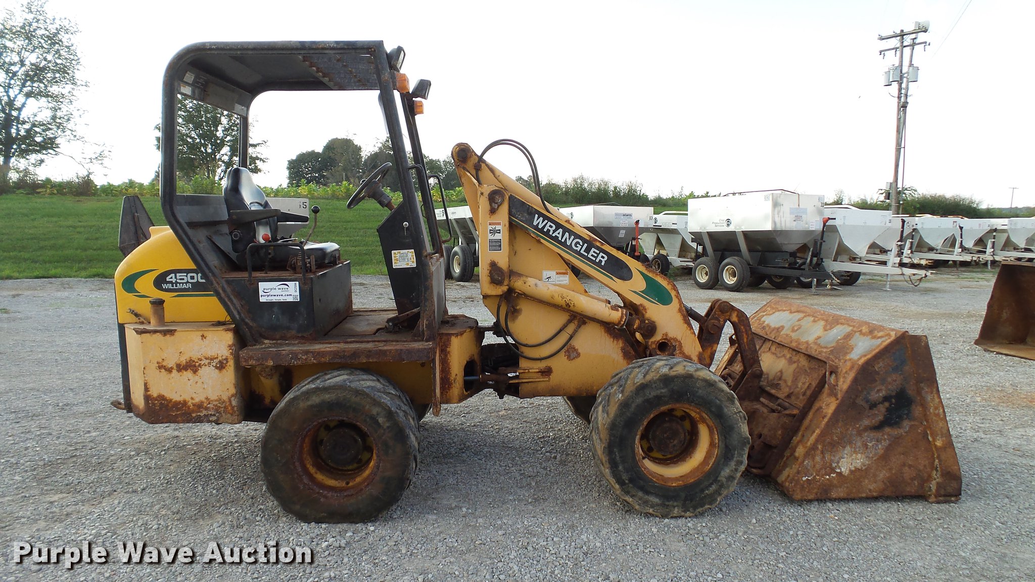 Purple Wave is selling a used Wheel Loader in Kentucky. This item is a Willmar Wrangler 4500 wheel loader with the following: 2,110 hours on meter, Deutz four cylinder turbo diesel engine, Hydrostatic transmission, Four wheel drive, OROPS, Joystick bucket controls, Front and rear work lights, Hydraulic quick coupler, 63"W bucket, Bolt-on cutting edge, Front auxiliary hydraulics, Rear receiver hitch, 31x15.5-15 tires