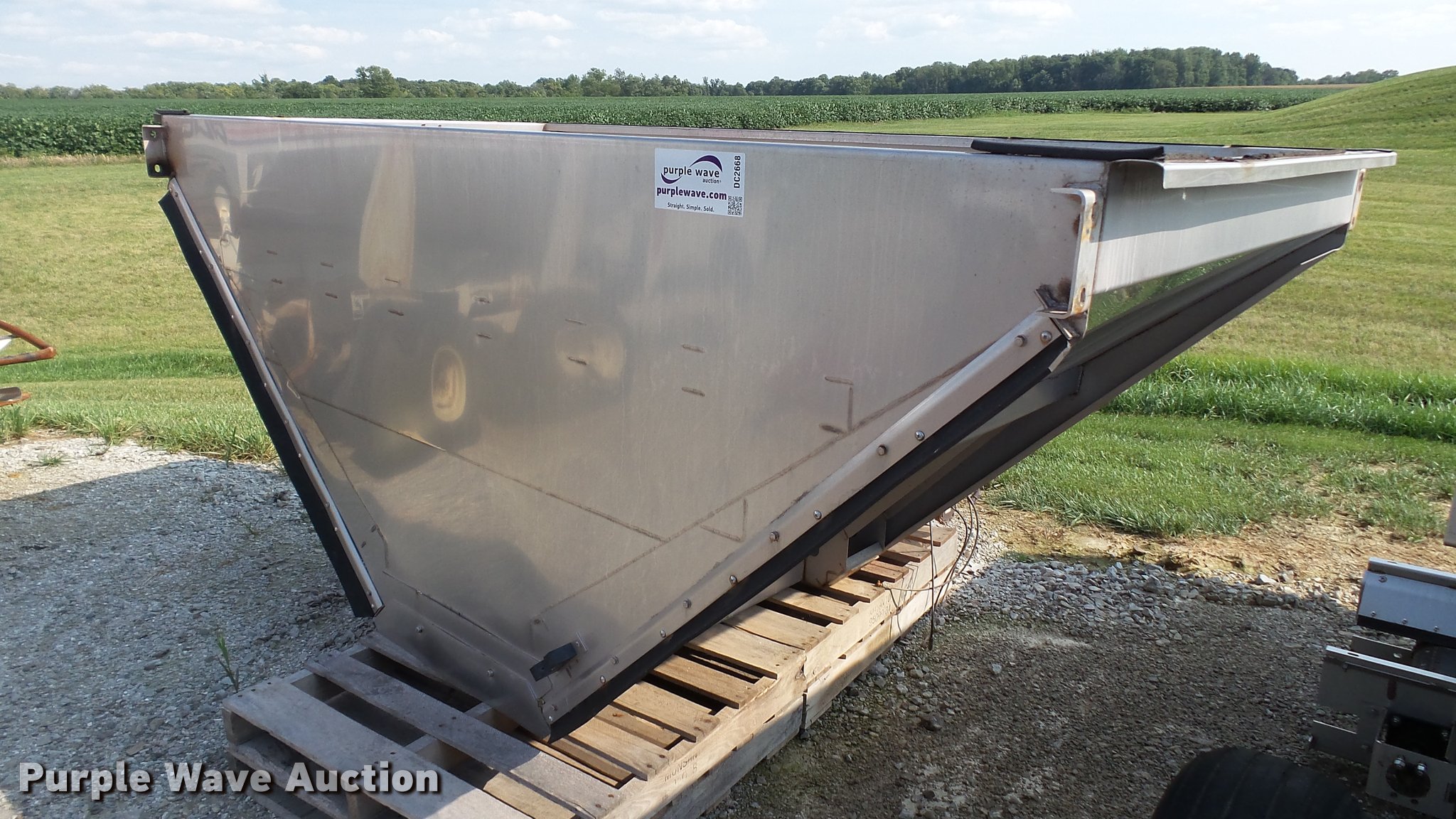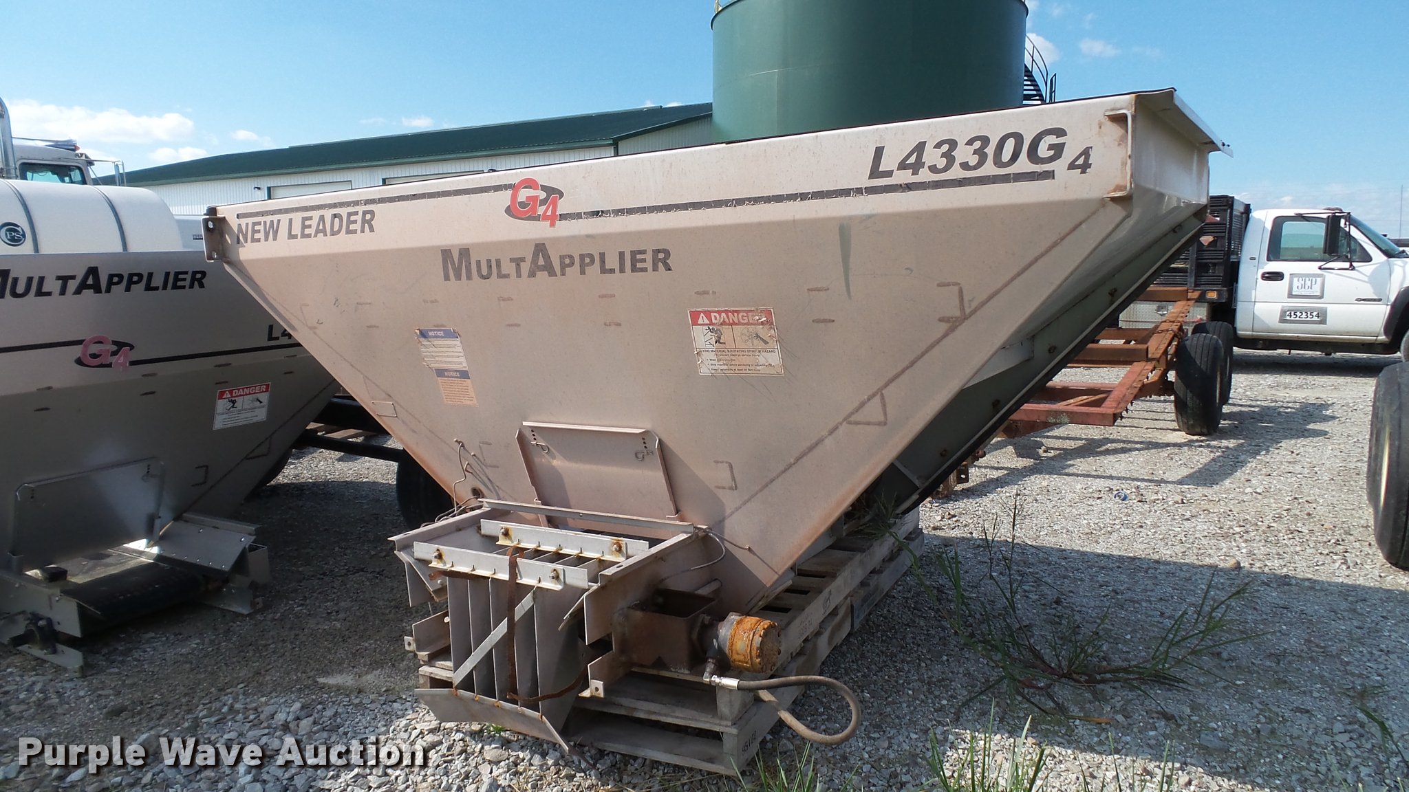 Purple Wave is selling a used Applicator Attach. in Indiana. This item is a New Leader L4330G4 MultApplier stainless steel spreader box with the following: 62"L x 121"W, 18"W belt, Hydraulic operation, Serial 138777