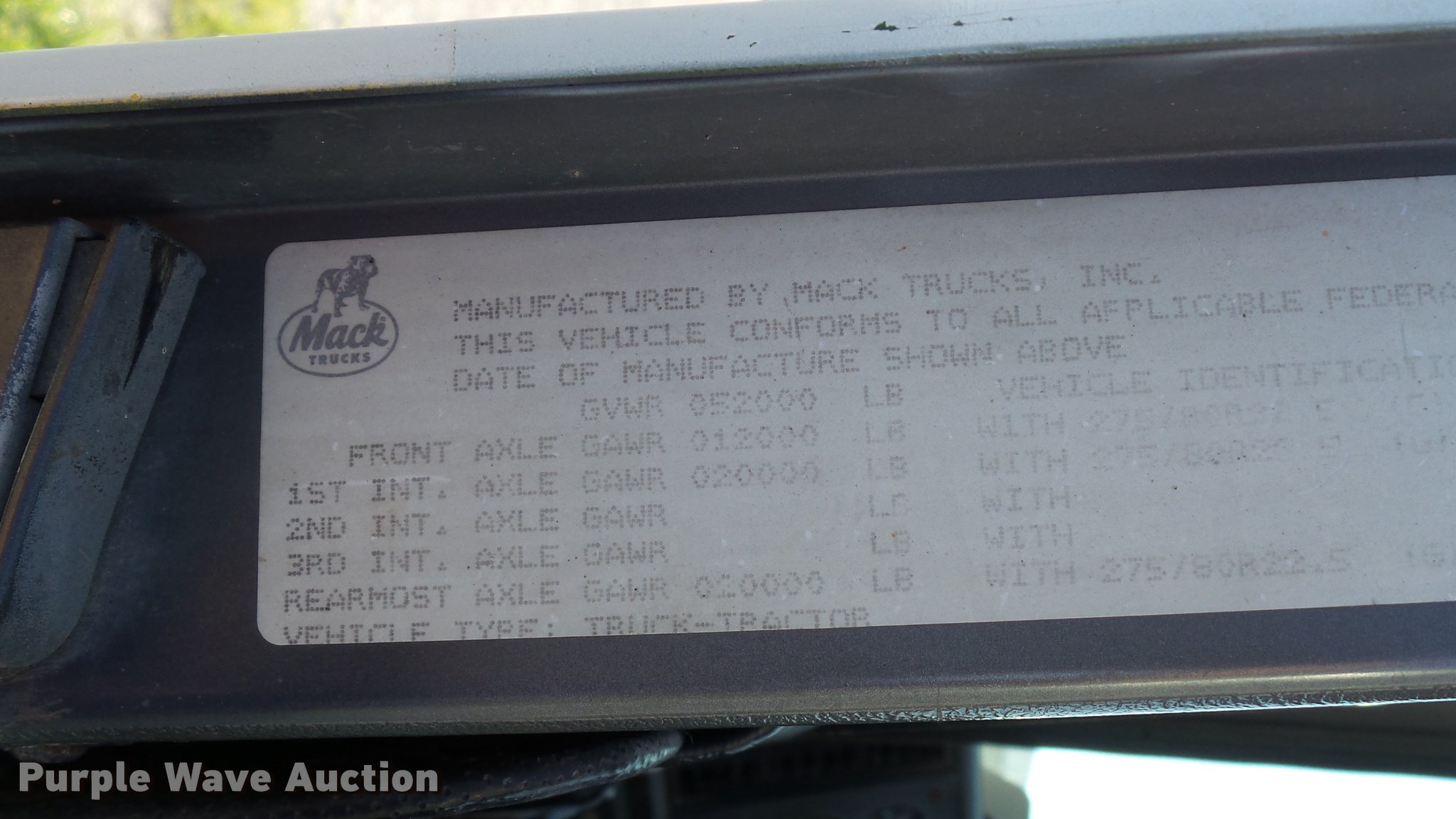 Purple Wave is selling a used Truck Chassis in Indiana. This item is a 1996 Mack CH613 truck cab and chassis with the following: 18,735 miles on odometer, 3,090 hours on meter, Mack E7 12.0L L6 turbo diesel engine, 350 HP, Serial 5N1967, Eaton Fuller nine speed manual transmission, Tandem axle, Inter-axle differential lock, Heat, Tilt, Cruise, AM/FM/cassette, Heated mirrors, Air suspension seat, Air ride cab, Block heater, PTO, Front tow hooks, Single rear exhaust stack, Single fuel tank, Air suspension, Air brakes, Engine brake, 200" wheelbase, 10R22.5 front tires, 11R22.5 rear tires, GVWR 52,000 lbs, FAWR 12,000 lbs, IAWR 20,000 lbs, RAWR 20,000 lbs, Decals will be removed prior to auction, Driver side door will not latch, Unit# 51886