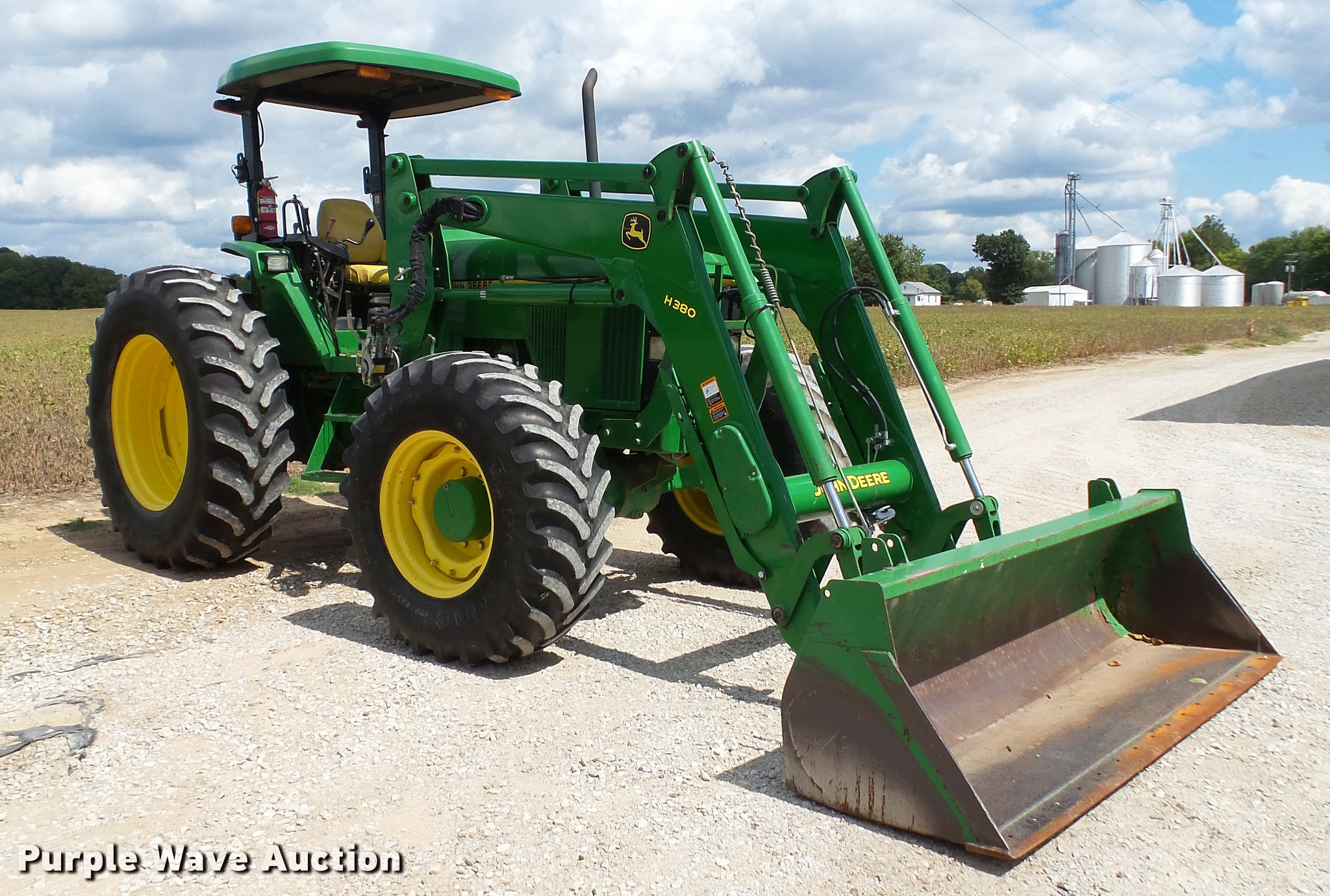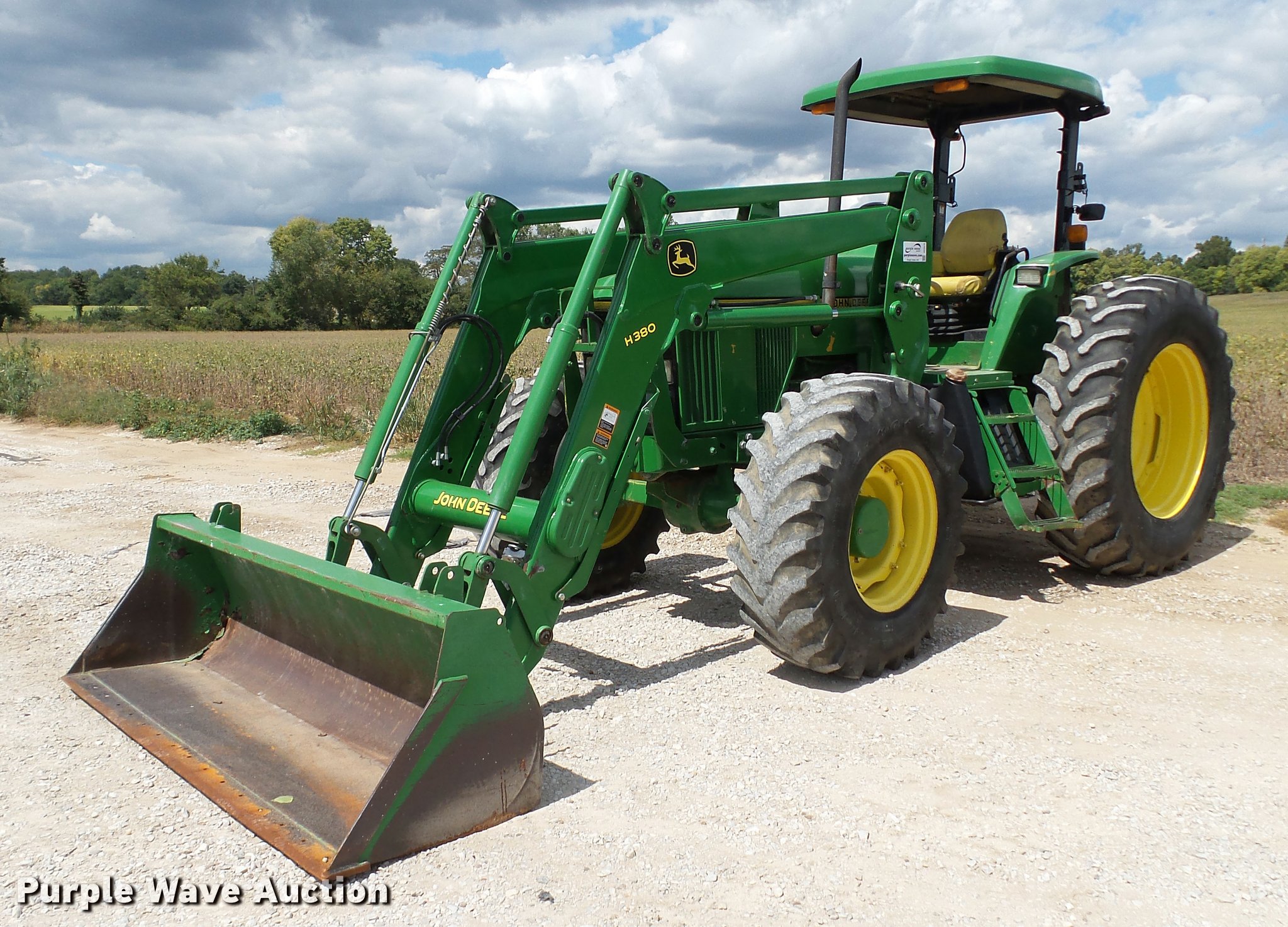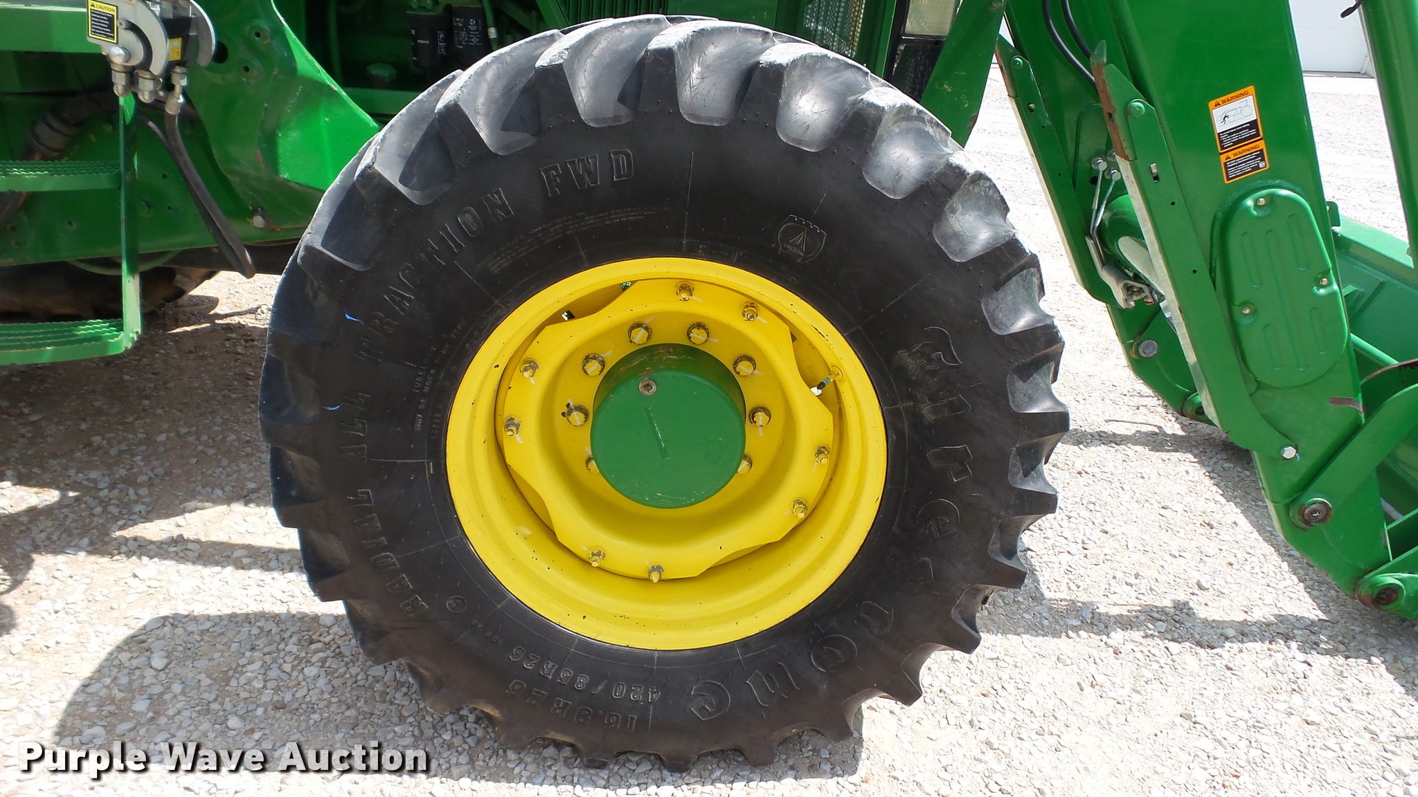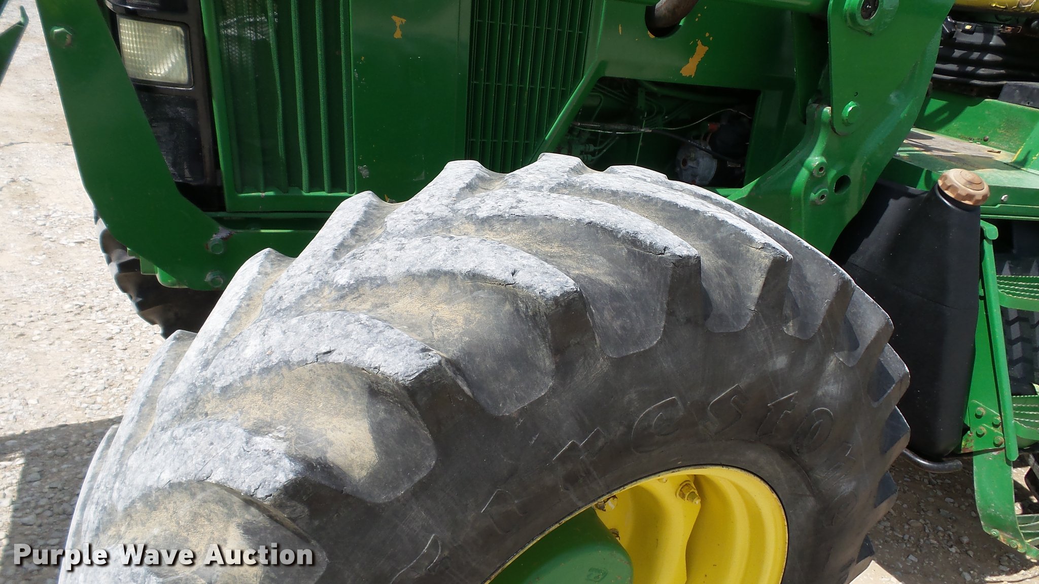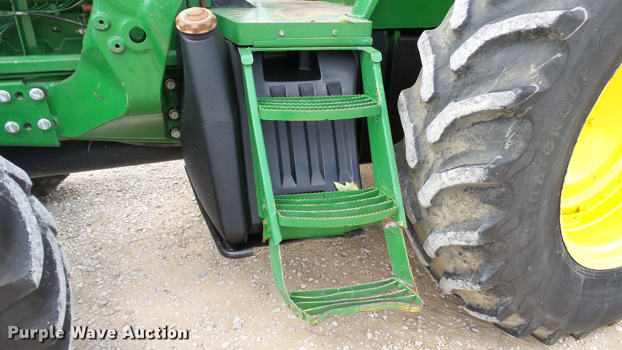 Purple Wave is selling a used Tractor in Indiana. This item is a 1995 John Deere 7200 MFWD tractor with the following: 5,574 hours on meter, John Deere six cylinder turbo diesel engine, Quad-Range transmission, 16F-16R gears, Tilt steering wheel, Suspension seat, Shade, John Deere H380 loader, 98"W bucket, Quick attach, Joystick controls, Serial 1P0H380XECC001985, Pallet forks, Three point, Seven pin outlet, 540 PTO, (2) rear hydraulic remotes, Firestone 16.9R26 front tires, Goodyear 520/85R38 rear tires, Serial RW7200H003341, Unit# 23067, 102294