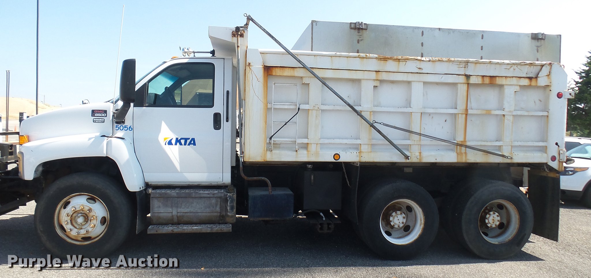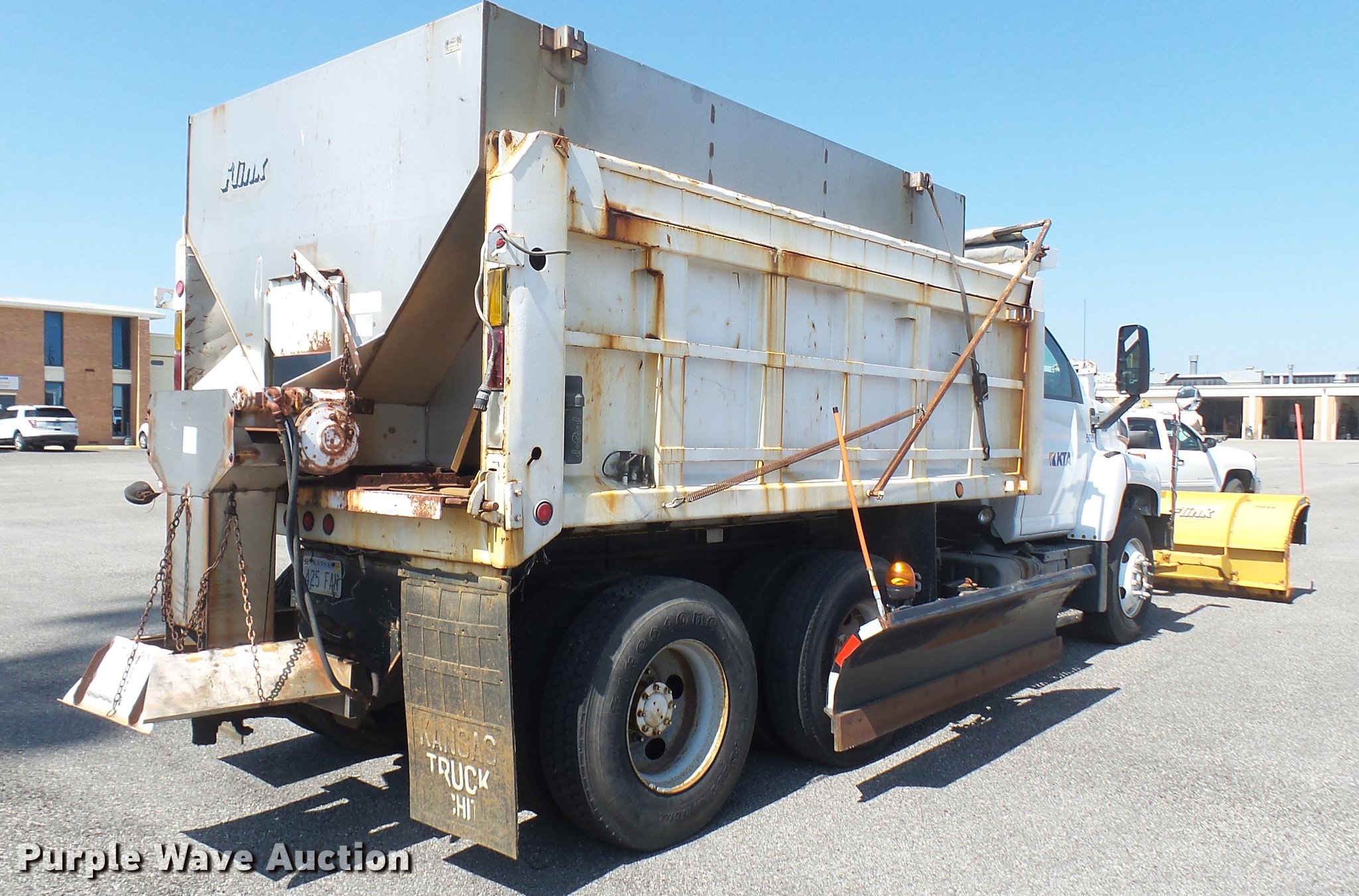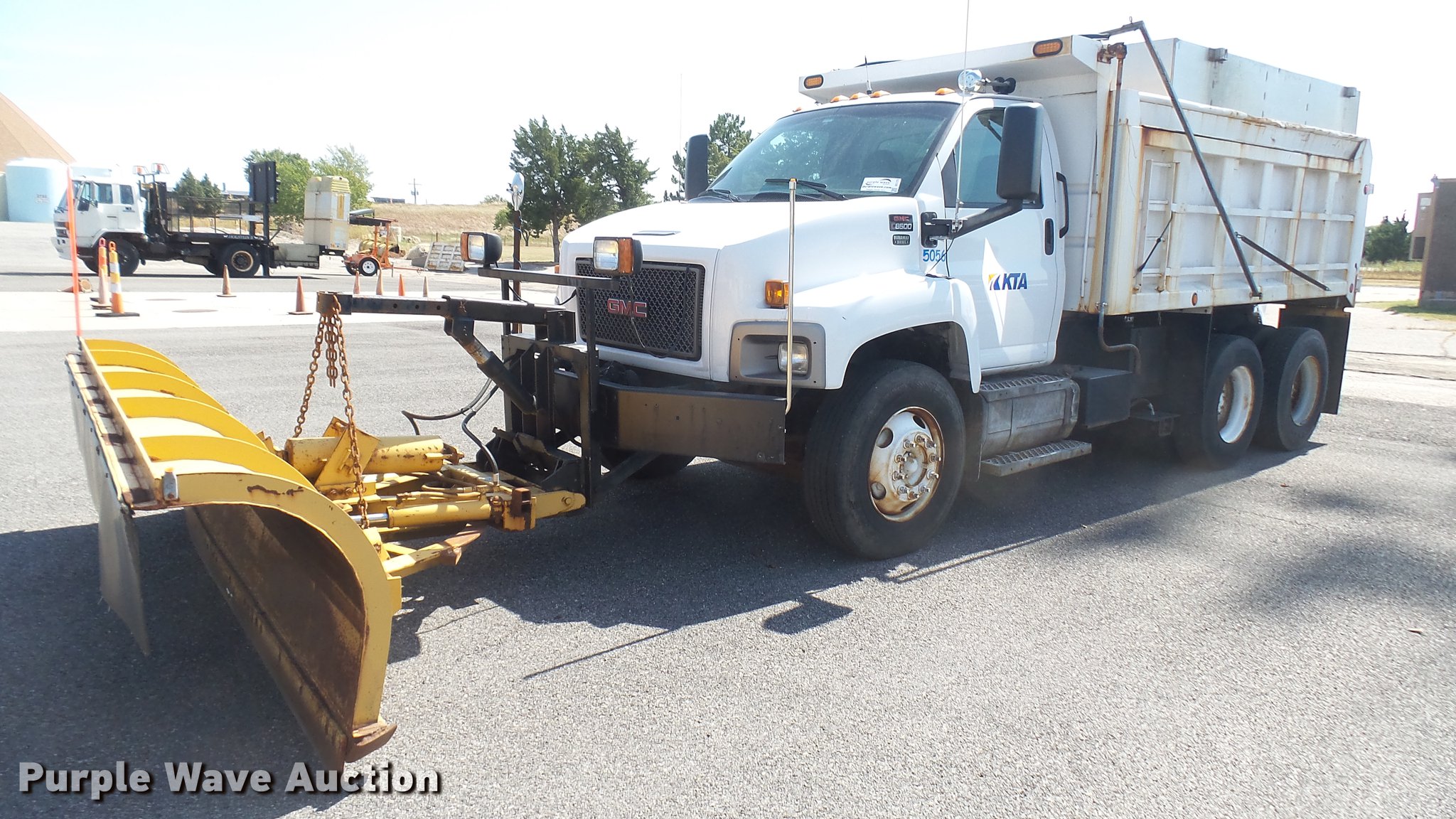 Purple Wave is selling a used Construction Dump Truck in Kansas. This item is a 2006 GMC C8500 dump truck with the following: 67,462 miles on odometer, 3,843 hours on meter, Isuzu 6HK1-TC 7.8L six cylinder diesel engine, Automatic transmission, Tandem axle, Inter-axle differential lock, AC and heat, AM/FM, Power windows, 14'L x 96"W steel dump bed, 48" side board height, End gate included, Flink 11'W plow, Flink stainless steel spreader, 11'L, 8'W side plow, Dual fuel tanks, Pintle hitch, Air brakes, 11R22.5 tires, GVWR 23,745 lbs, FAWR 12,350 lbs, IAWR 20,000 lbs, RAWR 20,000 lbs, Unit# 5056