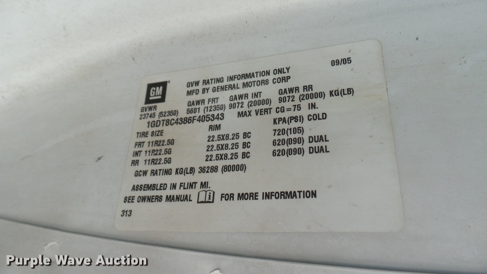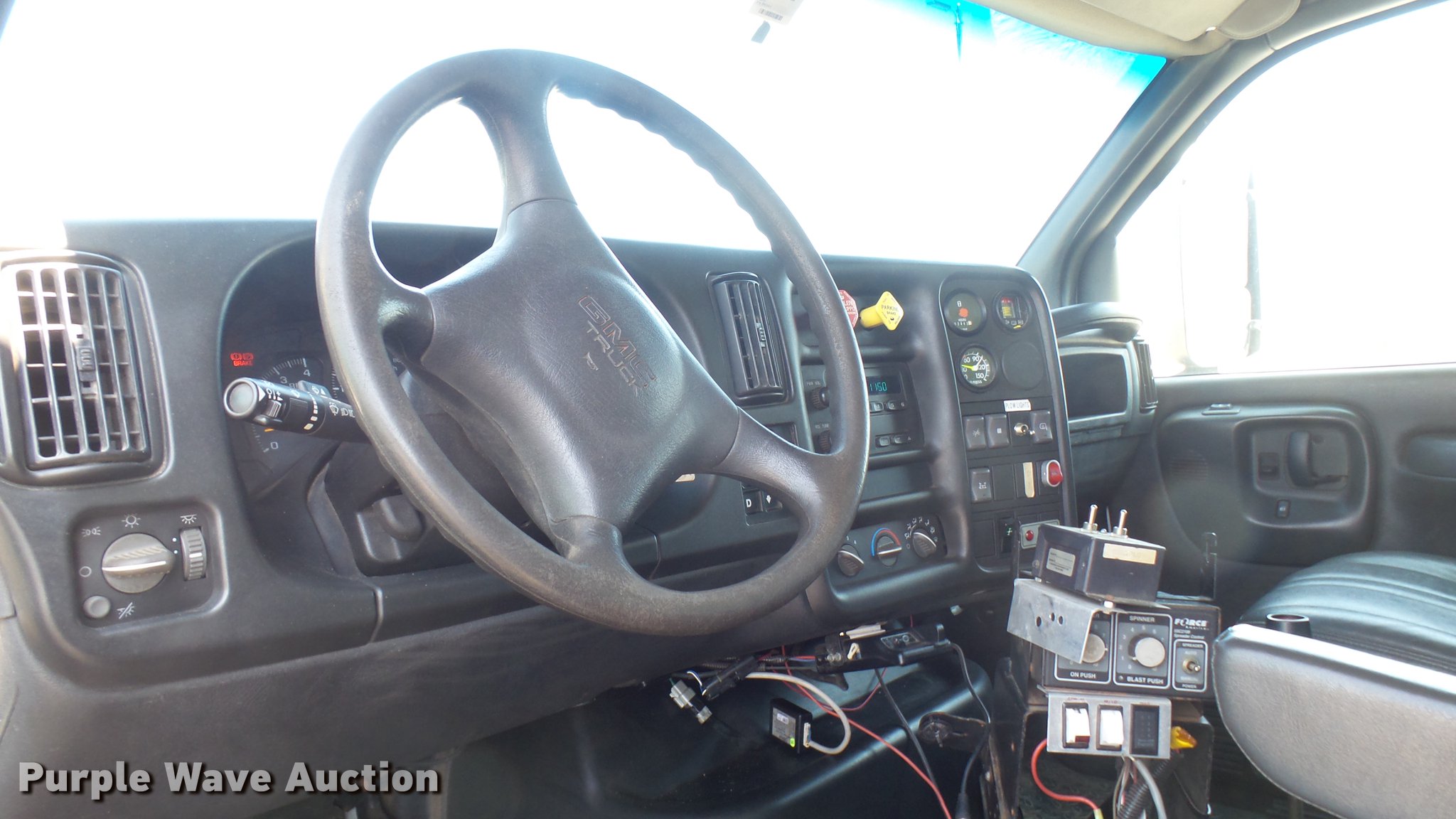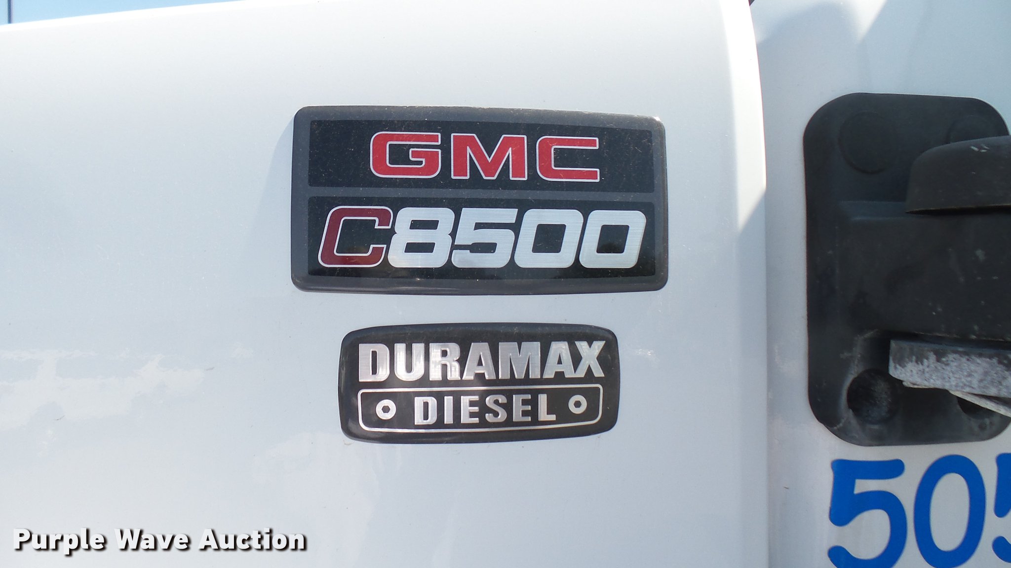 Purple Wave is selling a used Construction Dump Truck in Kansas. This item is a 2006 GMC C8500 dump truck with the following: 67,462 miles on odometer, 3,843 hours on meter, Isuzu 6HK1-TC 7.8L six cylinder diesel engine, Automatic transmission, Tandem axle, Inter-axle differential lock, AC and heat, AM/FM, Power windows, 14'L x 96"W steel dump bed, 48" side board height, End gate included, Flink 11'W plow, Flink stainless steel spreader, 11'L, 8'W side plow, Dual fuel tanks, Pintle hitch, Air brakes, 11R22.5 tires, GVWR 23,745 lbs, FAWR 12,350 lbs, IAWR 20,000 lbs, RAWR 20,000 lbs, Unit# 5056