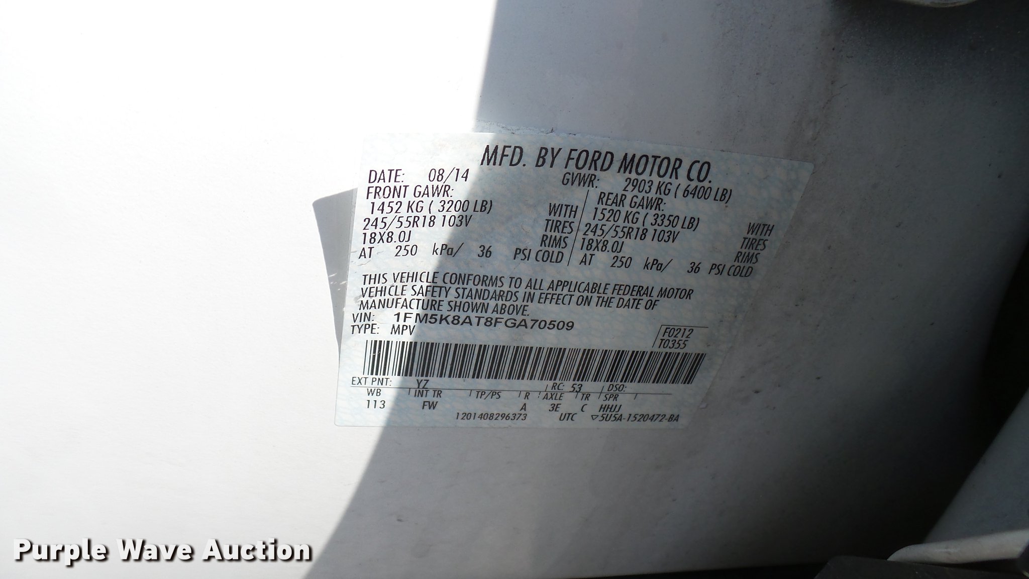 2015 Ford Explorer Police Interceptor SUV. 125,392 miles on odometer, 3.5L V6 DOHC 24V gas engine, Automatic transmission, AC and heat, Tilt, Cruise, AM/FM/CD, Power windows, locks, mirrors, and seat, Cloth interior, 245/55R18 tires, Wheel cover missing, Check engine light on, Unit 5901. Kansas title. 1FM5K8AT8FGA70509. Kansas Turnpike Authority. 9401 E Kellogg Ave. Wichita, KS 67207