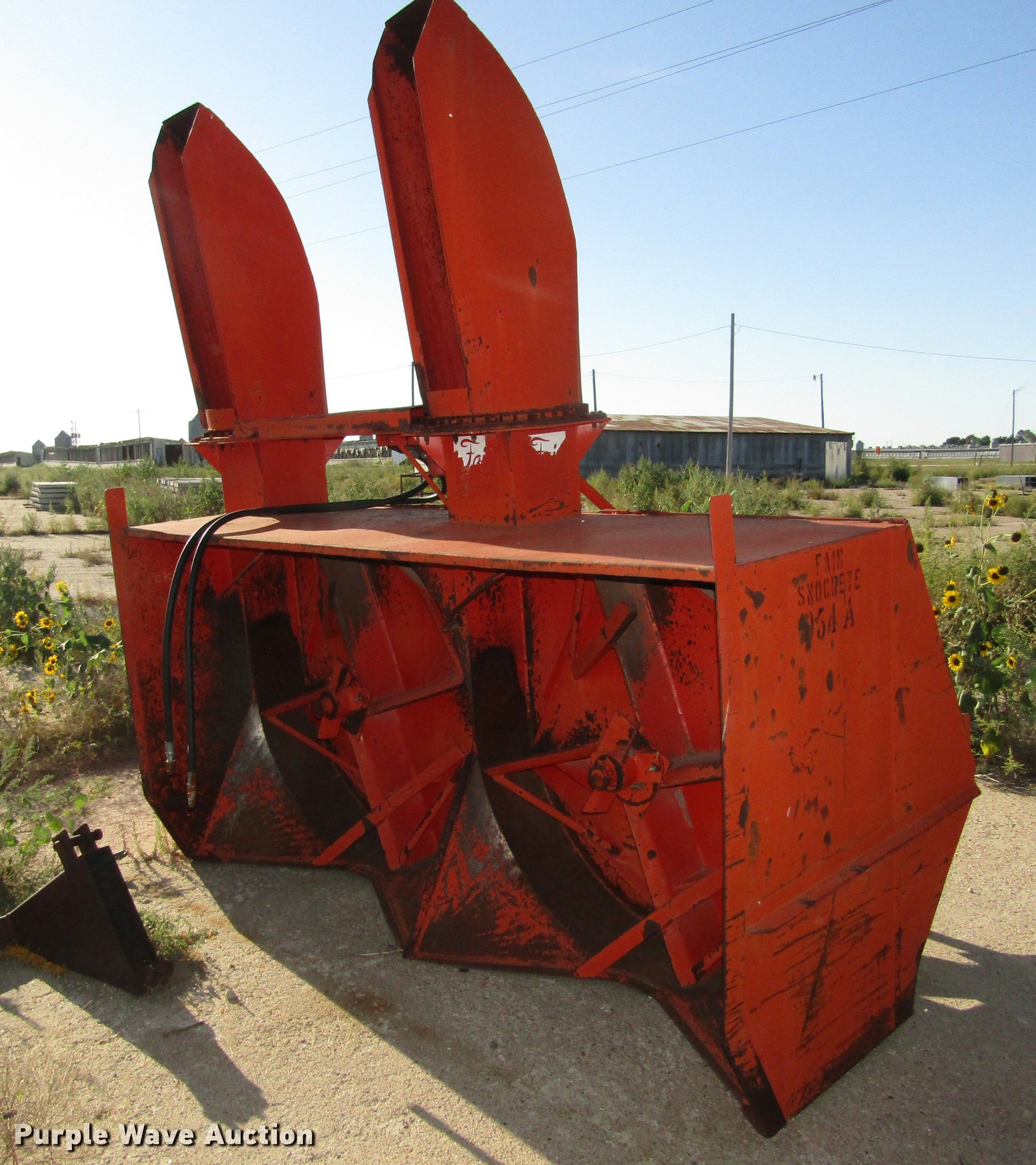 Purple Wave is selling a used Ag Equip. Other in Nebraska. This item is a Fair 954A Snowcrete snowblower with the following: 9'W I.D., (2) 53" diameter impellers, PTO driven, (2) adjustable skids, (2) 48"L x 18"W chutes, (2) hydraulic hoses, male fittings, Additional hitch not included, End of PTO shaft missing, Serial 0126F