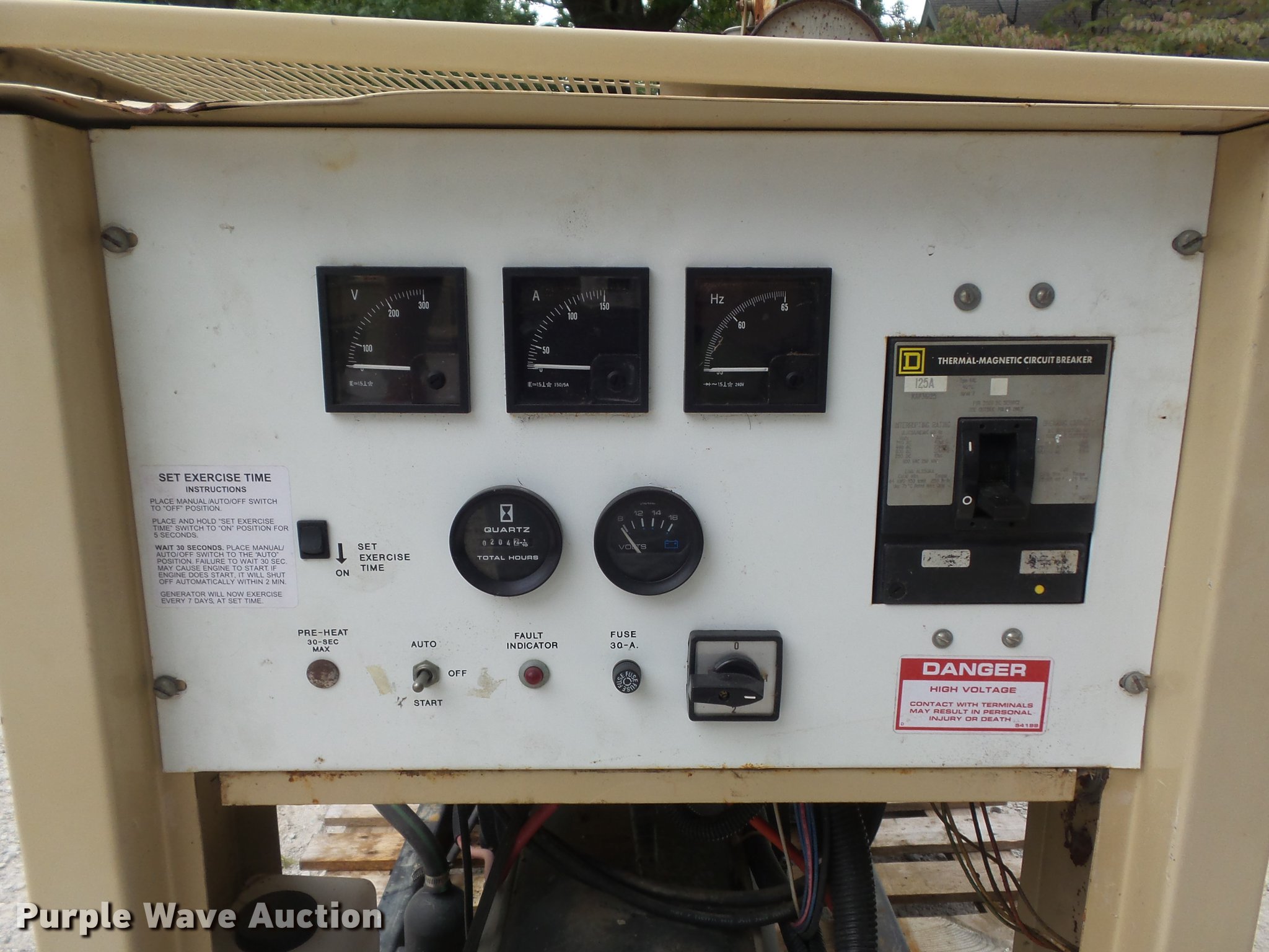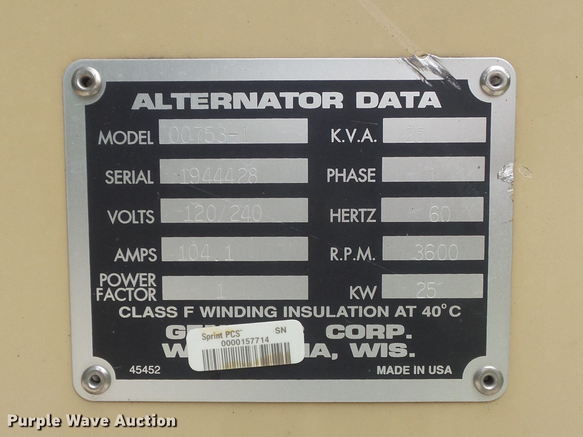 Purple Wave is selling a used Generator Set in Illinois. This item is a 1998 Generac 00753-1 generator with the following: 204 hours on meter, Fiat 97390 1.6L four cylinder propane engine, Control panel, 25,000 watts, 25 kVA, 25 kW, 3,600 RPM, 120/240v, 104 continuous amps at 240V, 60 Hz, 200 amp automatic transfer switch, Single phase, Skid mounted, No engine antifreeze, No battery, Serial 1944428