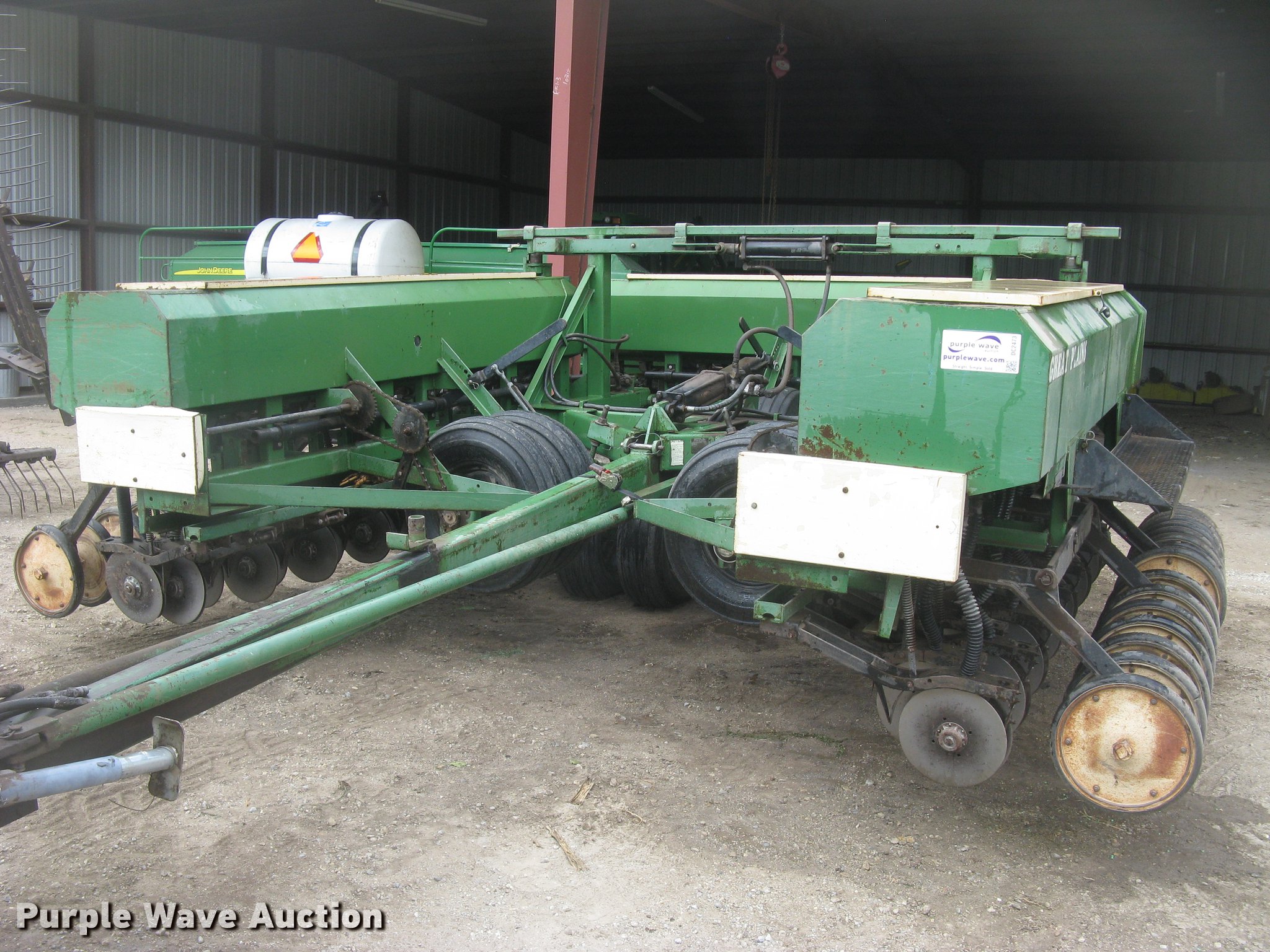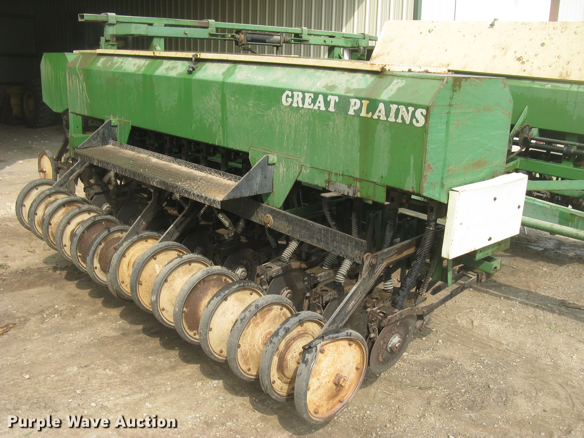 Purple Wave is selling a used Grain Drill or Seeder in Kansas. This item is a Great Plains 450881-DDS grain drill with the following: 16,748 acres on hub meter, 30'W, 45 total row units, 8" row spacing, Hydraulic front fold, Bulk fill system, Ground meter drive, Double disk openers, Single rubber closing system, Pin hitch, (4) 9.5L-15 outside tires, (4) 9.5L-15 transport tires, 9.5L-15 drive tire, Manual, Serial GP-2646