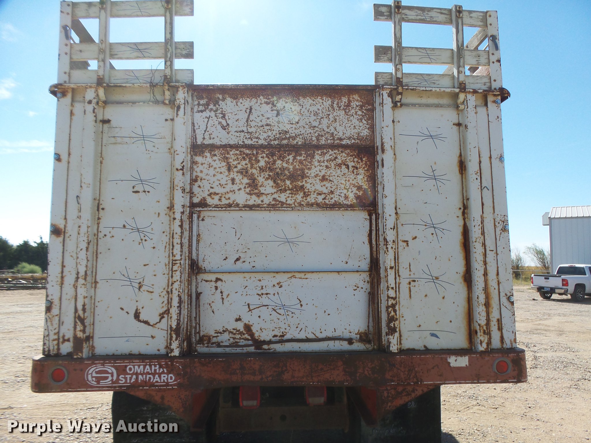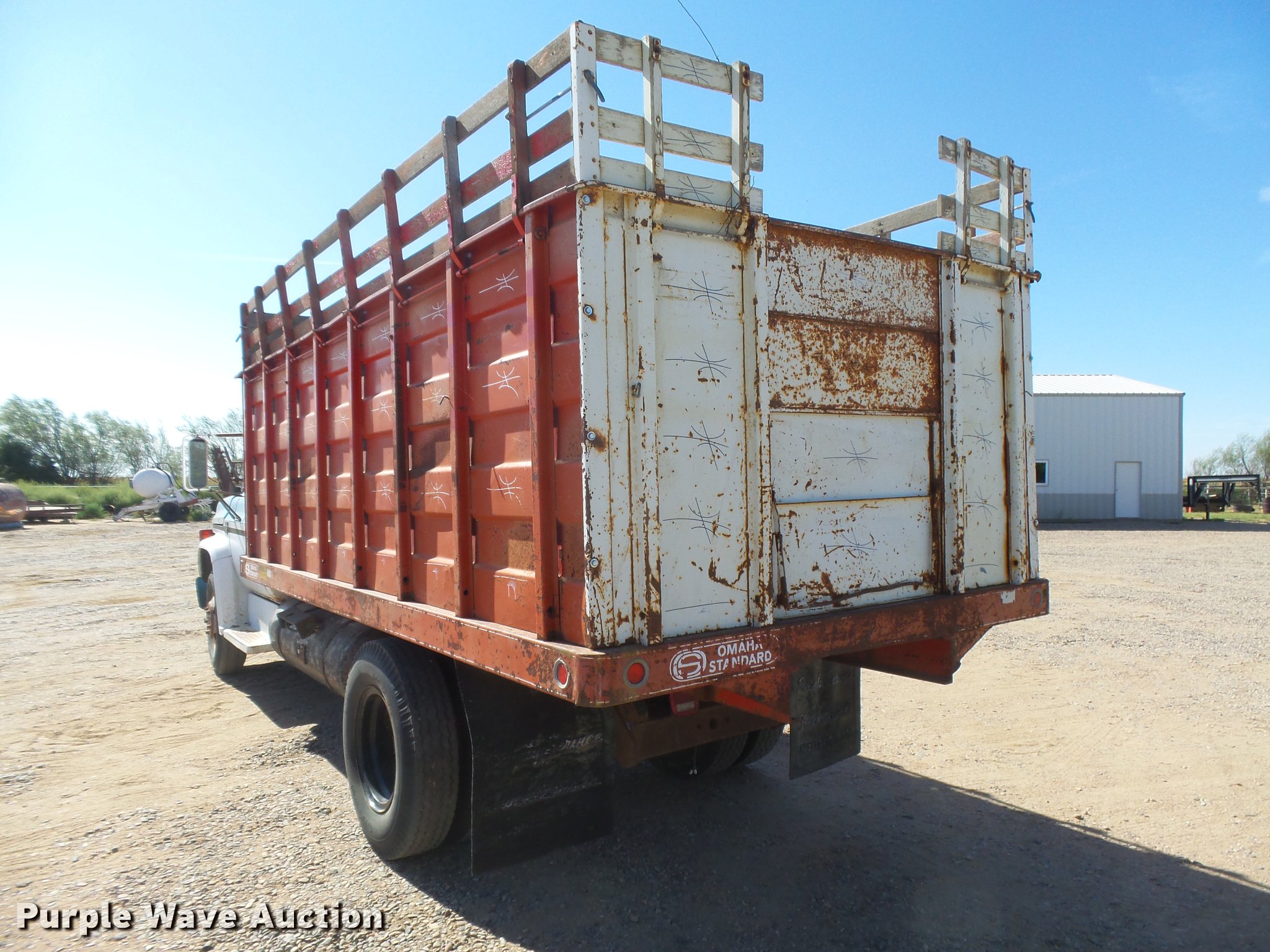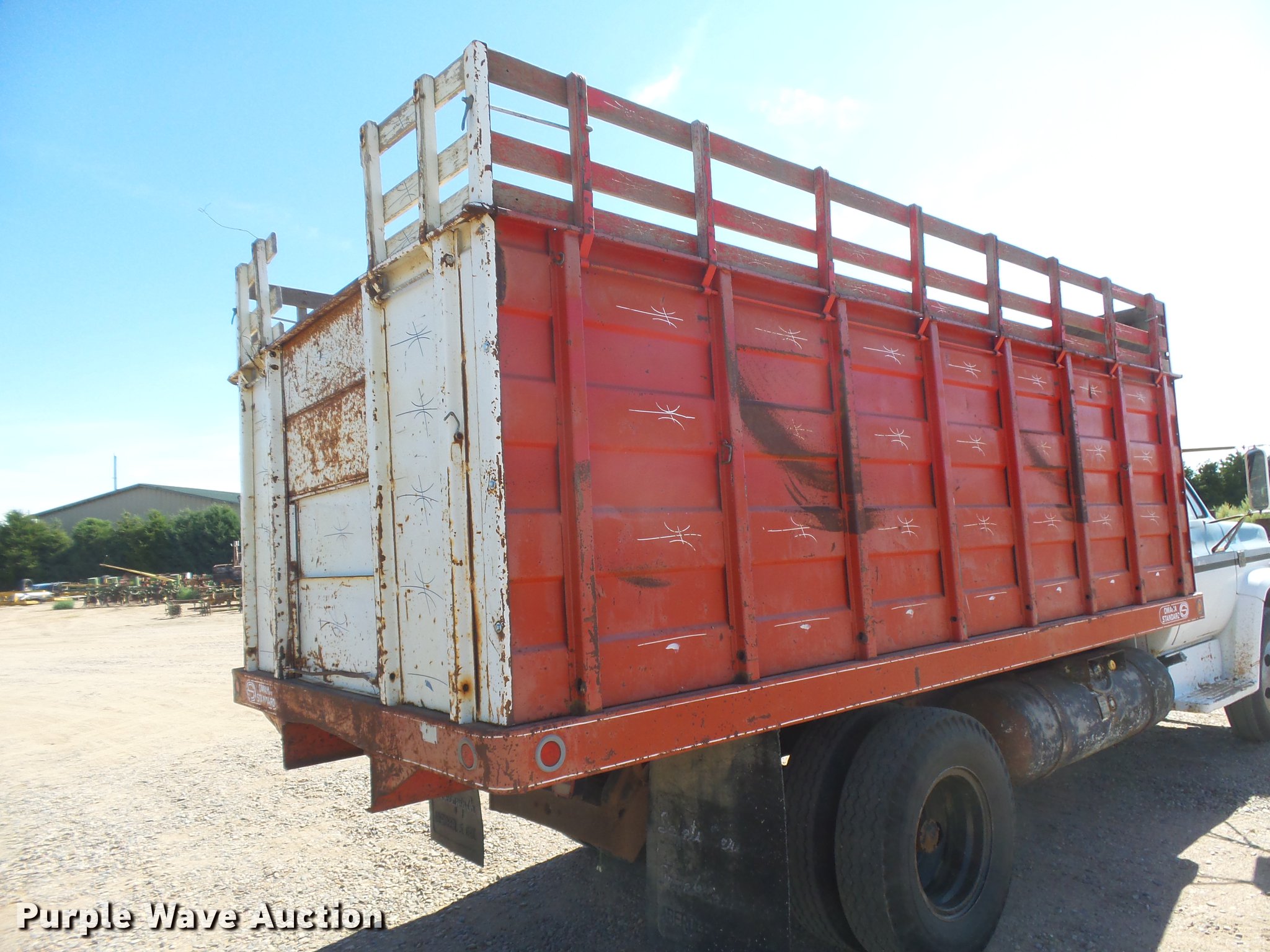 Purple Wave is selling a used Grain Truck in Kansas. This item is a 1976 Chevrolet C60 grain truck with the following: 82,979 miles on odometer, Chevrolet eight cylinder dual fuel engine, Gas or propane capable, Four speed manual transmission, Two speed rear end, Heat, AM, Suspension seat, PTO, Omaha Standard steel grain bed, 16'L x 94"W, 52" side height, 18" side board height, Manual end gate, Dual ram hoist, Dual fuel tanks, One for gas, One for propane, Spring suspension, 9.00-20 tires, GVWR 20,000 lbs, FAWR 5,000 lbs, RAWR 15,000 lbs