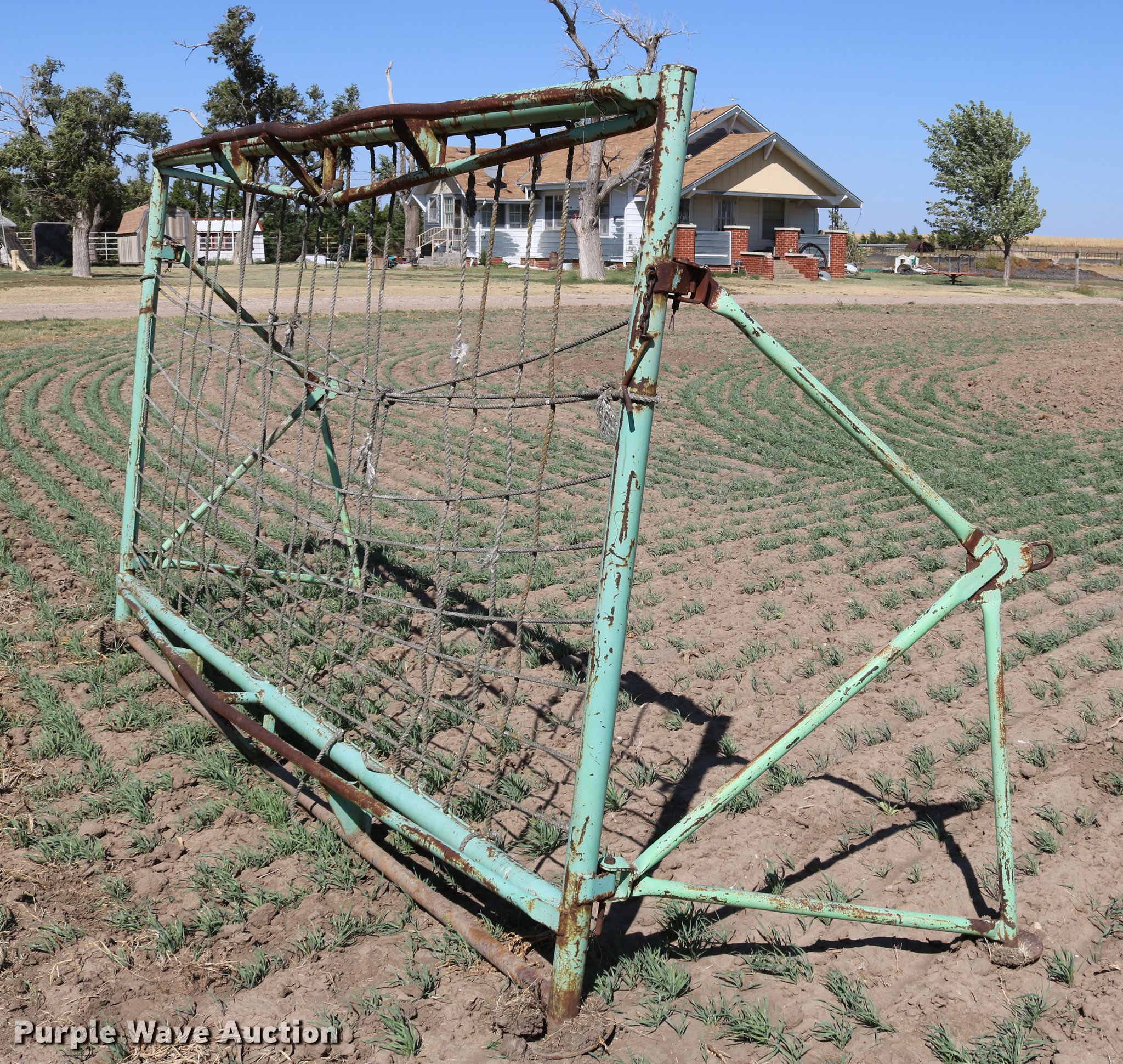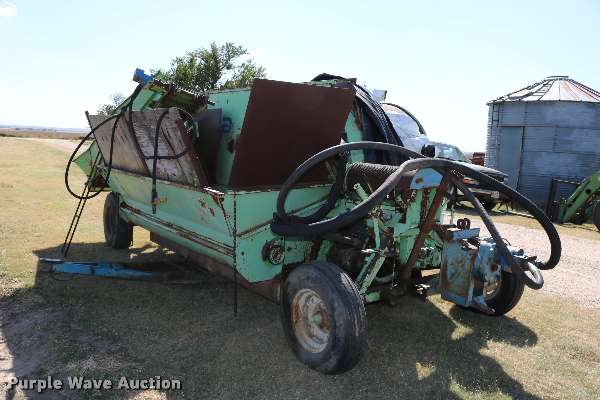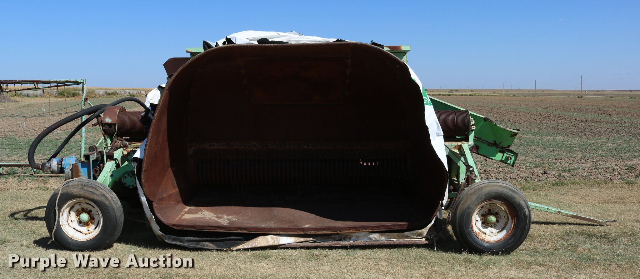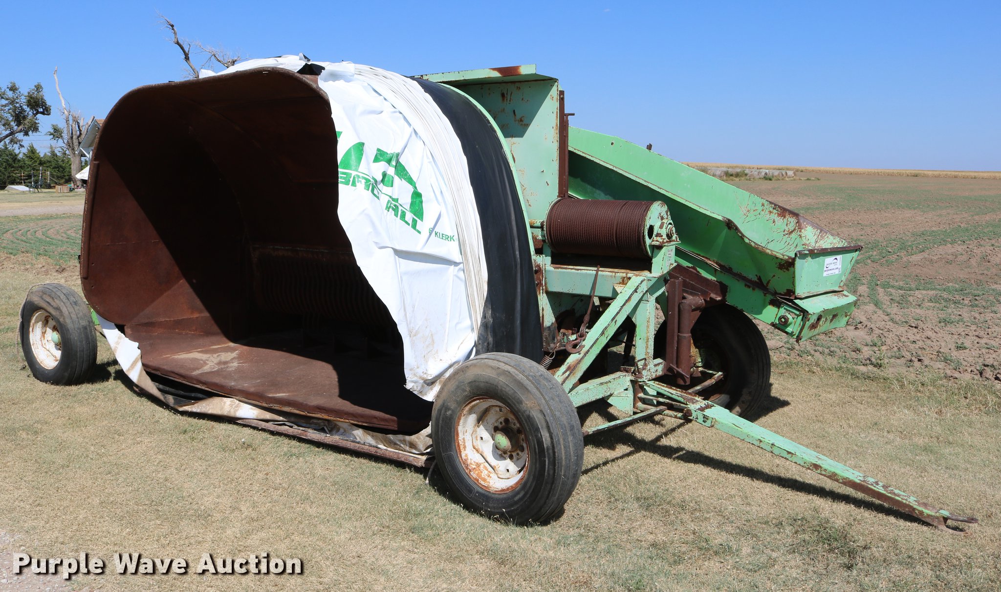 Ag Bagger silage bagger. Approx. 50' of bag, 9'W bag capacity, 90 degree wheel pivot, Back stop, 540 PTO, Three point, Clevis transport hitch, (4) 9.5L-15 tires. 1208 NW 90 Rd. Olmitz, KS 67564