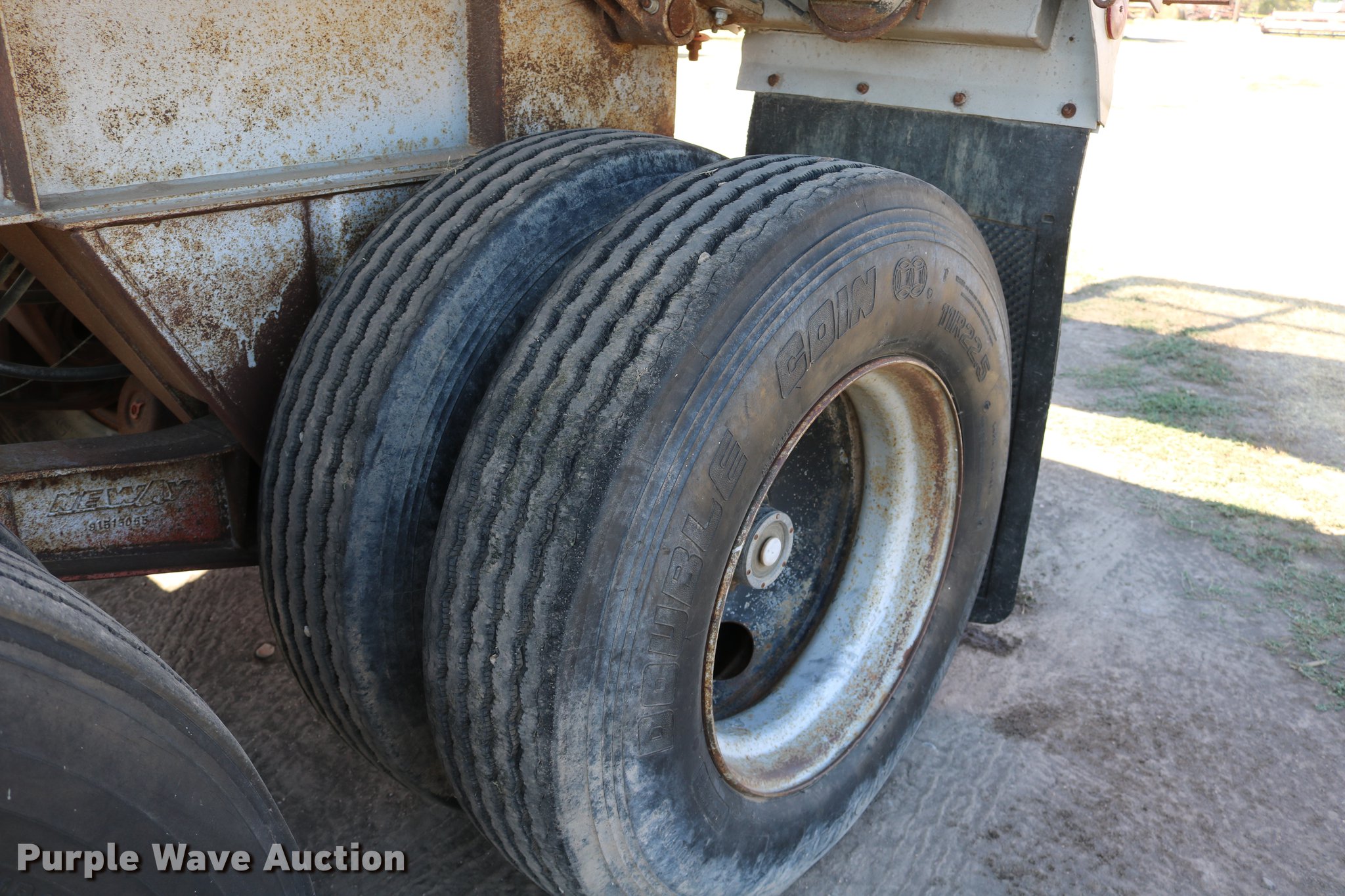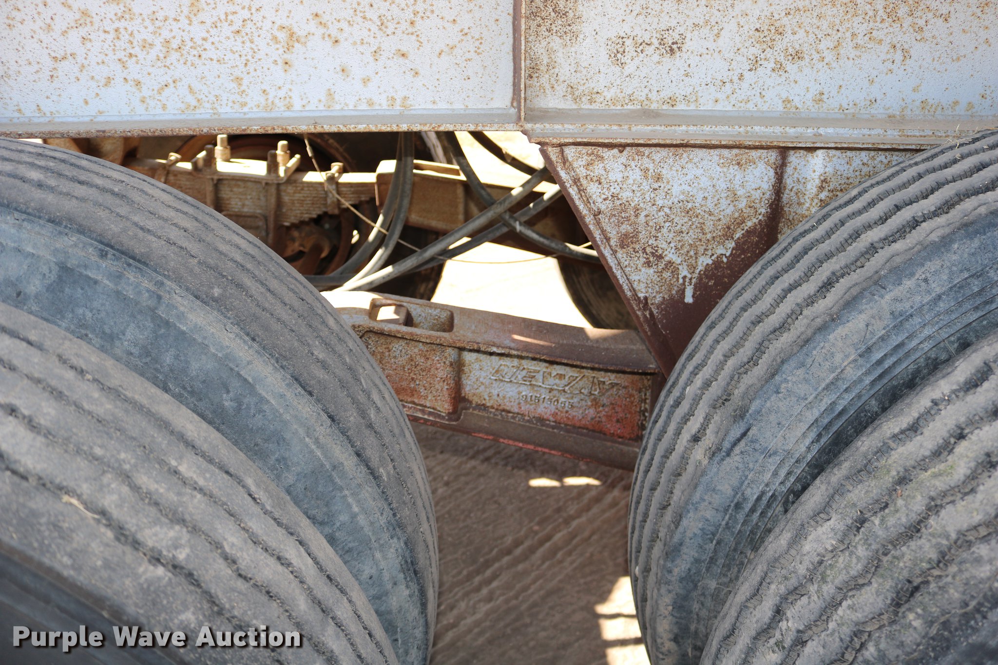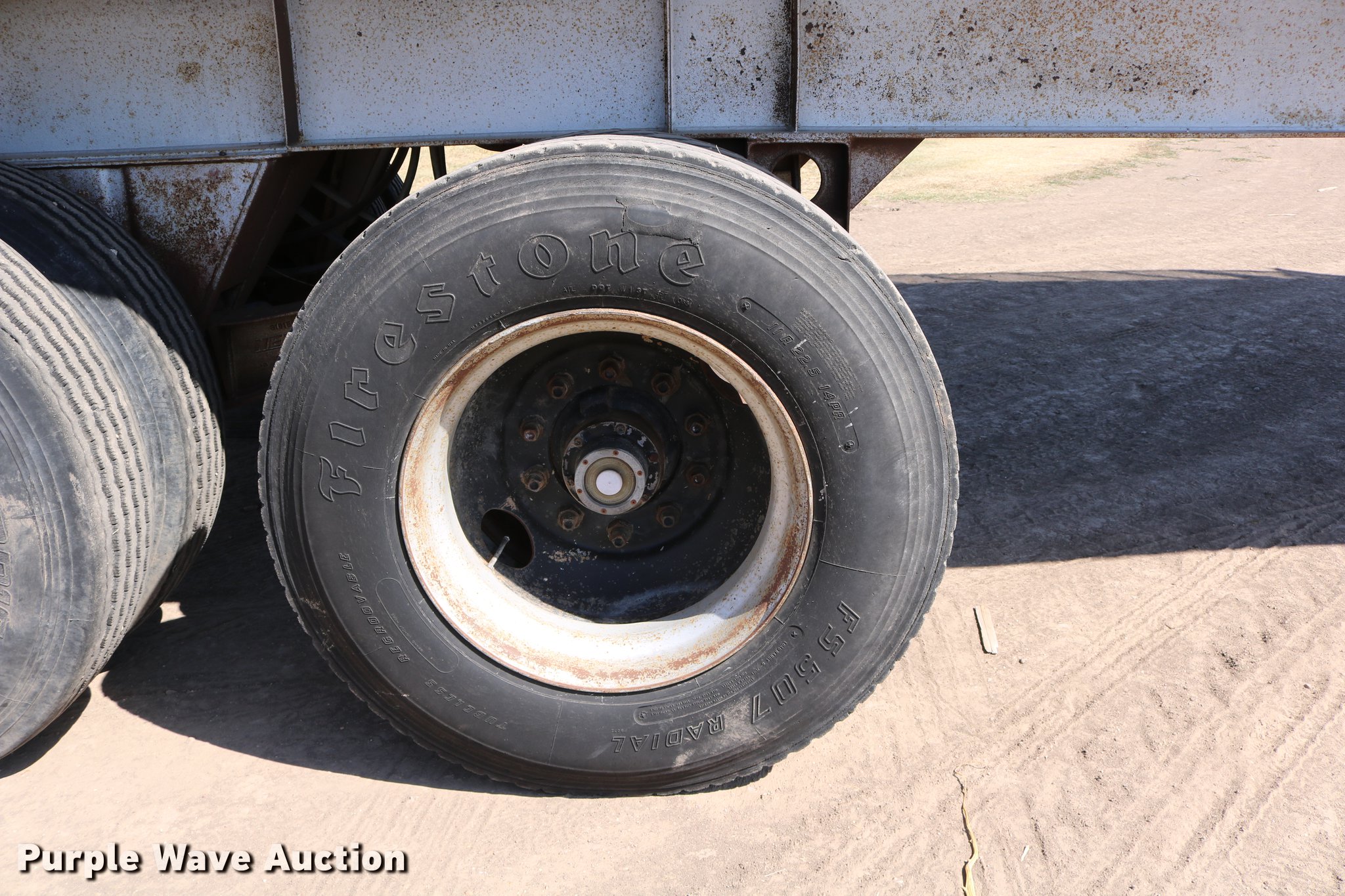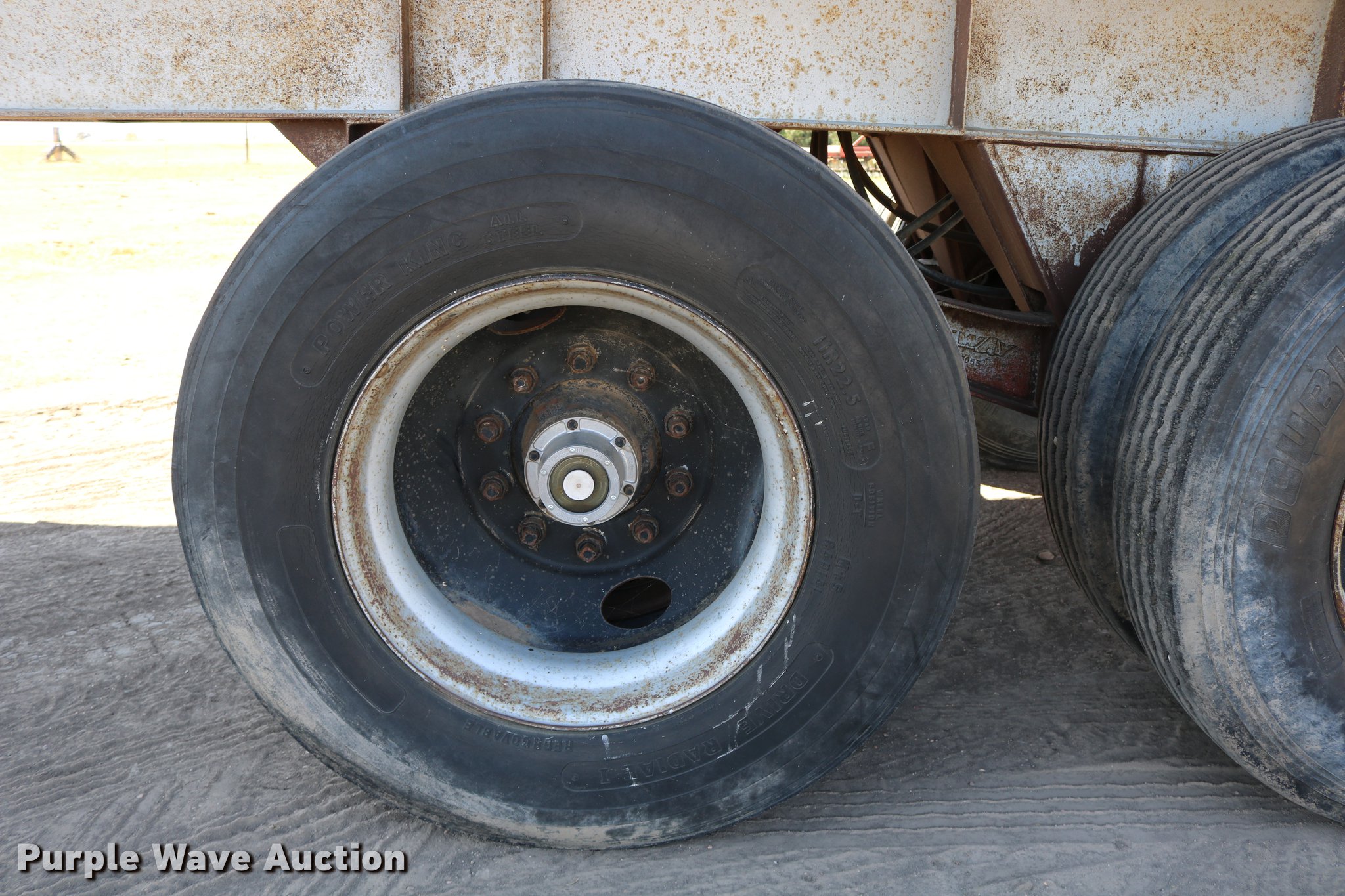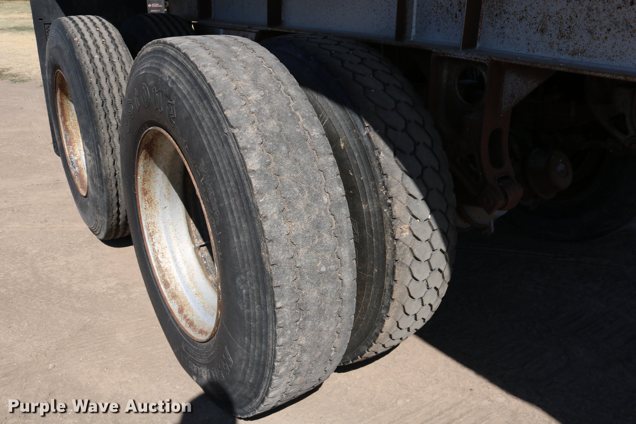 Purple Wave is selling a used Grain or Commodity Trailer in Kansas. This item is a 1982 Schertzer 35CD commodity dump trailer with the following: 41.5'L x 96"W overall, 40'L bed, 63" side height, 2' side board height, 58" floor height, Air operated end gate, Single hydraulic cylinder, Poly bed liner, Fifth wheel plate, Dual leg two speed landing gear, Spring suspension, Air brakes, Tandem axle, Steel wheels, 11R22.5 tires, GVWR 63,000 lbs, GAWR 19,000 lbs