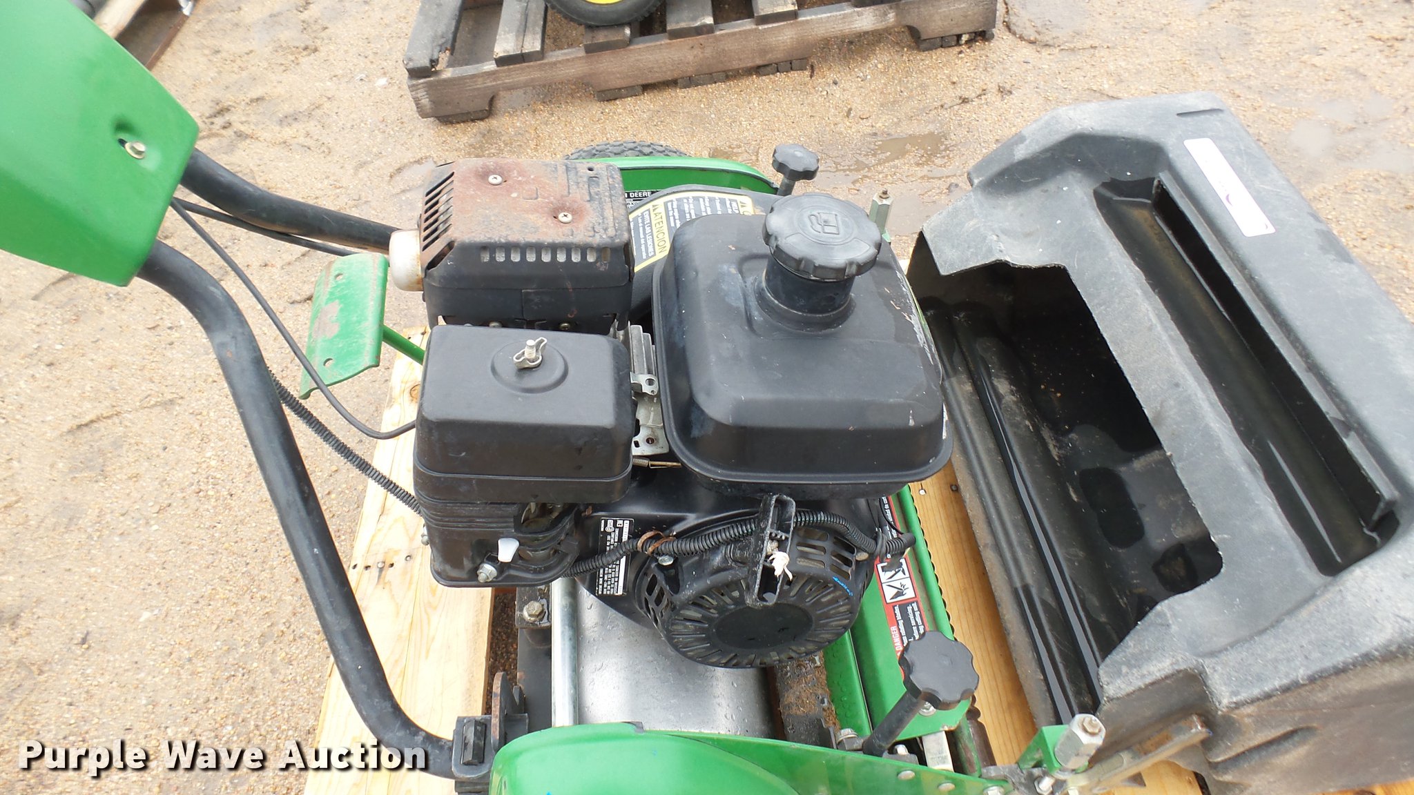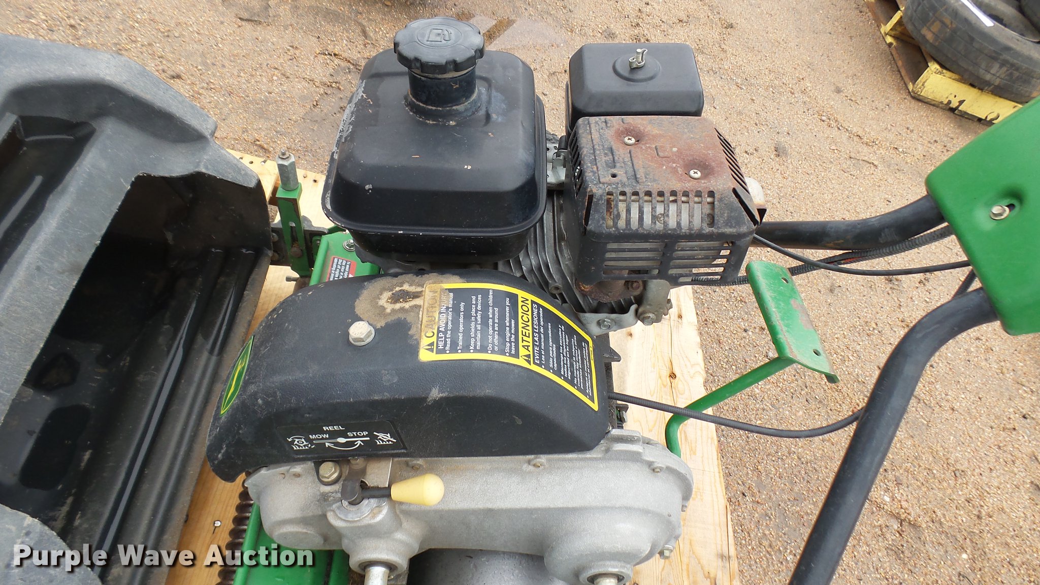 Purple Wave is selling a used Lawn Mower in Kansas. This item is a John Deere 220B greens mower with the following: 22" cut, Honda 4 HP gas engine, Grass catcher, 4.10-6 NHS tires, Serial M0220BX020451