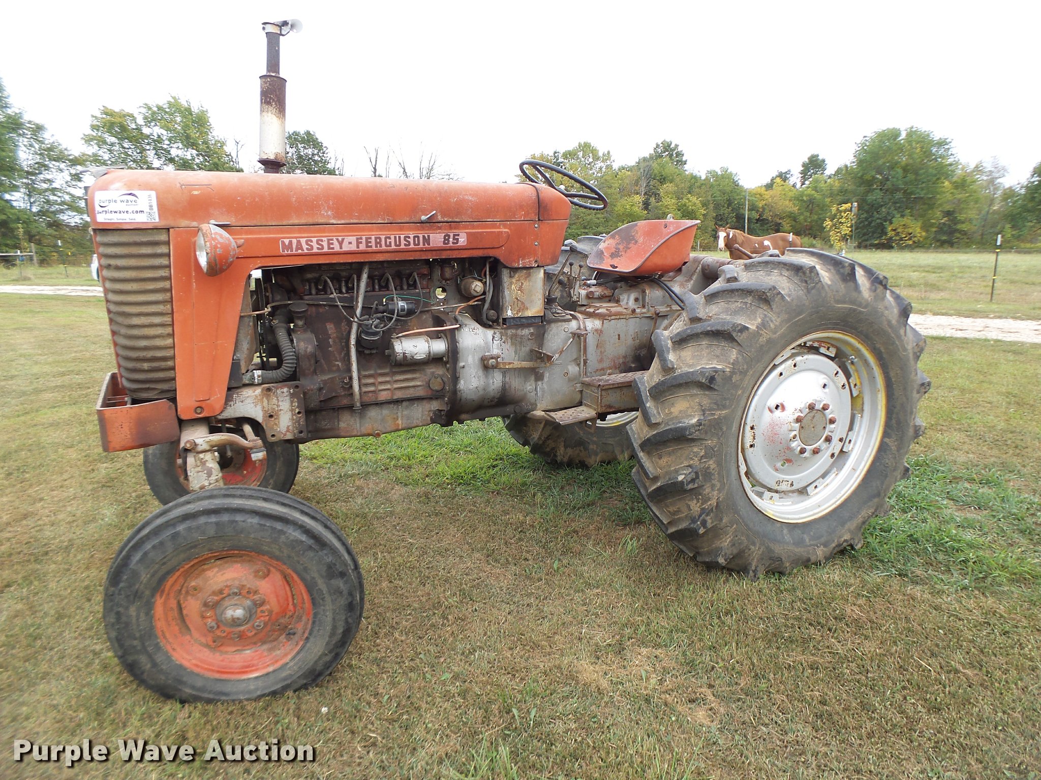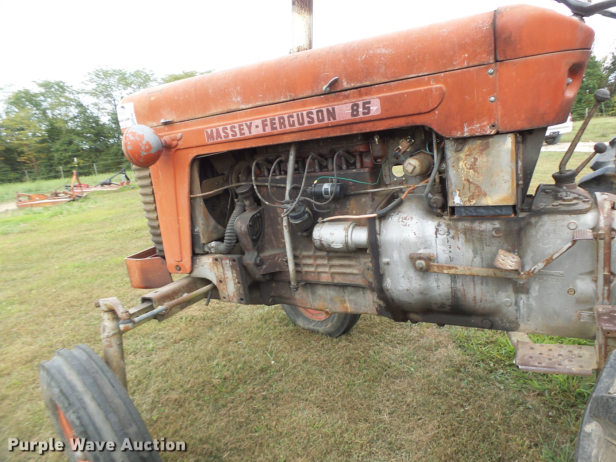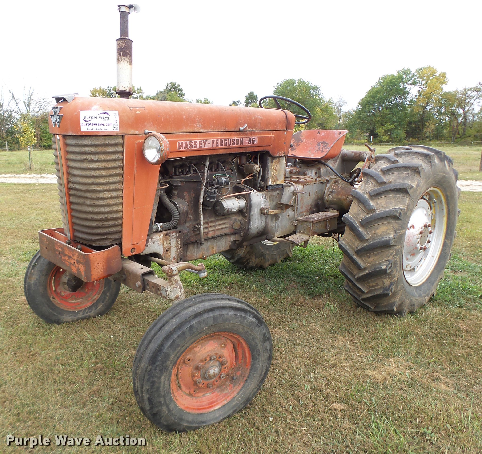 Purple Wave is selling a used Tractor in Missouri. This item is a Massey-Ferguson 85 tractor with the following: 6,859 hours on meter, Four cylinder gas engine, Manual transmission, 8F-2R gears, Suspension seat, Three point, 540 PTO, Rear hydraulic remote set, Adjustable front end width, 6.90-16 front tires, 16.9-30 rear tires, Serial 801617