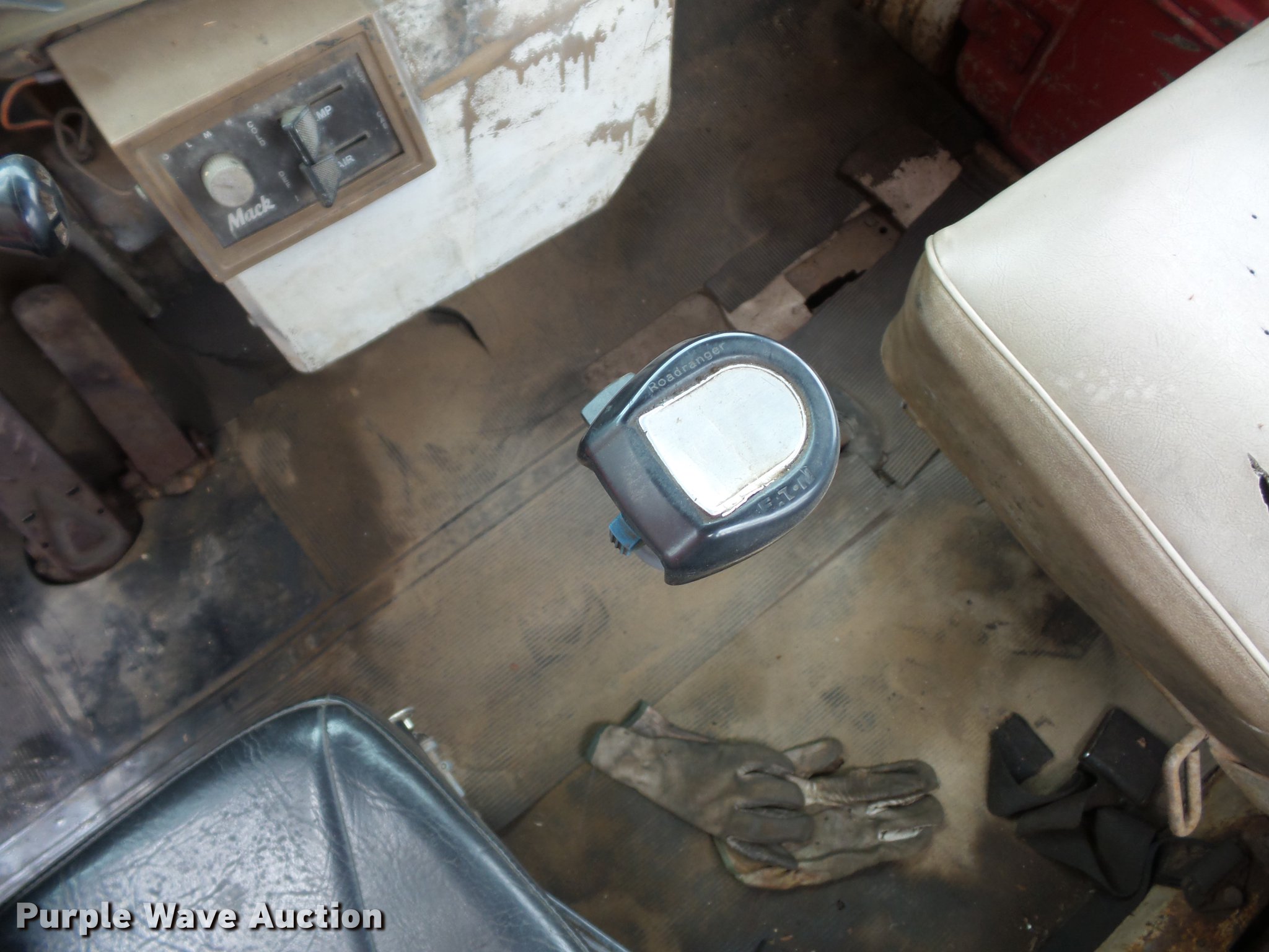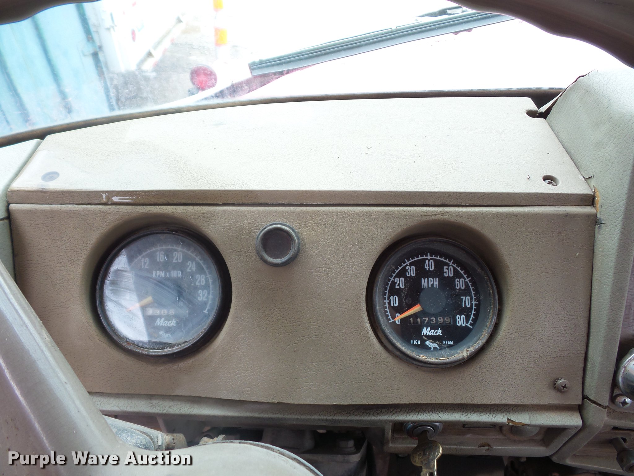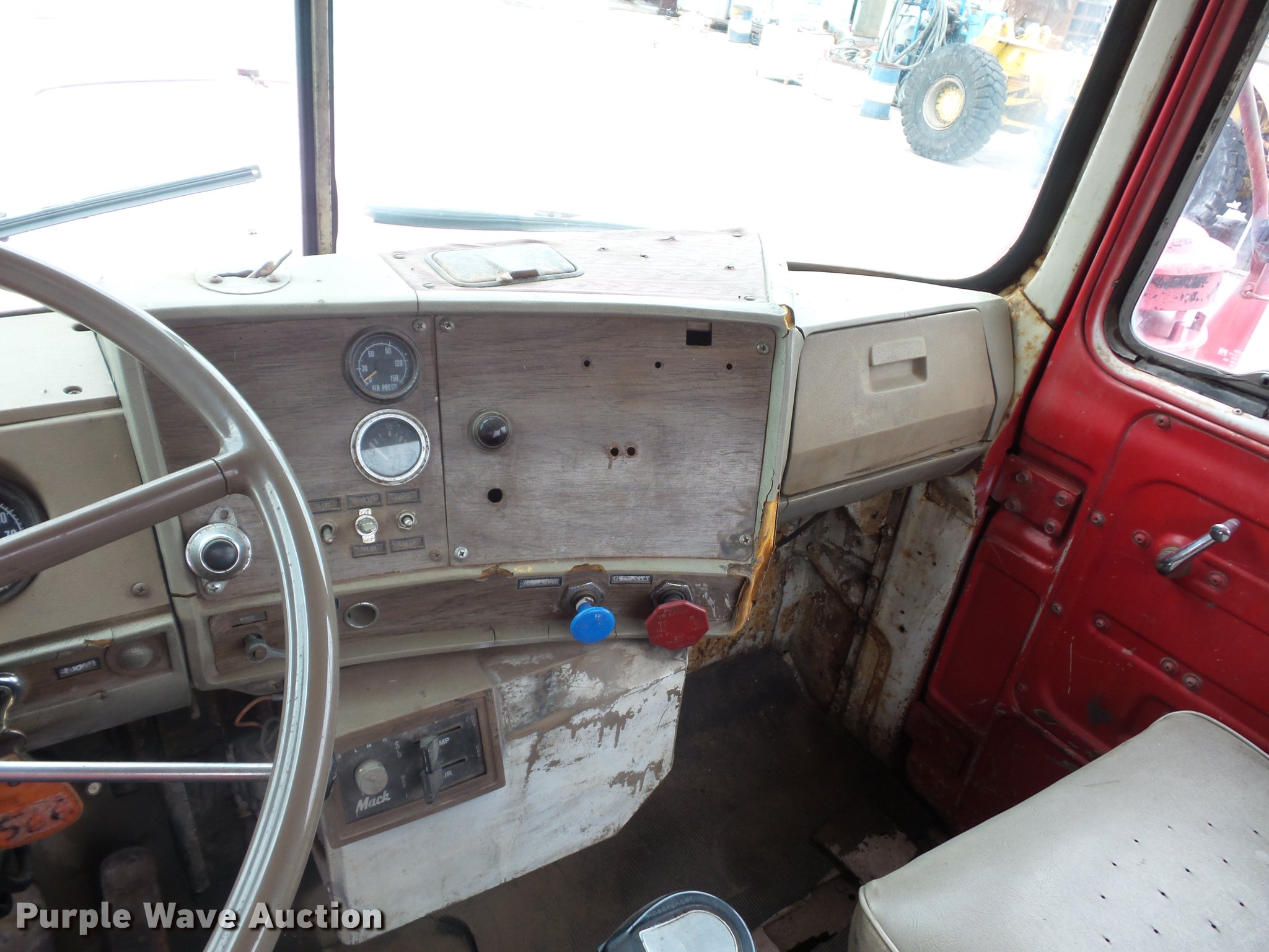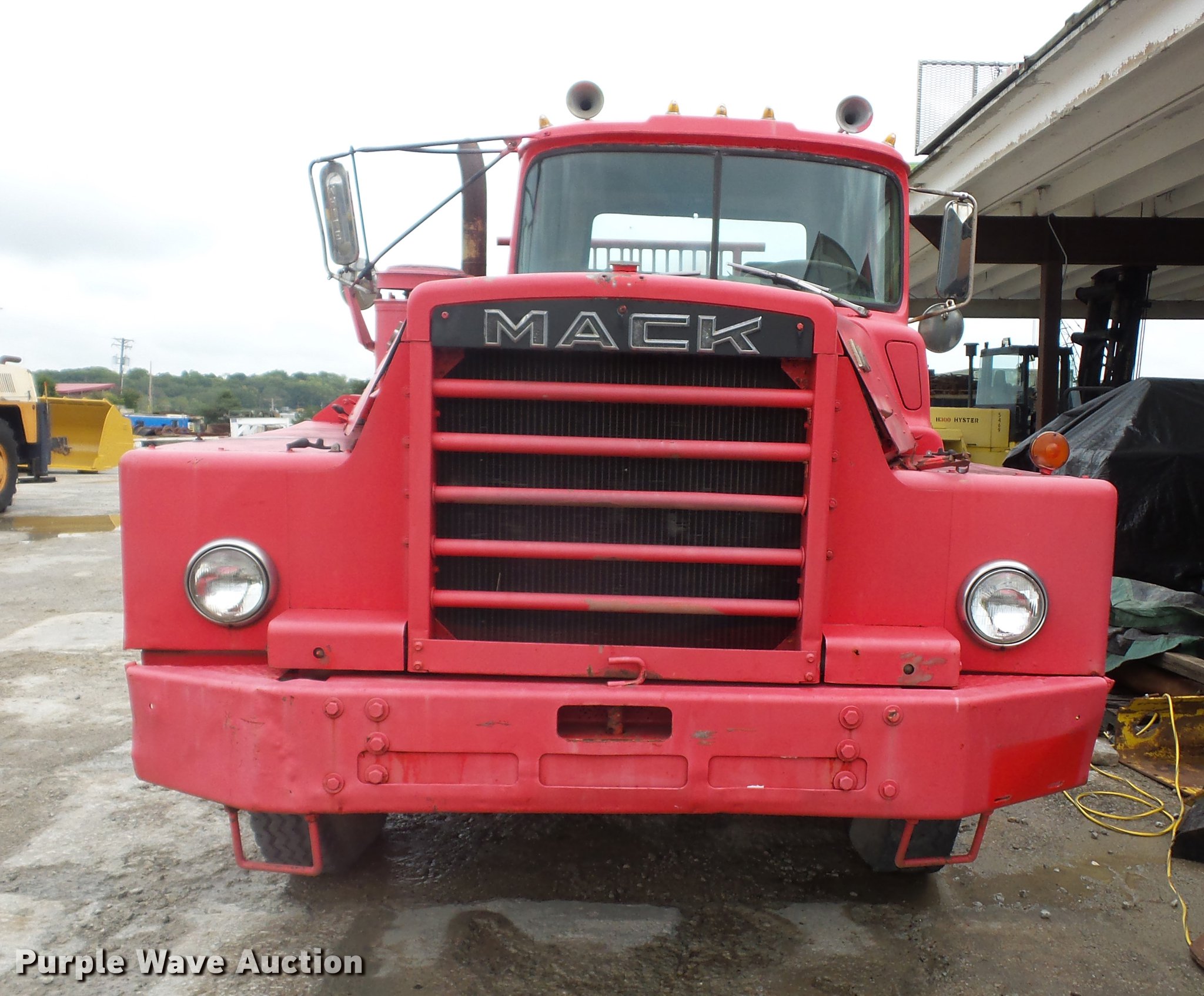 Purple Wave is selling a used Truck Chassis in Missouri. This item is a 1975 Mack semi truck with the following: 117,399 miles on odometer, Cummins six cylinder turbo diesel engine, 13 speed manual transmission, Tandem axle, Heat, PTO, Fifth wheel plate, Rear hydraulic winch, Camelback suspension, Air brakes, 12-24 tires