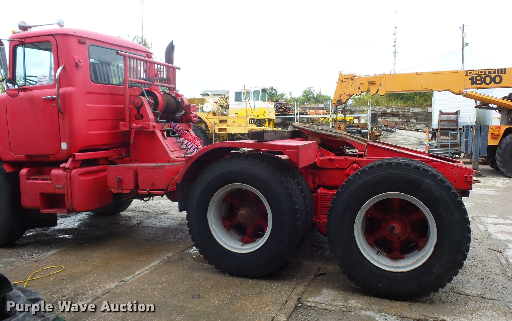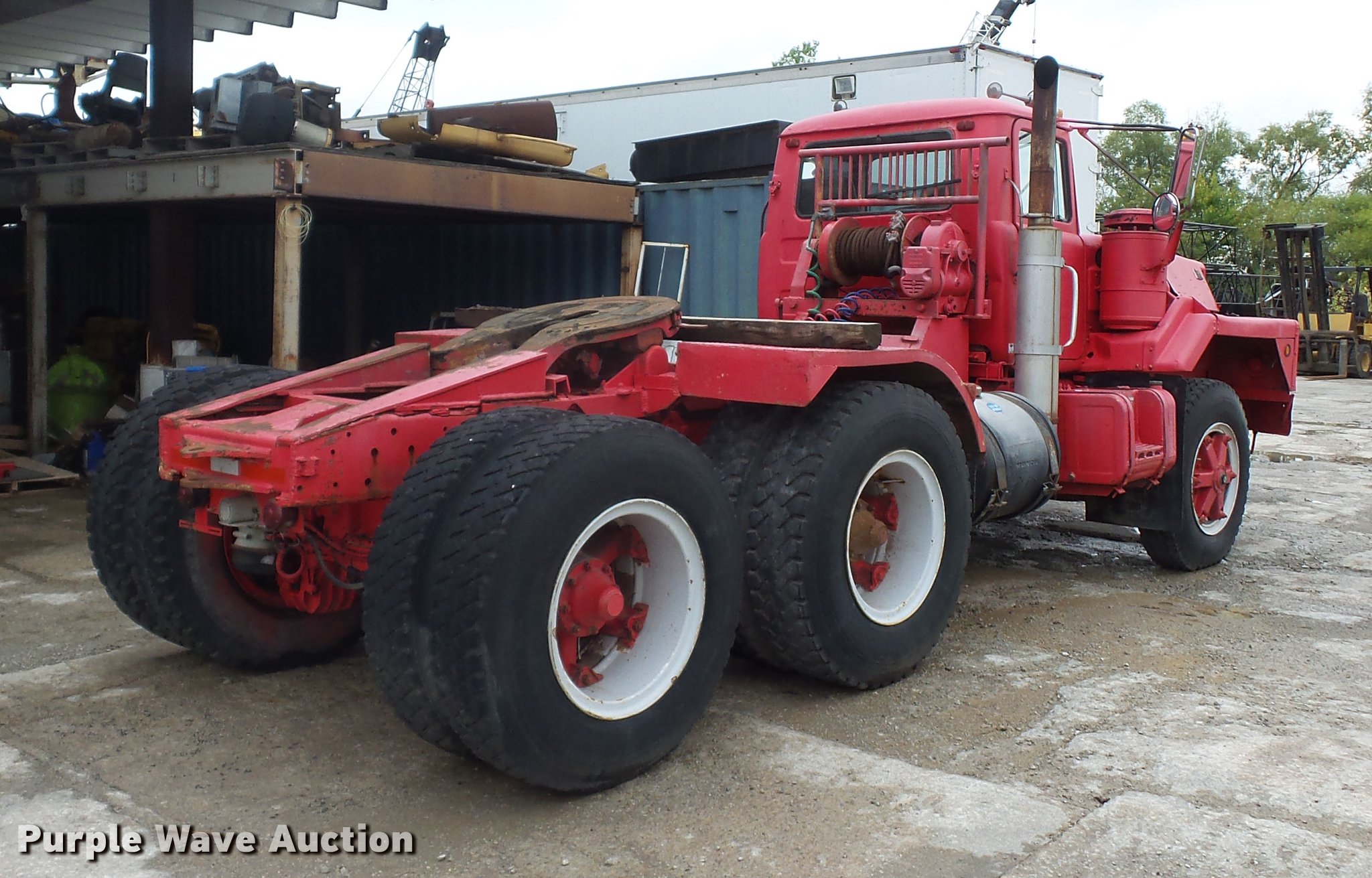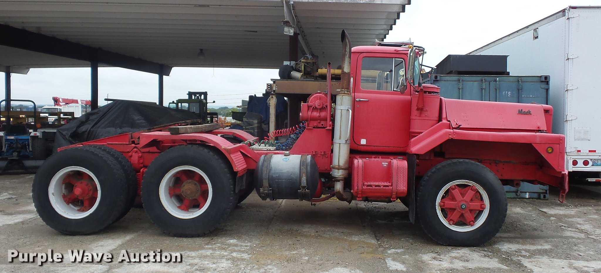 Purple Wave is selling a used Truck Chassis in Missouri. This item is a 1975 Mack semi truck with the following: 117,399 miles on odometer, Cummins six cylinder turbo diesel engine, 13 speed manual transmission, Tandem axle, Heat, PTO, Fifth wheel plate, Rear hydraulic winch, Camelback suspension, Air brakes, 12-24 tires