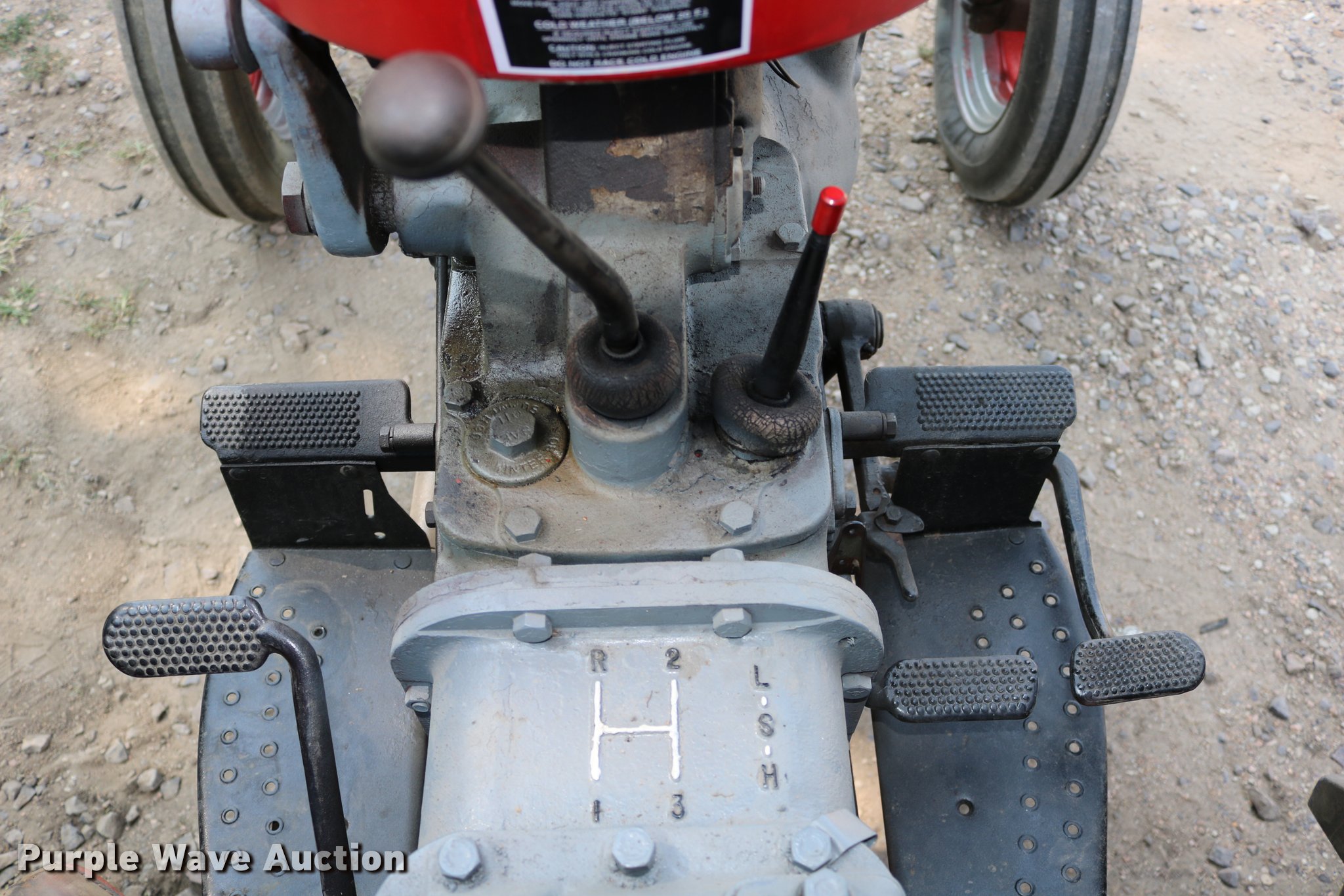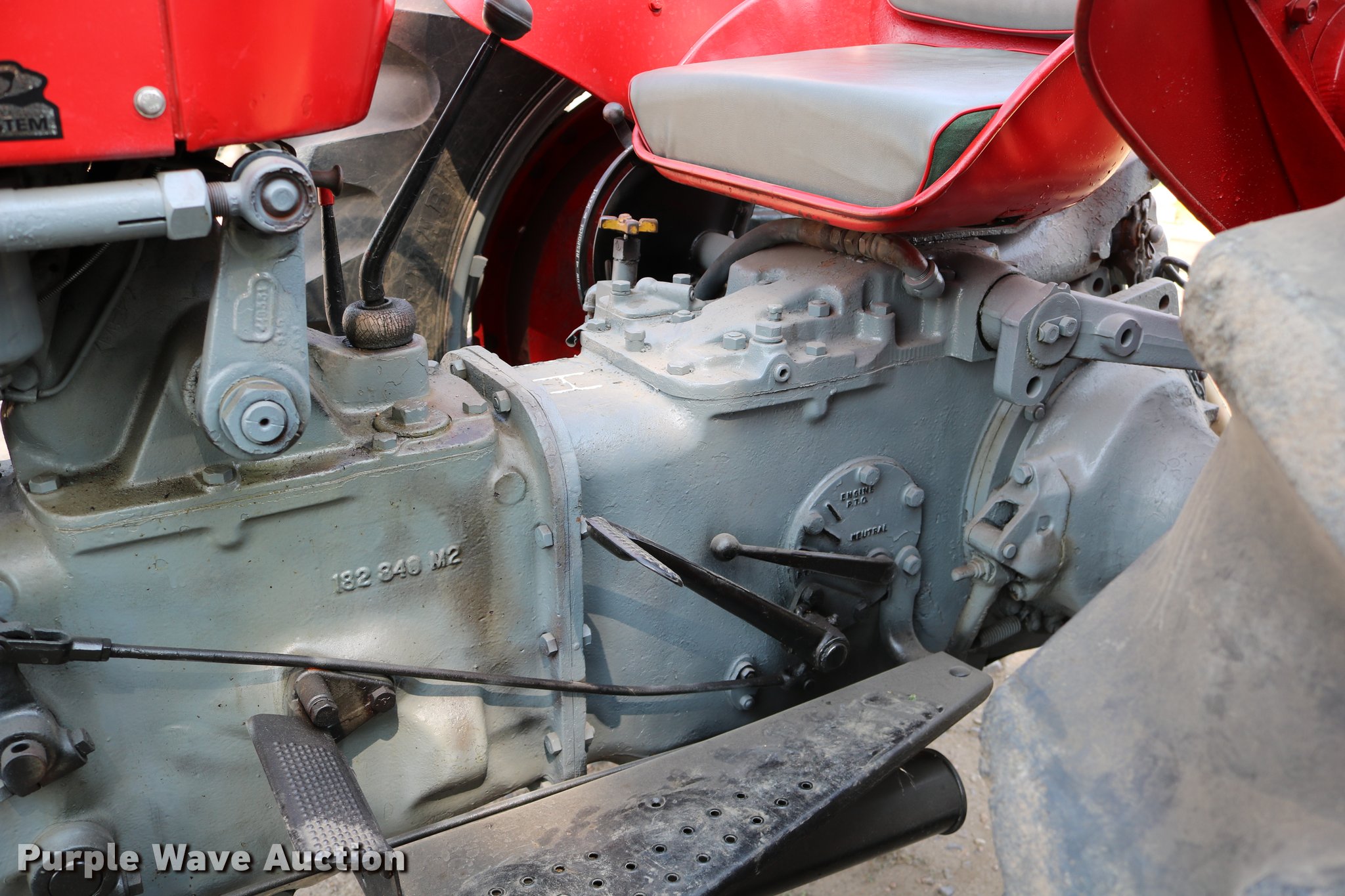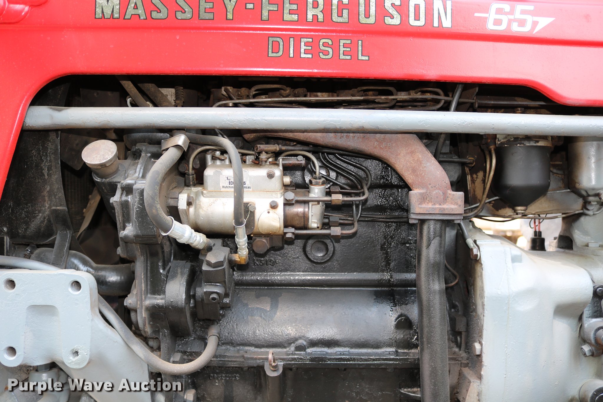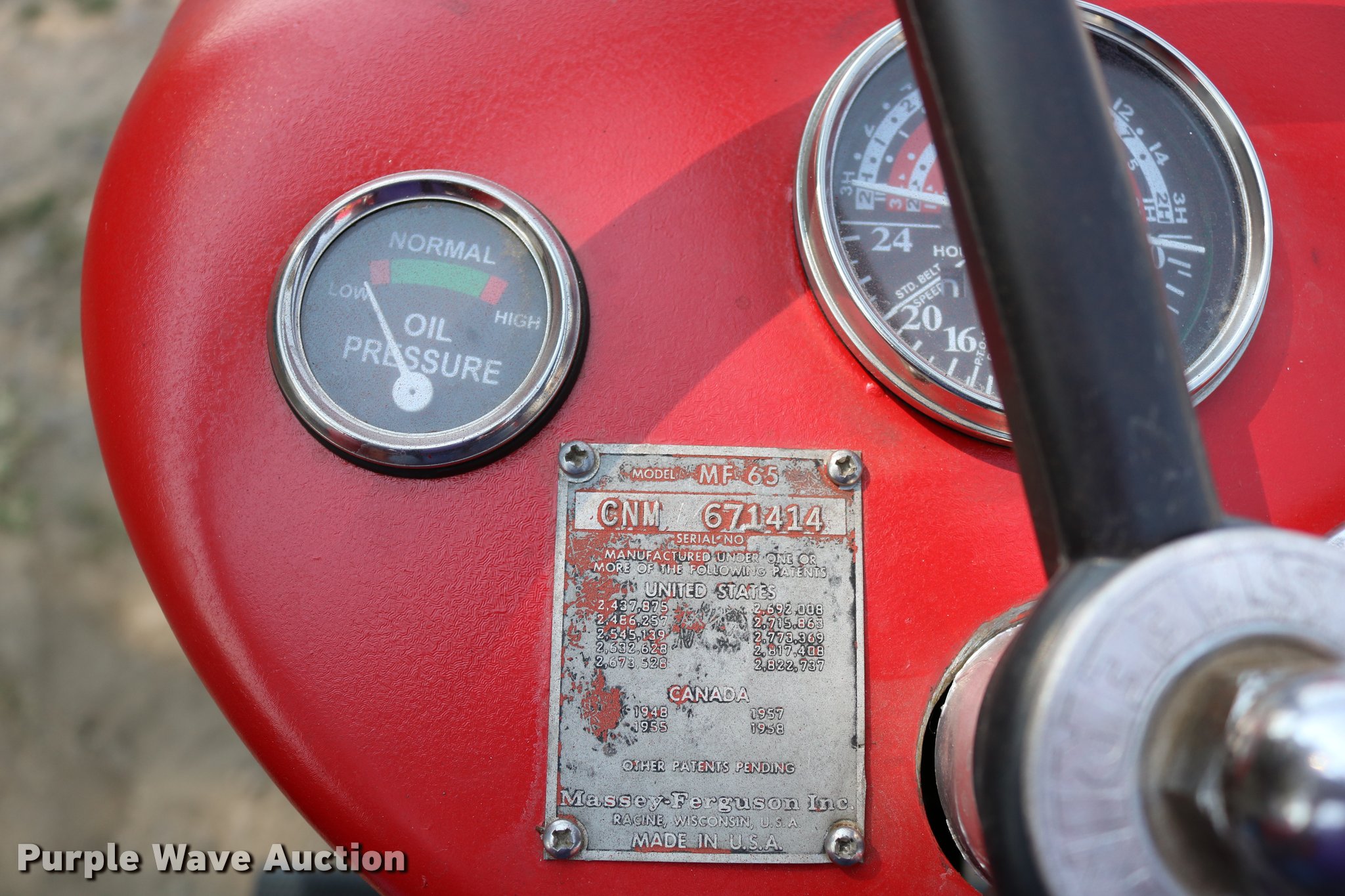 Purple Wave is selling a used Tractor in Kansas. This item is a 1965 Massey Fergusen MF-65 tractor with the following: Four cylinder diesel engine, Manual transmission, 6F-2R gears, Front and rear work lights, Rear lights inoperable, Three point, Top link, 540 PTO, Power steering, (1) rear hydraulic remote, 6.00-16 front tires, 15.5-38 rear tires, Serial CNM671414