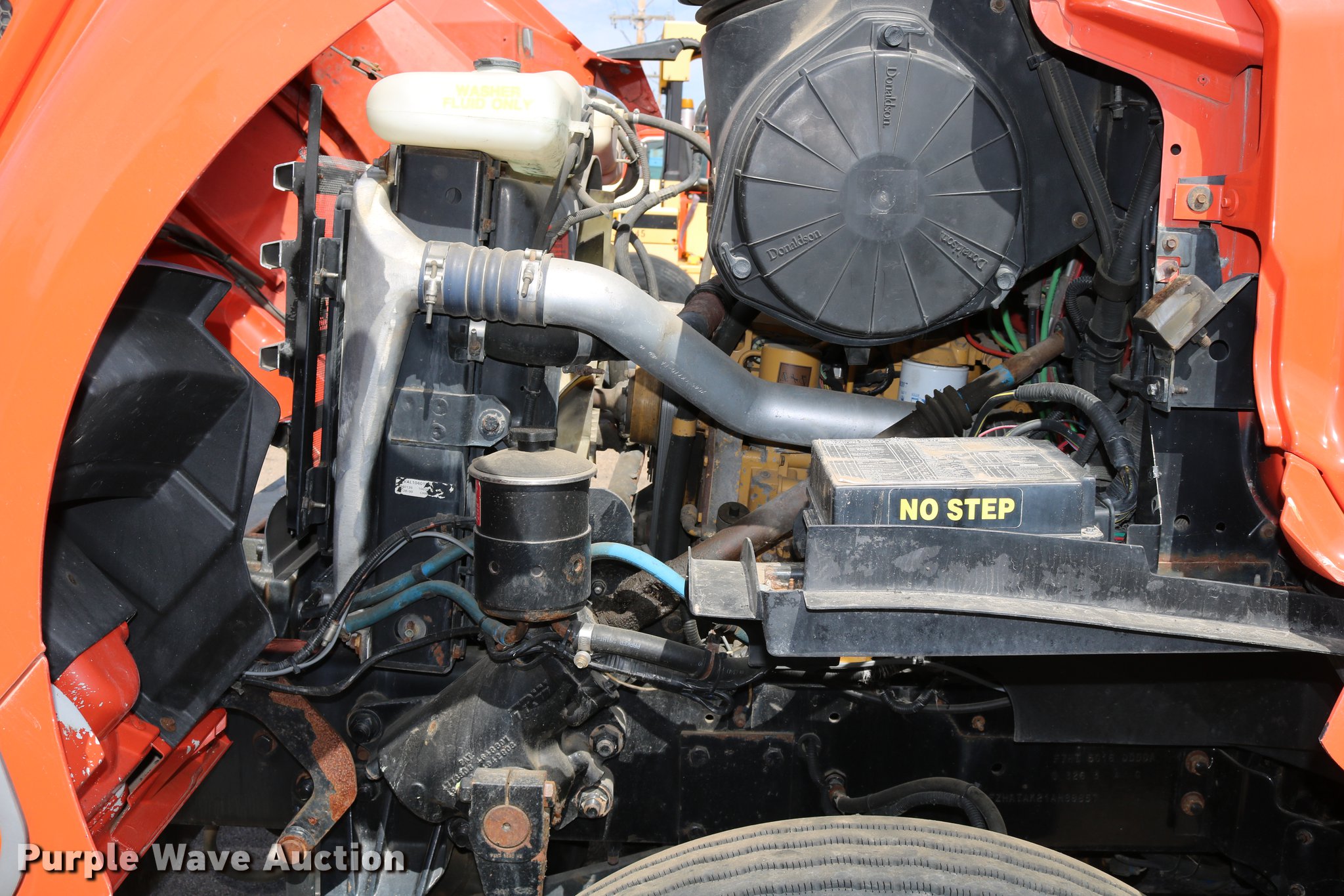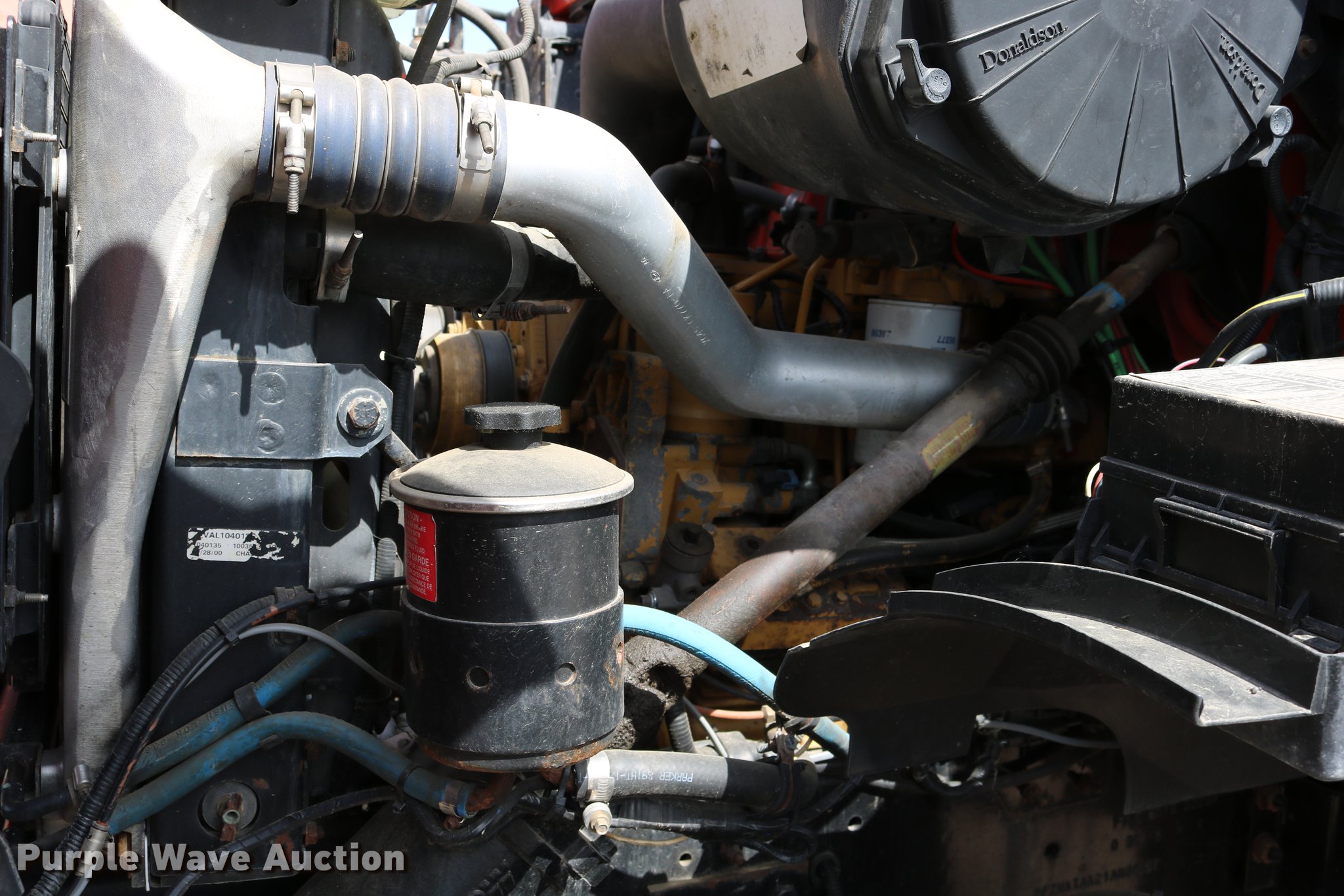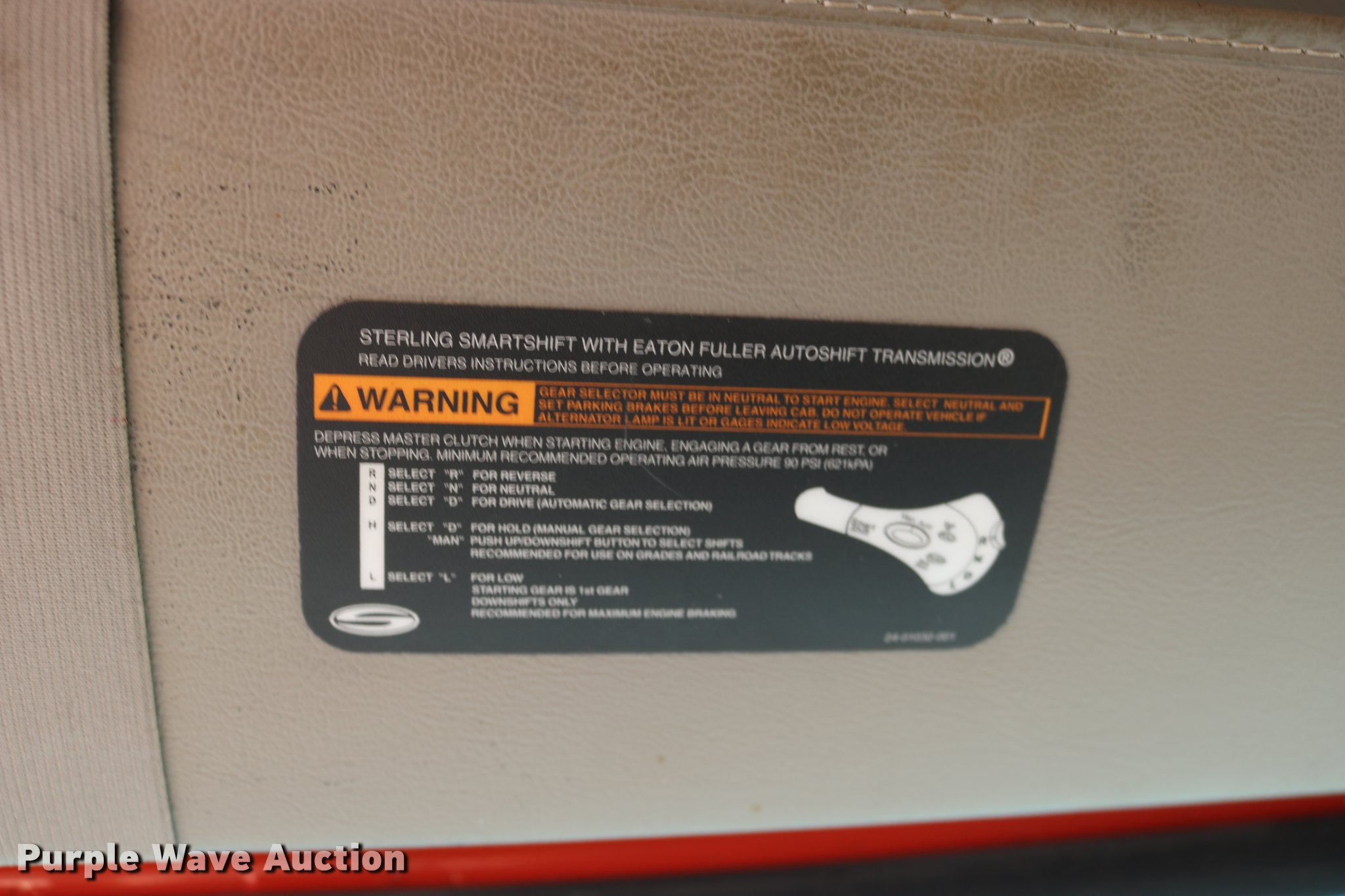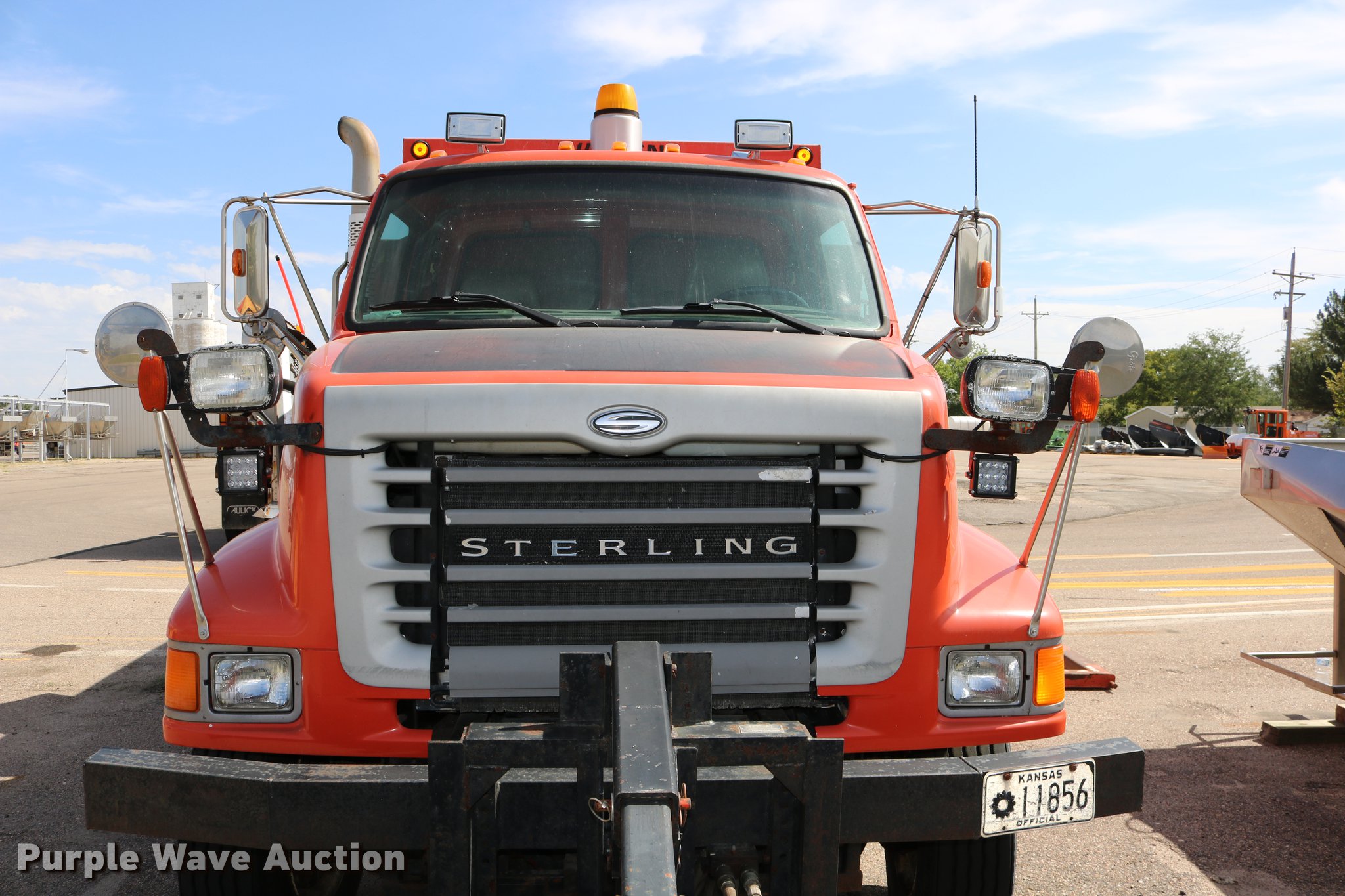 Purple Wave is selling a used Construction Dump Truck in Kansas. This item is a 2001 Sterling LT7501 dump truck with the following: 227,255 miles on odometer, 7,191 hours on meter, Caterpillar 3126 7.2L L6 turbo diesel engine, Eaton Fuller R-70 automatic transmission, Tandem axle, Inter-axle differential lock, AC and heat, Cruise, AM/FM, Heated mirrors, Air suspension seat, Block heater, Warren FL650-13 steel dump bed, 13'L x 96"W, 30" side height, 9/11 yd. capacity, Air operated end gate, Single ram hoist, Flink PF-910L2-1 11'W plow, Henke 8'W side wing plow, Warren spreader, Nine yd. capacity, Rear air hookups, Single fuel tank, Pintle hitch, Trailer wiring, Camelback suspension, Air brakes, Engine brake, 180" wheelbase, 275/80R22.5 tires, GVWR 53,200 lbs, FARW 13,200 lbs, IAWR 20,000 lbs, RAWR 20,000 lbs, Engine oil leak, Cracked bell housing plate, Coolant leak, Hoist cylinder and hydraulic leaks, KDOT ID 263-3290