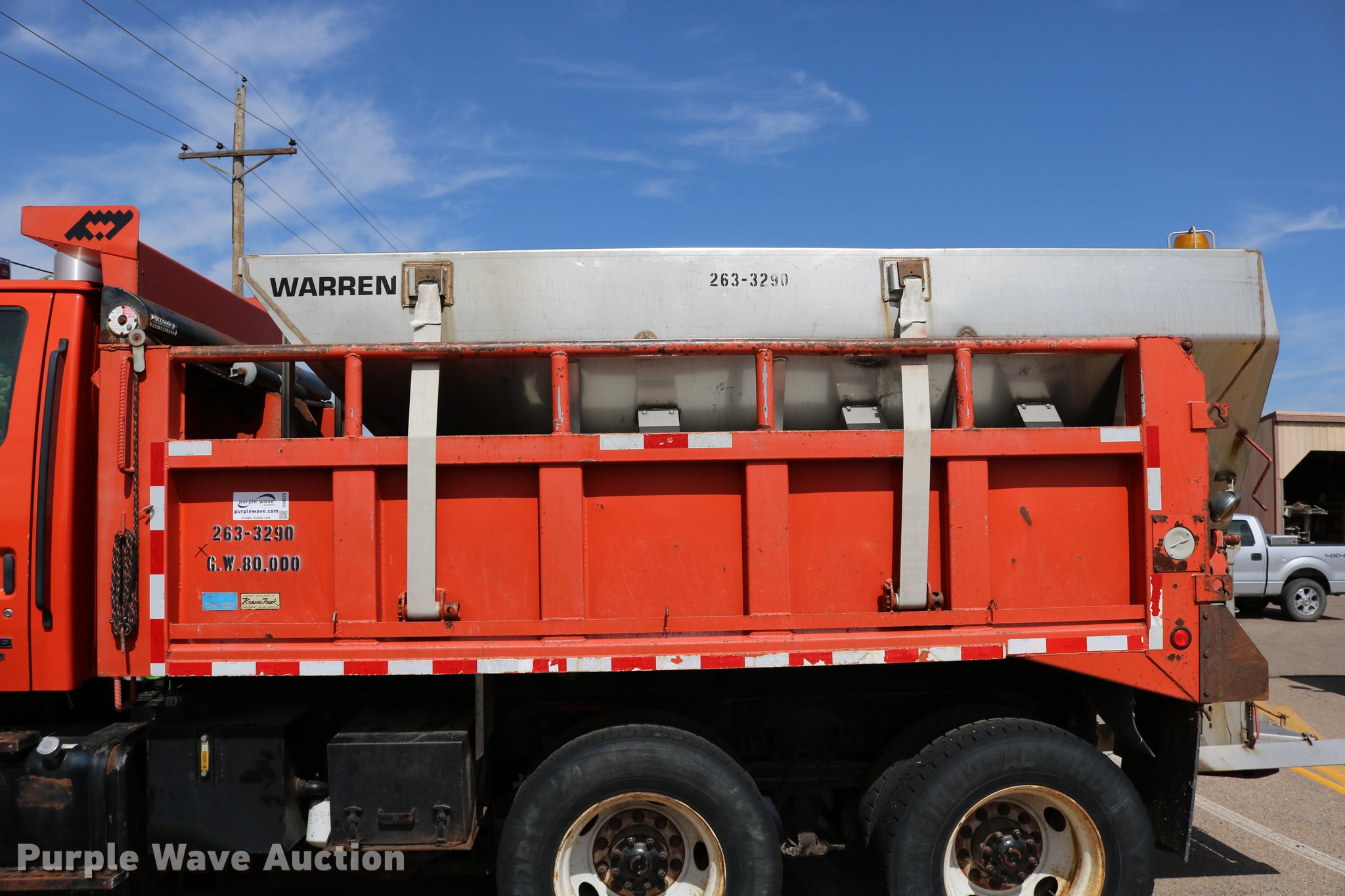 2001 Sterling LT7501 dump truck. 227,255 miles on odometer, 7,191 hours on meter, Caterpillar 3126 7.2L L6 turbo diesel engine, Eaton Fuller R-70 automatic transmission, Tandem axle, Inter-axle differential lock, AC and heat, Cruise, AM/FM, Heated mirrors, Air suspension seat, Block heater, Warren FL650-13 steel dump bed 13'L x 96"W, 30" side height, 9/11 yd. capacity, Air operated end gate, Single ram hoist, Flink PF-910L2-1 11'W plow, Henke 8'W side wing plow, Warren spreader Nine yd. capacity, Rear air hookups, Single fuel tank, Pintle hitch, Trailer wiring, Camelback suspension, Air brakes, Engine brake, 180" wheelbase, 275/80R22.5 tires, GVWR 53,200 lbs, FARW 13,200 lbs, IAWR 20,000 lbs, RAWR 20,000 lbs, Engine oil leak, Cracked bell housing plate, Coolant leak, Hoist cylinder and hydraulic leaks, KDOT ID 263-3290. Kansas title. Titles will be distributed after confirmation of payment and removal. 2FZHATAK21AH88857. Kansas Department of Transportation - Norton. 312 S 2nd Ave. Norton, KS 67654