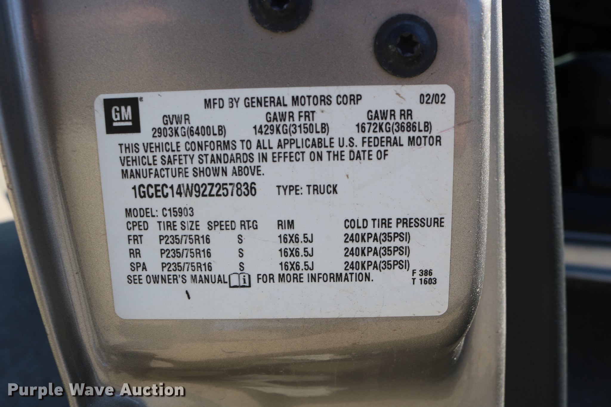 Purple Wave is selling a used 1/2 Ton Pickup or Van in Kansas. This item is a 2002 Chevrolet Silverado 1500 pickup truck with the following: 198,356 miles on odometer, 4.3L V6 OHV 12V gas engine, Automatic transmission, AC and heat, Tilt, Cruise, AM/FM, Manual windows and locks, Cloth interior, Cross bed toolbox, Receiver hitch, Trailer wiring, 235/75R16 tires, Battery weak, Steering system needs repair, Hood hinges need repair, Tailgate latch needs repair, Parking brake needs repair, KDOT ID 052-2192