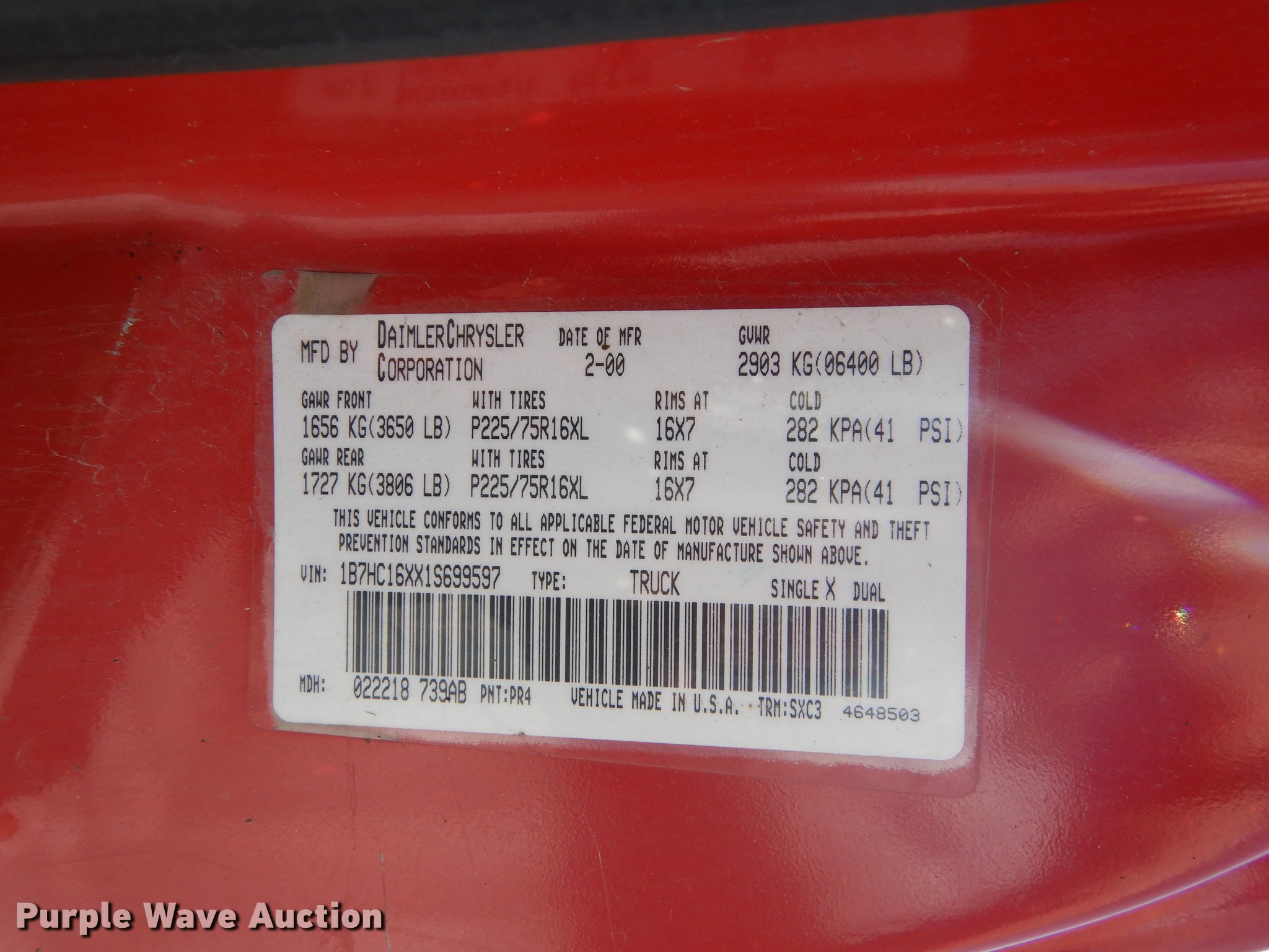 Purple Wave is selling a used 1/2 Ton Pickup or Van in Kansas. This item is a 2001 Dodge Ram 1500 pickup truck with the following: 126,980 miles on odometer, 3.9L V6 OHV 12V gas engine, Automatic transmission, AC and heat, Tilt, Cruise, AM/FM/cassette, Manual windows and locks, Vinyl interior, Toolbox, 235/75R16 tires, Battery dead, One tire flat, Headliner damage, Clear coat peeling, KDOT ID 051-1280
