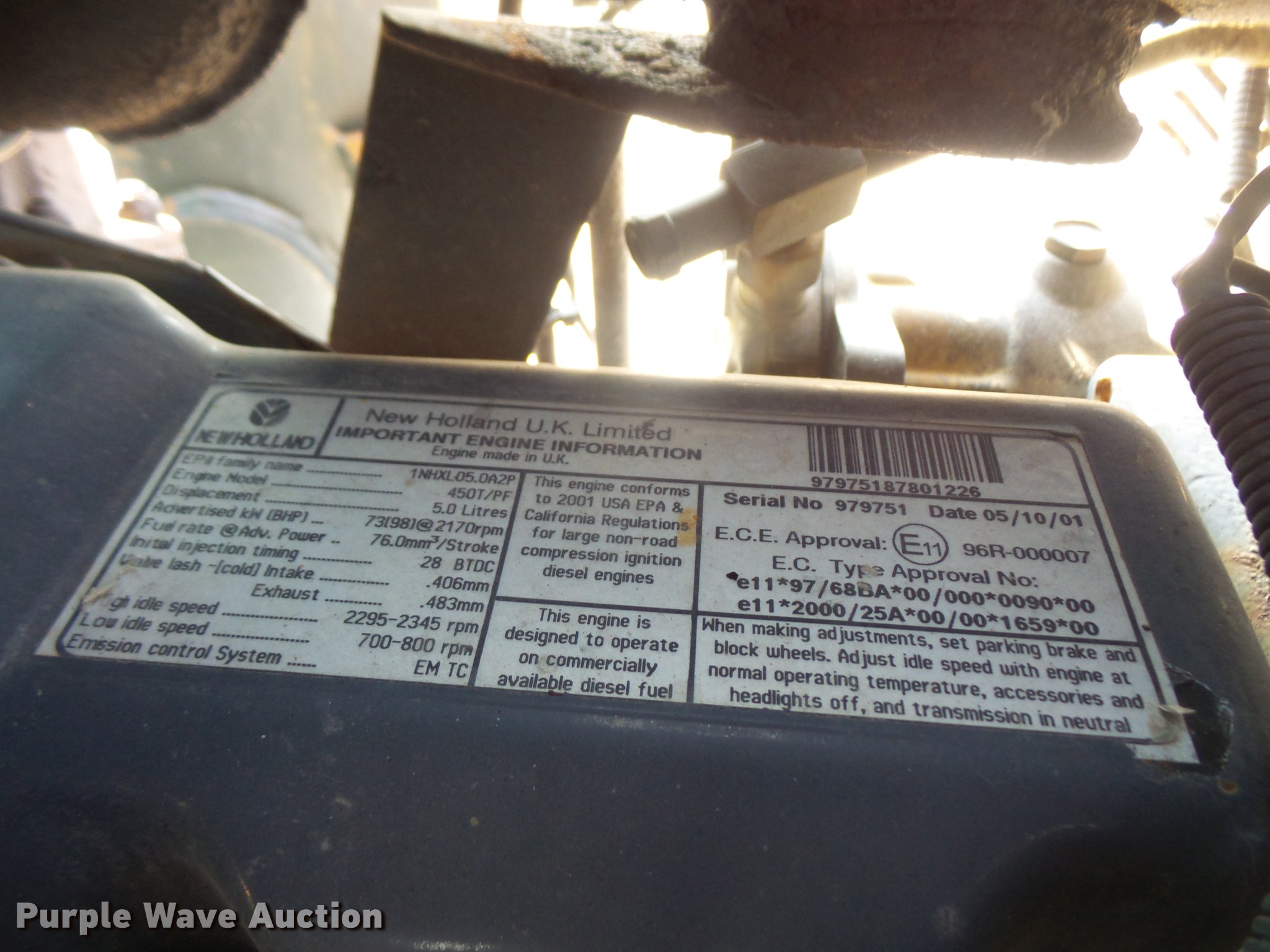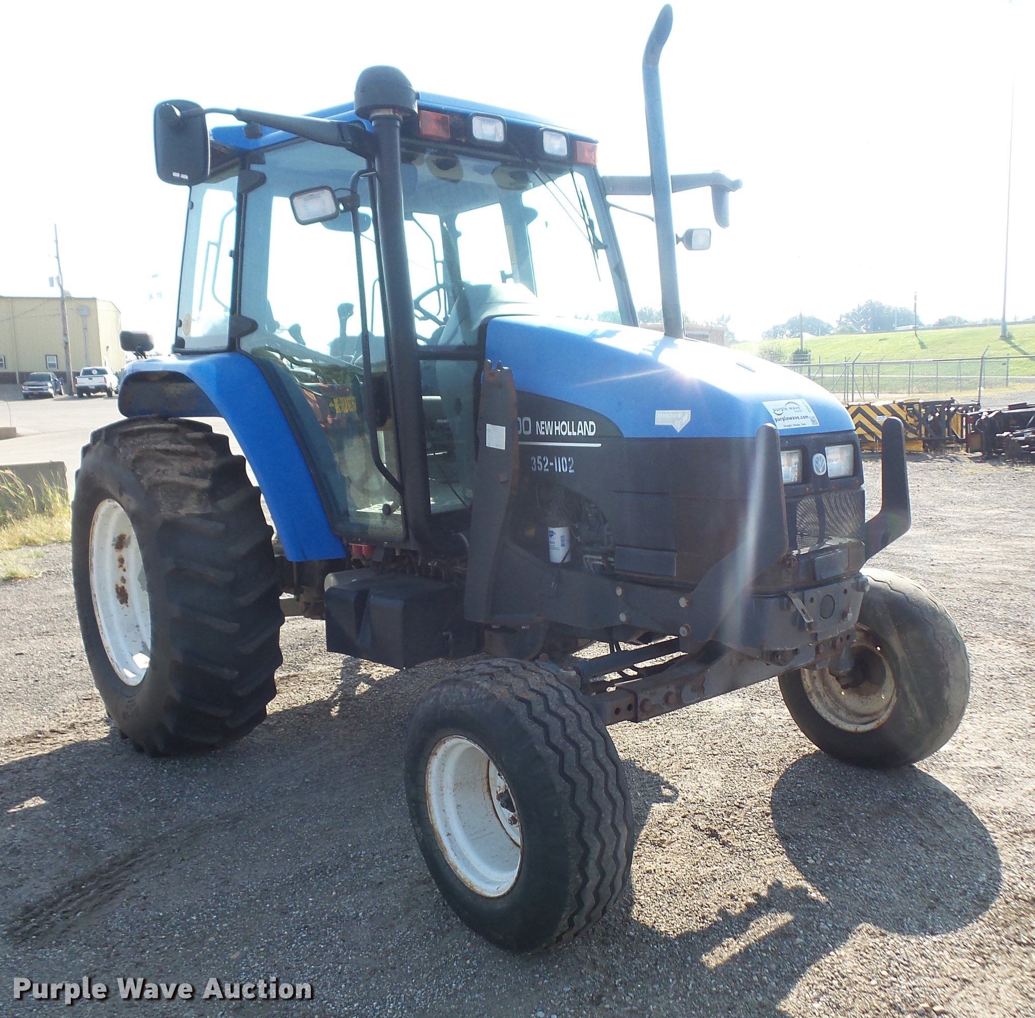Purple Wave is selling a used Tractor in Kansas. This item is a 2002 New Holland TS100 tractor with the following: 3,872 hours on meter, New Holland 450T/PF 5.0L four cylinder turbo diesel engine, 98 HP, Dual Command transmission, 24F-24R gears, AC and heat, AM/FM, Spring suspension seat, Tilt steering wheel, Visors, Quicke Q750 loader, 72"W bucket, Quick attach, Joystick control, Three point, 1000 PTO, Seven pin outlet, (4) rear hydraulic remote sets, 11L-16 front tires, 18.4-30 rear tires, Battery dead, Transmission shifter loose, Unit will start in gear with push button, Serial 618120, KDOT ID 352-1102