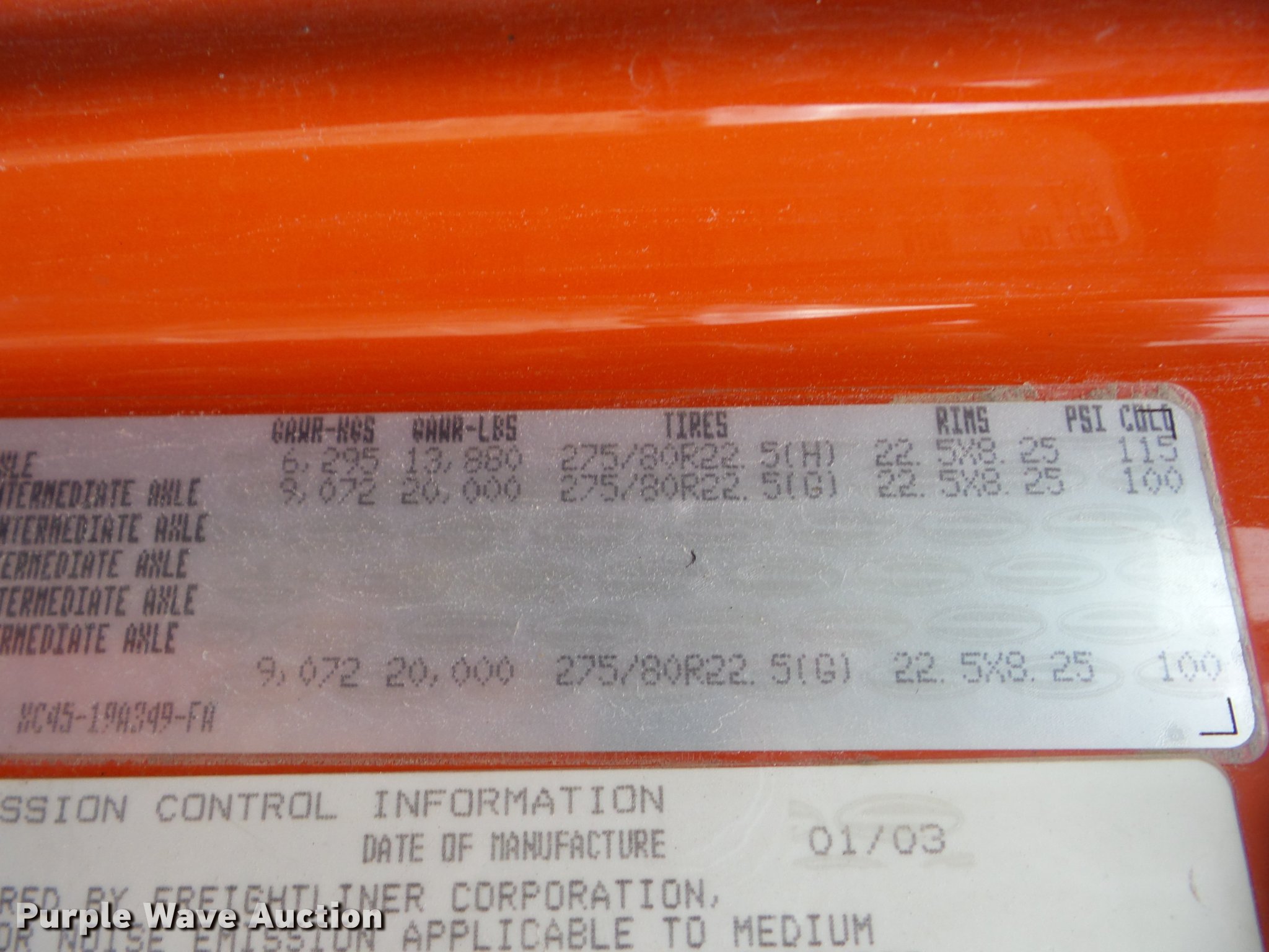 Purple Wave is selling a used Construction Dump Truck in Kansas. This item is a 2003 Sterling LT7500 dump truck with the following: 191,686 miles on odometer, Caterpillar 3126 7.2L L6 turbo diesel engine, Allison automatic transmission, Tandem axle, Inter-axle differential lock, AC and heat, AM/FM/weatherband, Heated mirrors, Air suspension seat, Front mounted PTO, 13'L x 96"W steel dump bed, 31" side height, 9" side board height, 9 yd. capacity, Air operated end gate, Single ram hoist, Monroe 11'W plow, Monroe stainless steel spreader, Pintle hitch, Walking beam suspension, Air brakes, 275/80R22.5 tires, GVWR 53,880 lbs, FAWR 13,880 lbs, IAWR 20,000 lbs, RAWR 20,000 lbs, Non-operational blade and bed, possible electrical issues, Rear suspension cracked, Brakes need to be replaced, Engine oil leak at front cover, KDOT ID 263-4072