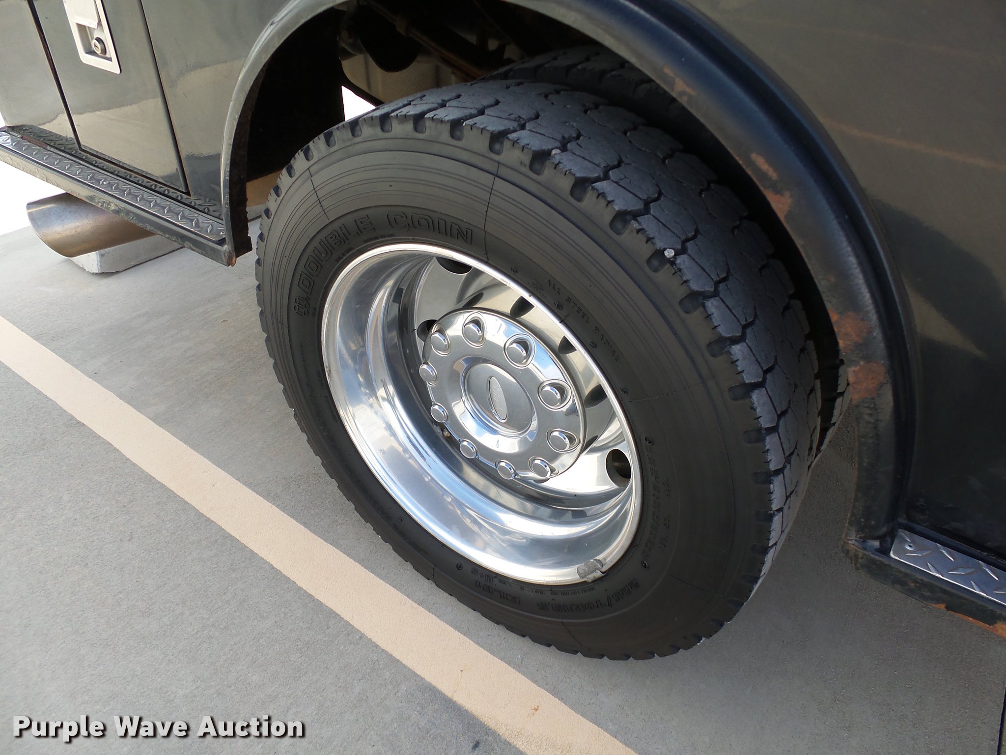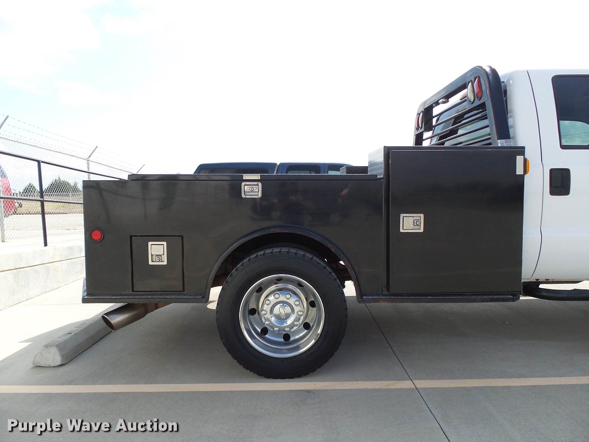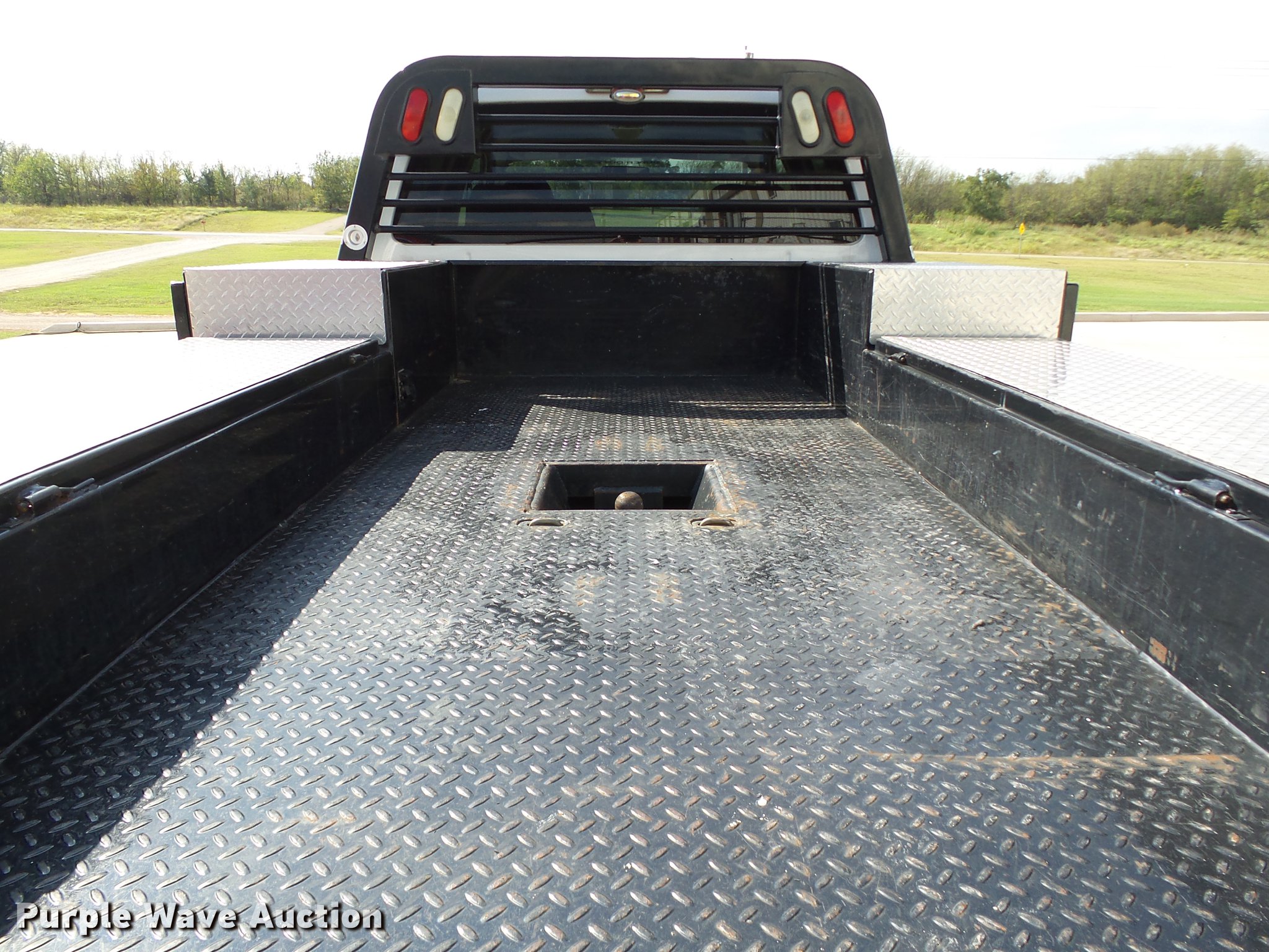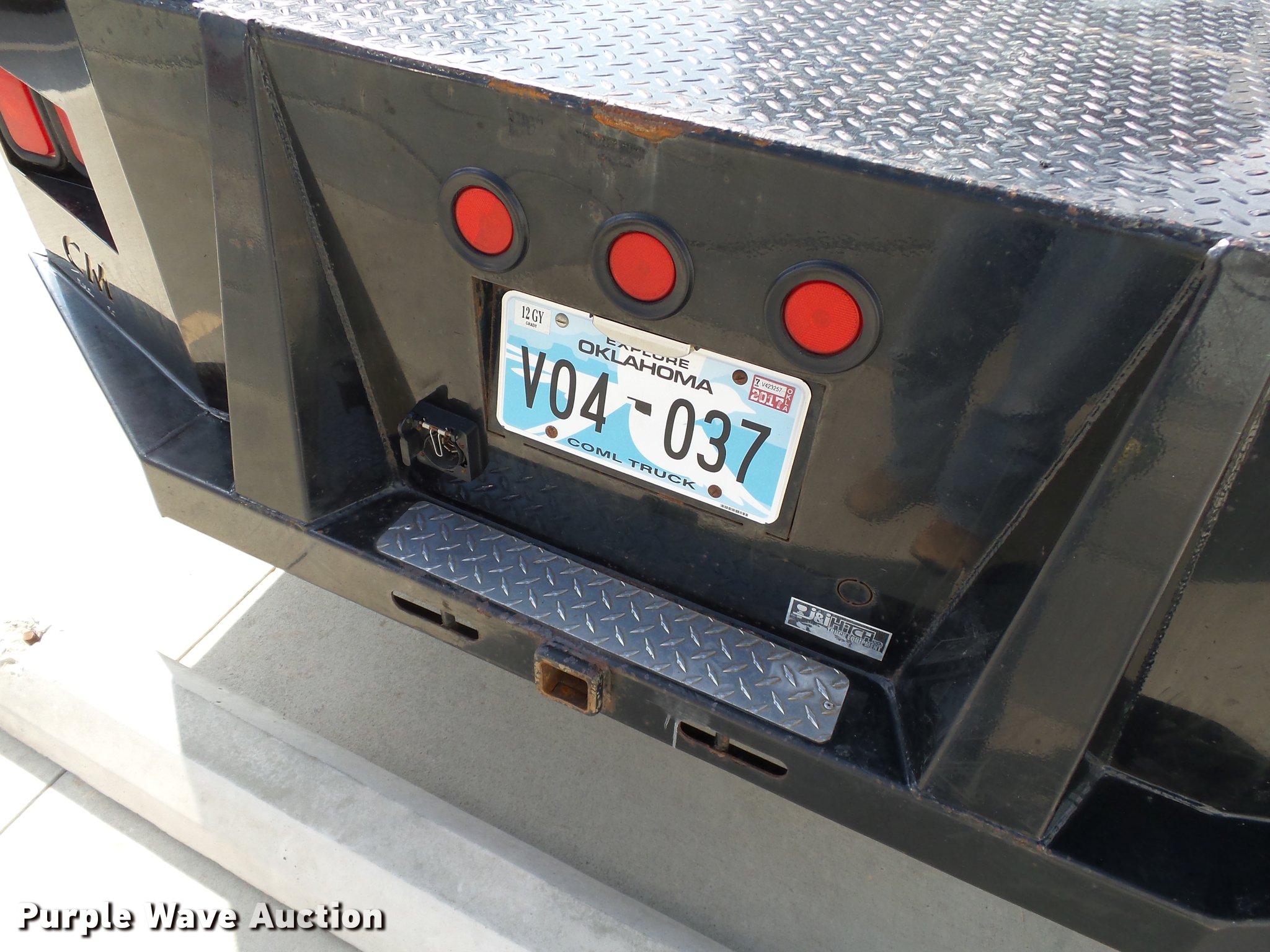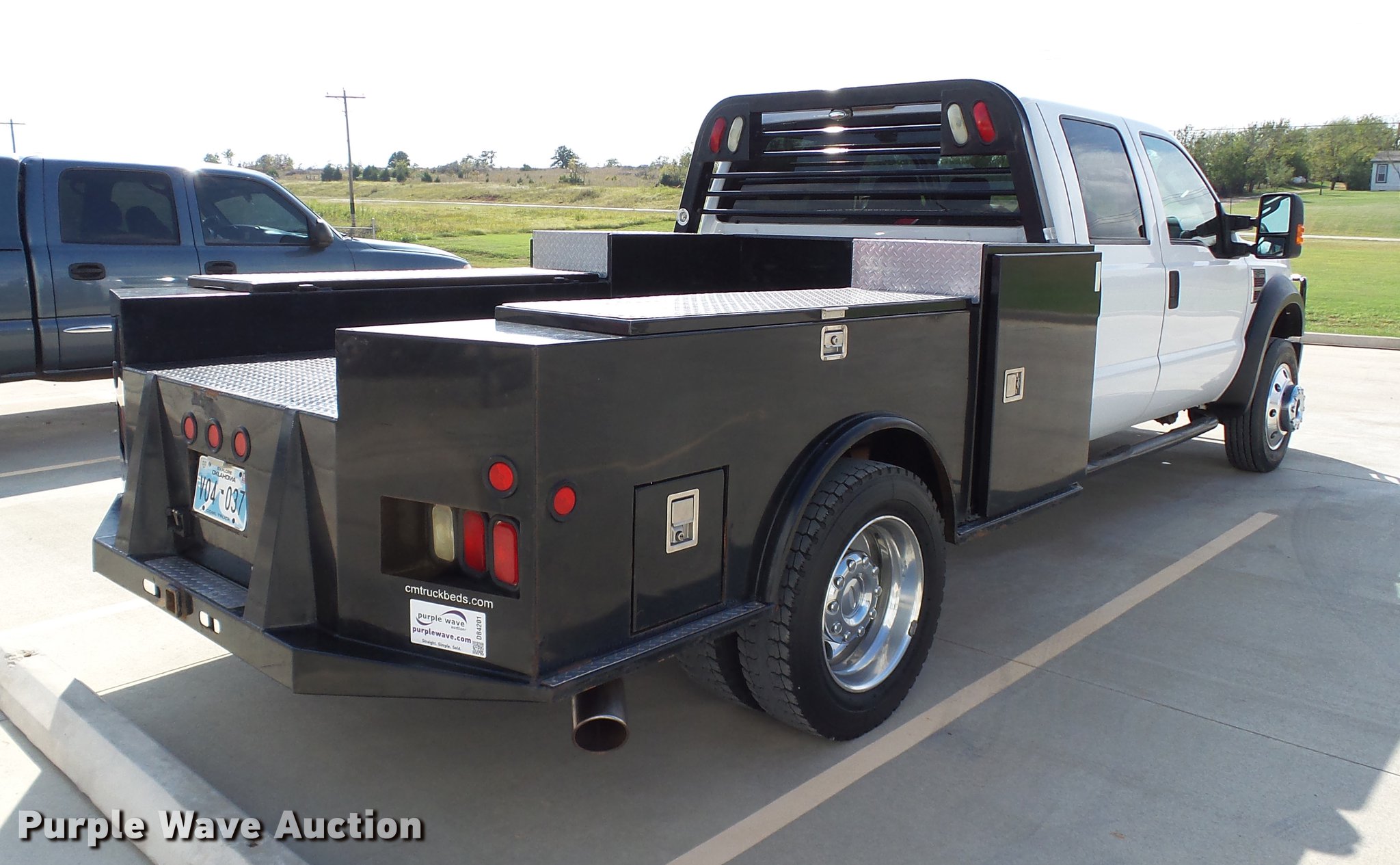Purple Wave is selling a used Flat Bed Truck in Oklahoma. This item is a 2009 Ford F450 Super Duty XLT Crew Cab flatbed truck with the following: 90,217 miles on odometer, 6.4L V8 OHV 32V turbo diesel engine, Automatic transmission, Four wheel drive, Single axle, AC and heat, AM/FM/CD, Power windows, locks, and seats, Adjustable foot pedals, Auxiliary controls, Brake controller, Front tow hooks, Running boards, Ranch Hand grill guard, CM steel flatbed, 10'L x 90"W overall, 48"W deck, Storage boxes, Toolboxes, Gooseneck ball, Single fuel tank, Receiver hitch, Trailer wiring, Spring suspension, Hydraulic brakes, 225/70R19.5 tires, GVWR 16,500 lbs