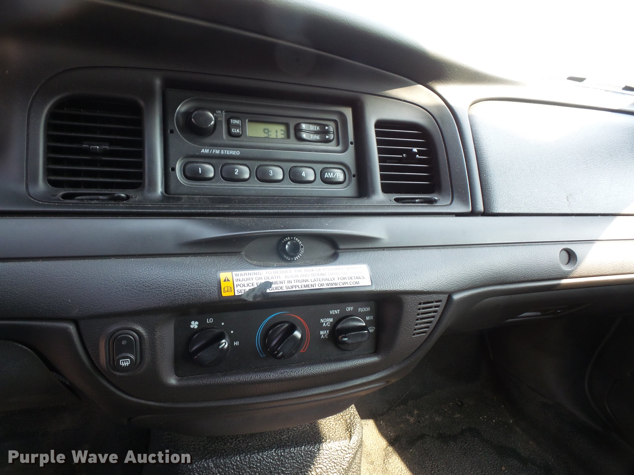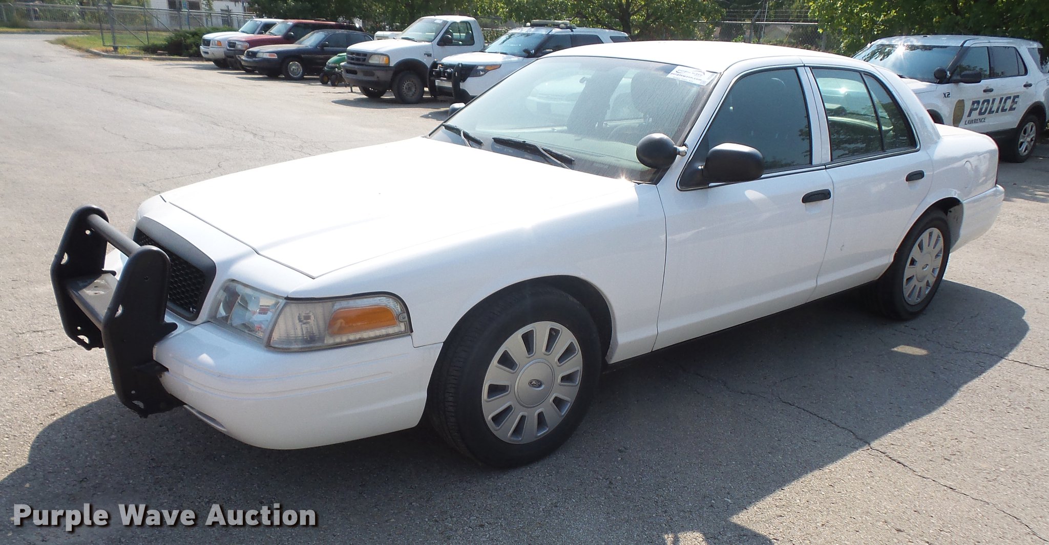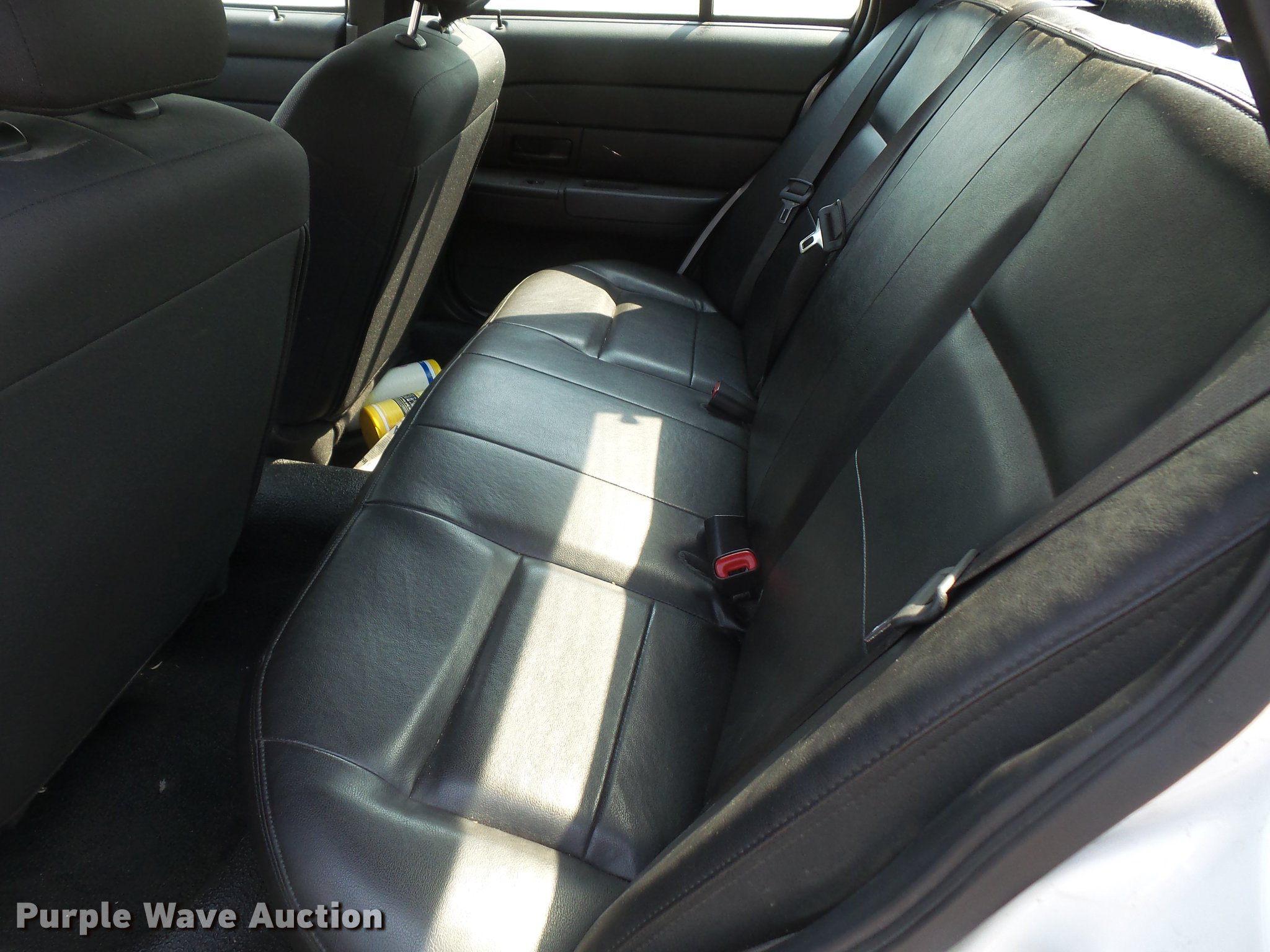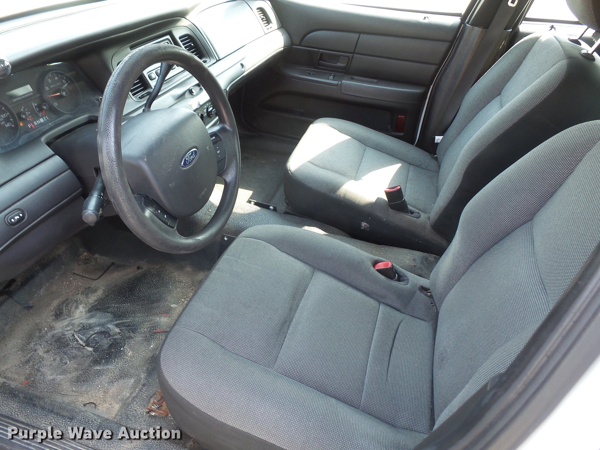 Purple Wave is selling a used Passenger Vehicle in Kansas. This item is a 2011 Ford Crown Victoria Police Interceptor with the following: 94,615 miles on odometer, 4.6L V8 SOHC 16V FFV gas engine, Automatic transmission, AC and heat, Tilt, Cruise, AM/FM, Power windows, locks, and mirrors, Cloth front interior, Vinyl rear interior, Spotlight, Grill guard, 235/55R17 tires, Unit# 120